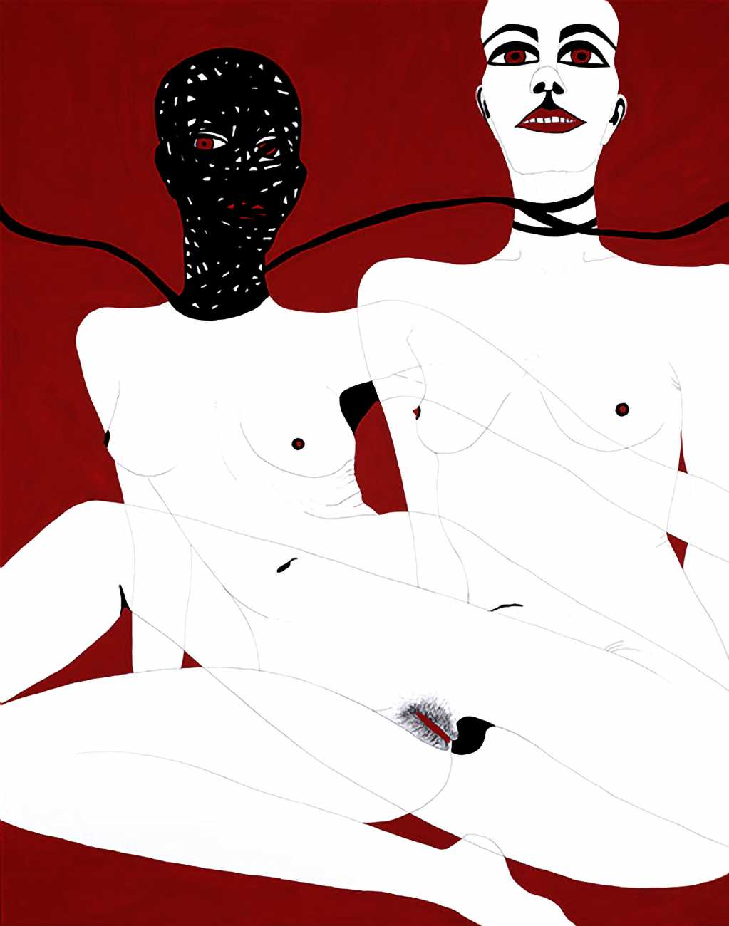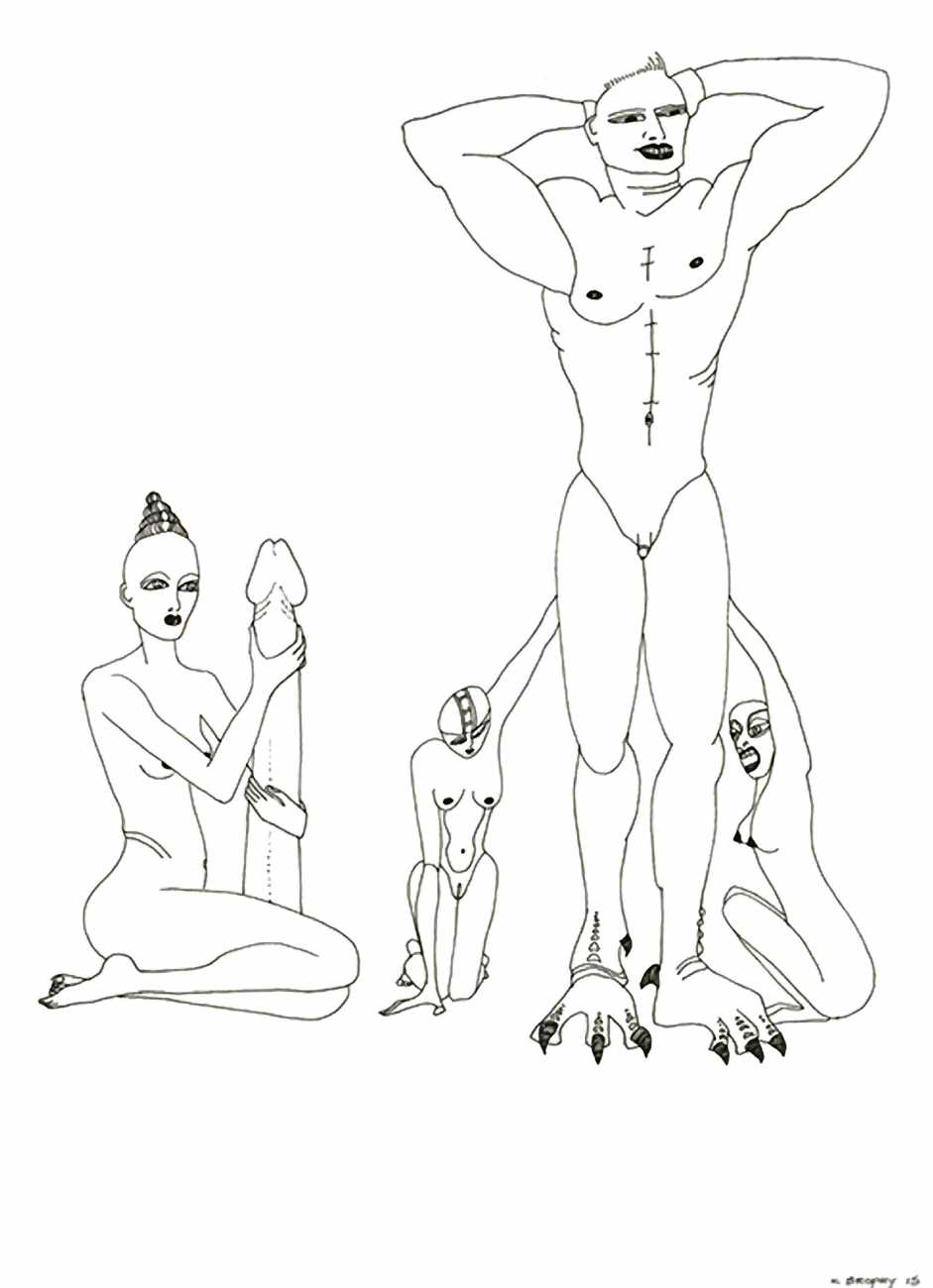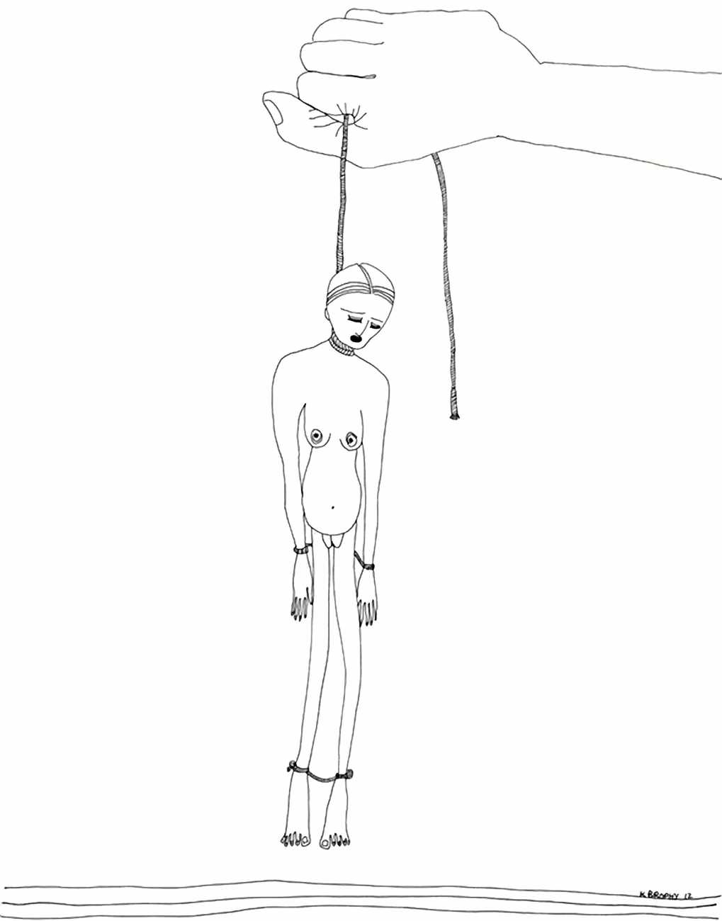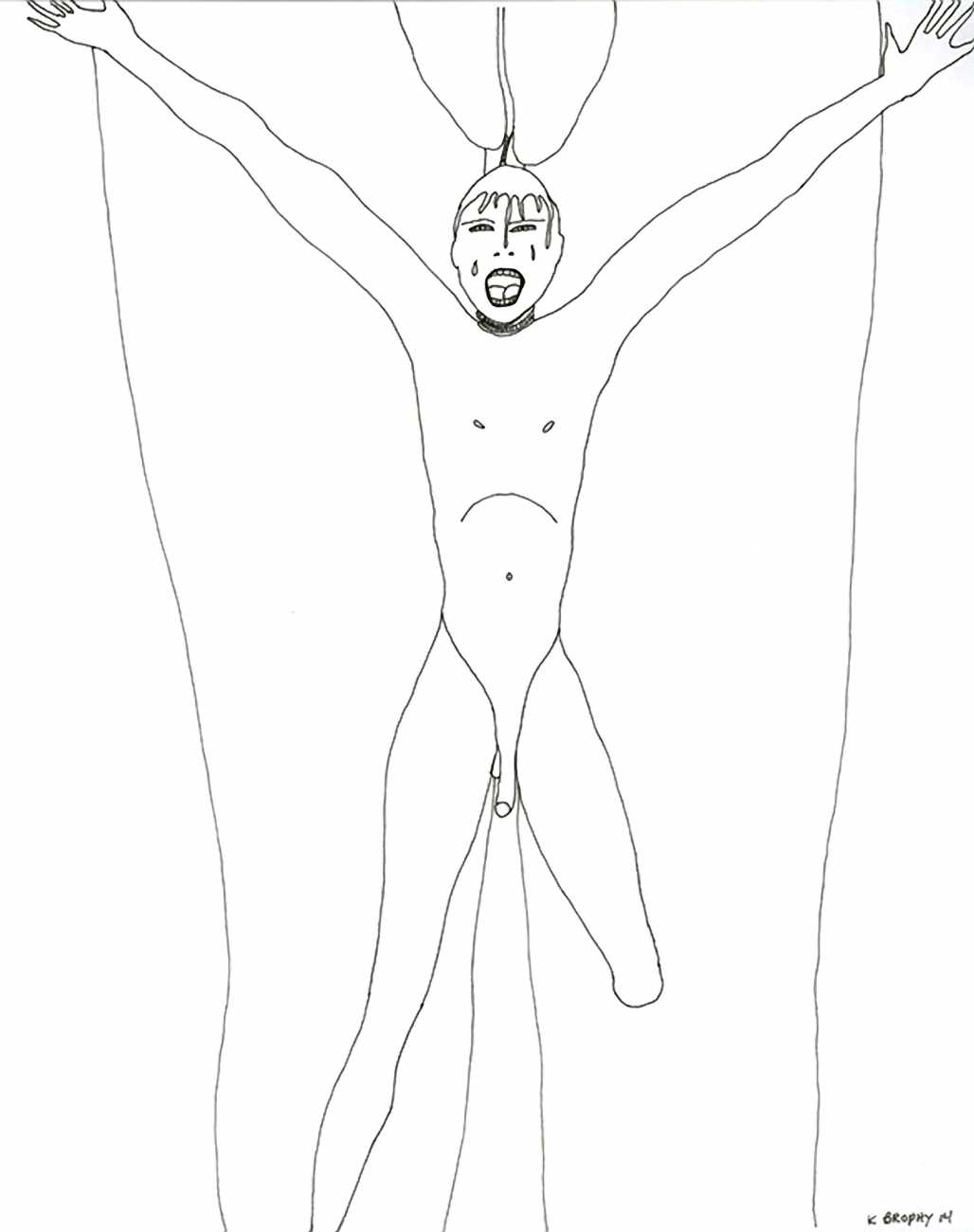 Most of Kitty Brophy’s works on paper are no bigger than sketchbook pages, yet each packs a punch. Her palette is spartan – nothing but midnight black, blinding white and blood red. The people in her pictures wear nothing at all, except on occasion a leather mask or a noose. Most are close-ups, with limbs extending past the paper’s edges. Some depict individual figures in extreme and extremely vulnerable positions. Others show multiple figures, their torsos tangled together or stacked in stylised patterns. Genitals claim centre stage.