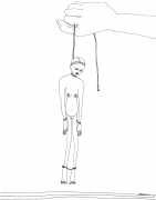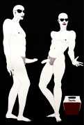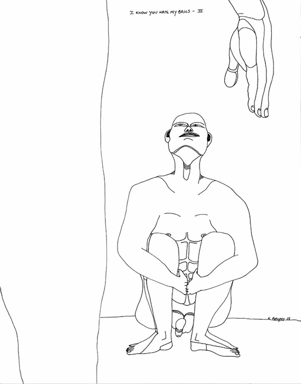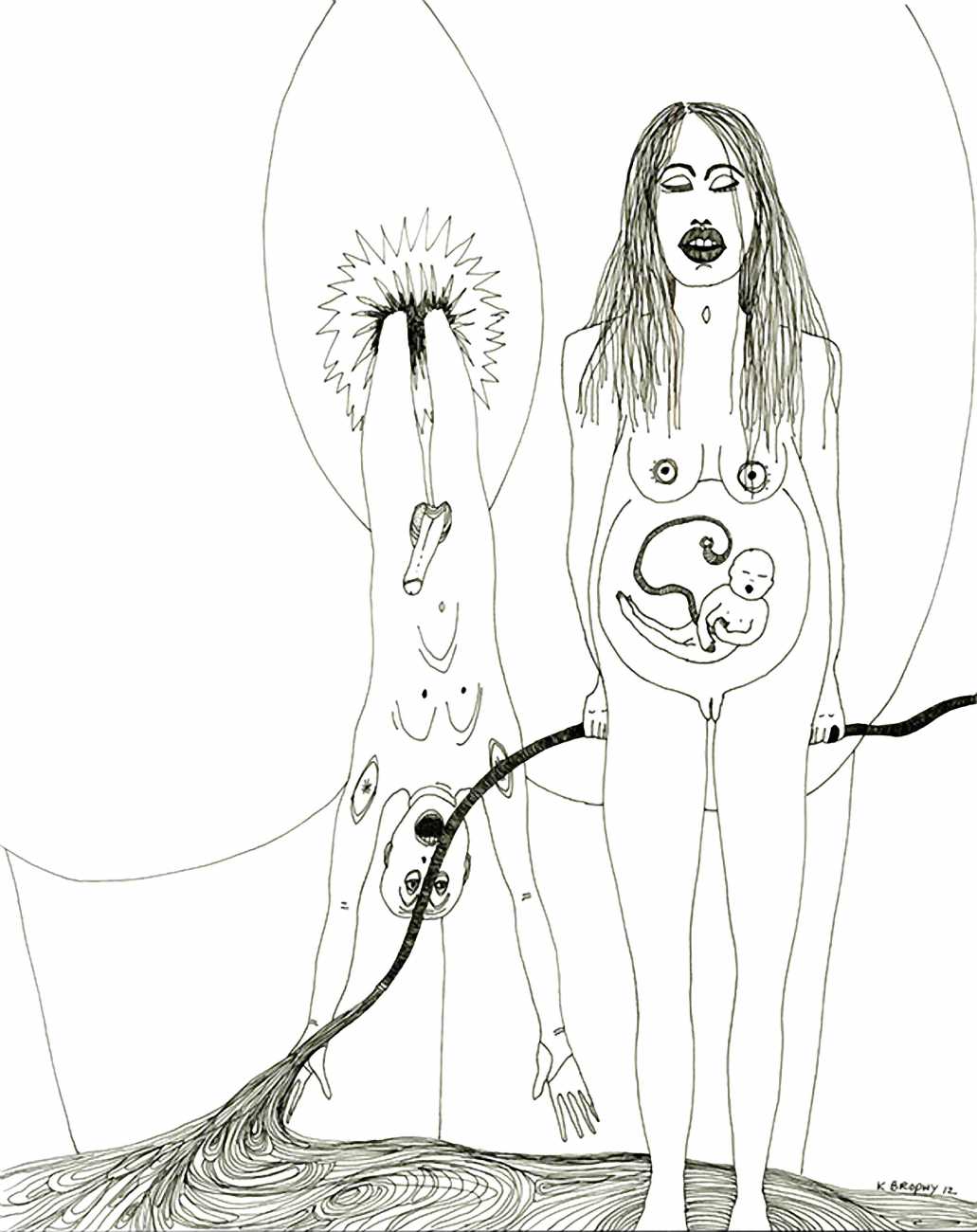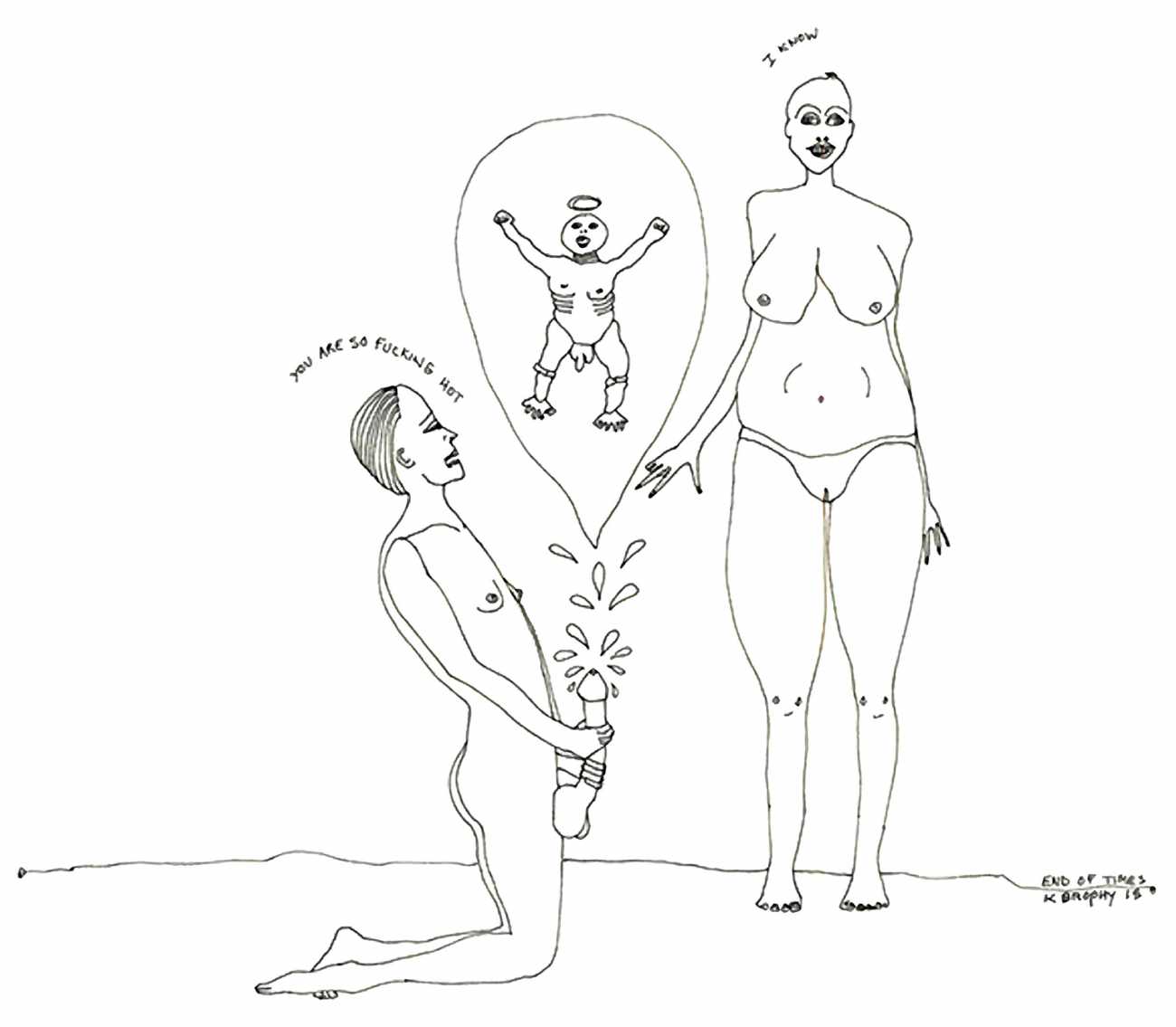 Most of Kitty Brophy’s works on paper are no bigger than sketchbook pages, yet each packs a punch. Her palette is spartan – nothing but midnight black, blinding white and blood red. The people in her pictures wear nothing at all, except on occasion a leather mask or a noose. Most are close-ups, with limbs extending past the paper’s edges. Some depict individual figures in extreme and extremely vulnerable positions. Others show multiple figures, their torsos tangled together or stacked in stylised patterns. Genitals claim centre stage.