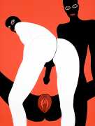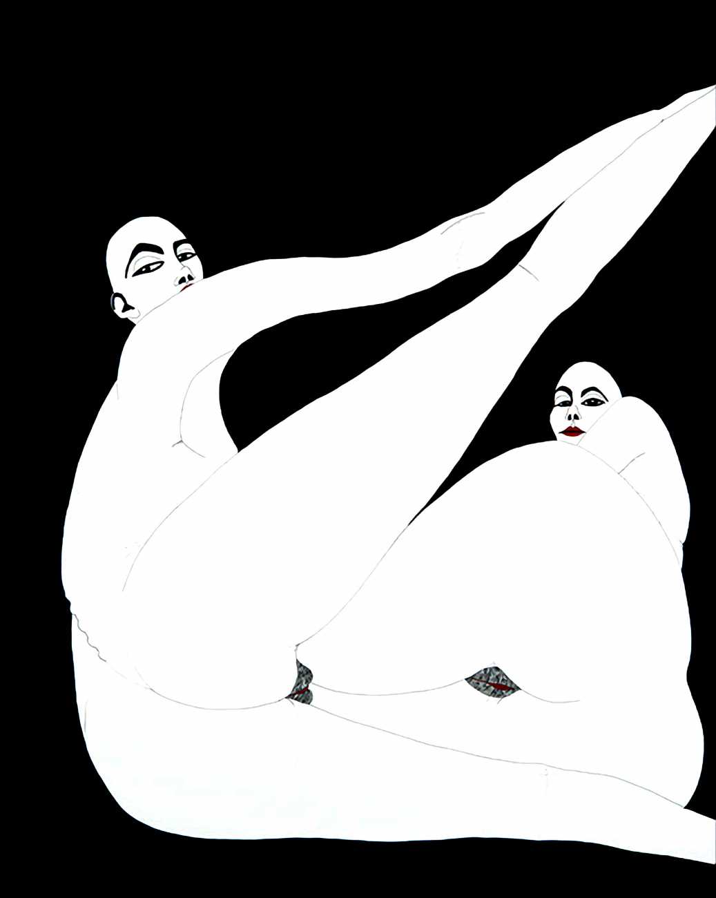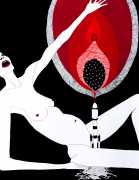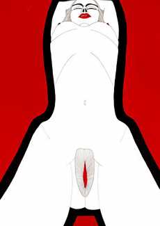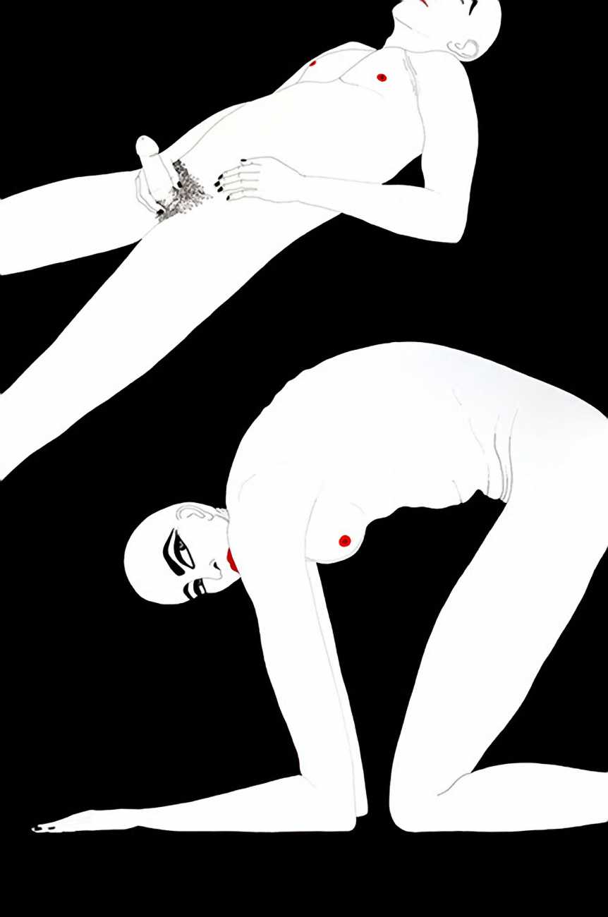 Up to the end of 2015 her drawings were in simple black ink, often clearly autobiographical with captions and poems. Then in 2016 the trademark red appeared, along with stylised celebratory depictions of vulvas and cocks. Since then she has devoted herself to graphics which explore sexual themes in her own terms, often using carefully-composed selfies as reference. She gives these bold, exquisitely delineated compositions that frequently isolate and emphasise the sex organs explanatory titles which match the directness of the artwork – ‘Out and Proud’, ‘Choose Me’, ‘Just Because I’m On My Back Doesn’t Mean I’m Not In Charge’. As she explains, the transition from a Catholic girl’s body shame, to abusive scrutiny as a model, to autonomous self-expression, has been liberating. ‘Screw that,’ she says, ‘I’m showing everything and I own it.’