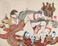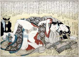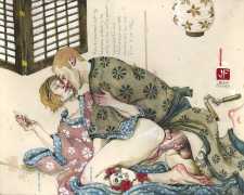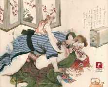 Reaching its climax in the Edo period, from the seventeenth to nineteenth centuries, the Japanese erotic art genre of Shunga was created using woodblocks. Japanese masters of the form include Katsushika Hokusai, Kitagawa Utamaro and Utagawa Kunisada. Shunga prints, though undeniably sexual, favoured the strange and the silly as much as the romantic, featuring ornate robes, lots of pubic hair, massively enlarged penises, imaginative sex positions – and the occasional octopus.