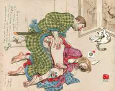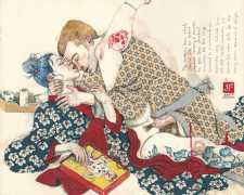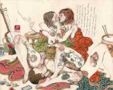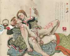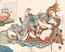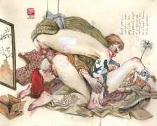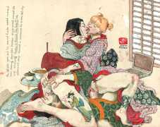 In Jeff Faerber’s contemporary versions of Shunga, sexual partners with many piercings and tattoos flaunt blatantly engorged genitalia. Japanese robes, printed screens, sushi and tea sets, paying homage to the original prints, while the dildos, cell phones and computers bring the imagery solidly into the twenty-first century. The explicit images, hilariously endowed with titles like ‘They discussed Chaucer, supped on ’89 Vieux Château Certan with hints of blackcurrant and elderberry, then topped the evening off with a wee bit of bumfuckery and tea’, and ‘In order to remedy a humdrum day, she jumped onto a usenet group on the information superhighway, and after a fulsome substantive exchange in the market place of ideas with a gentleman on the lickylicky forum, she contrived an IRL session to try out his wares and thus attained unhindered glory with oral delicacies’, present a light-hearted interpretation of how the erotic is portrayed and practised, then and now, in East and West.