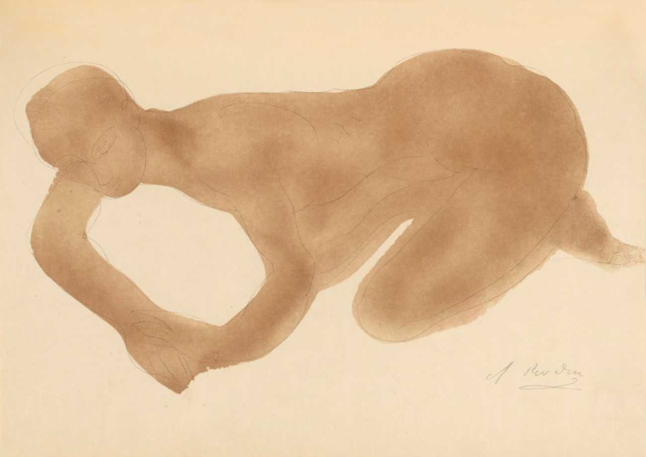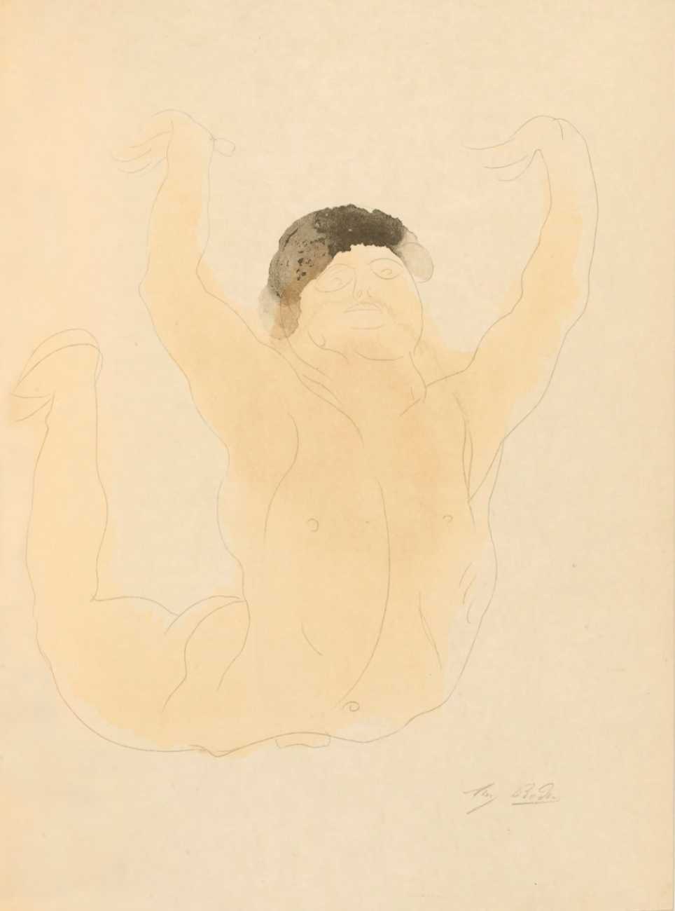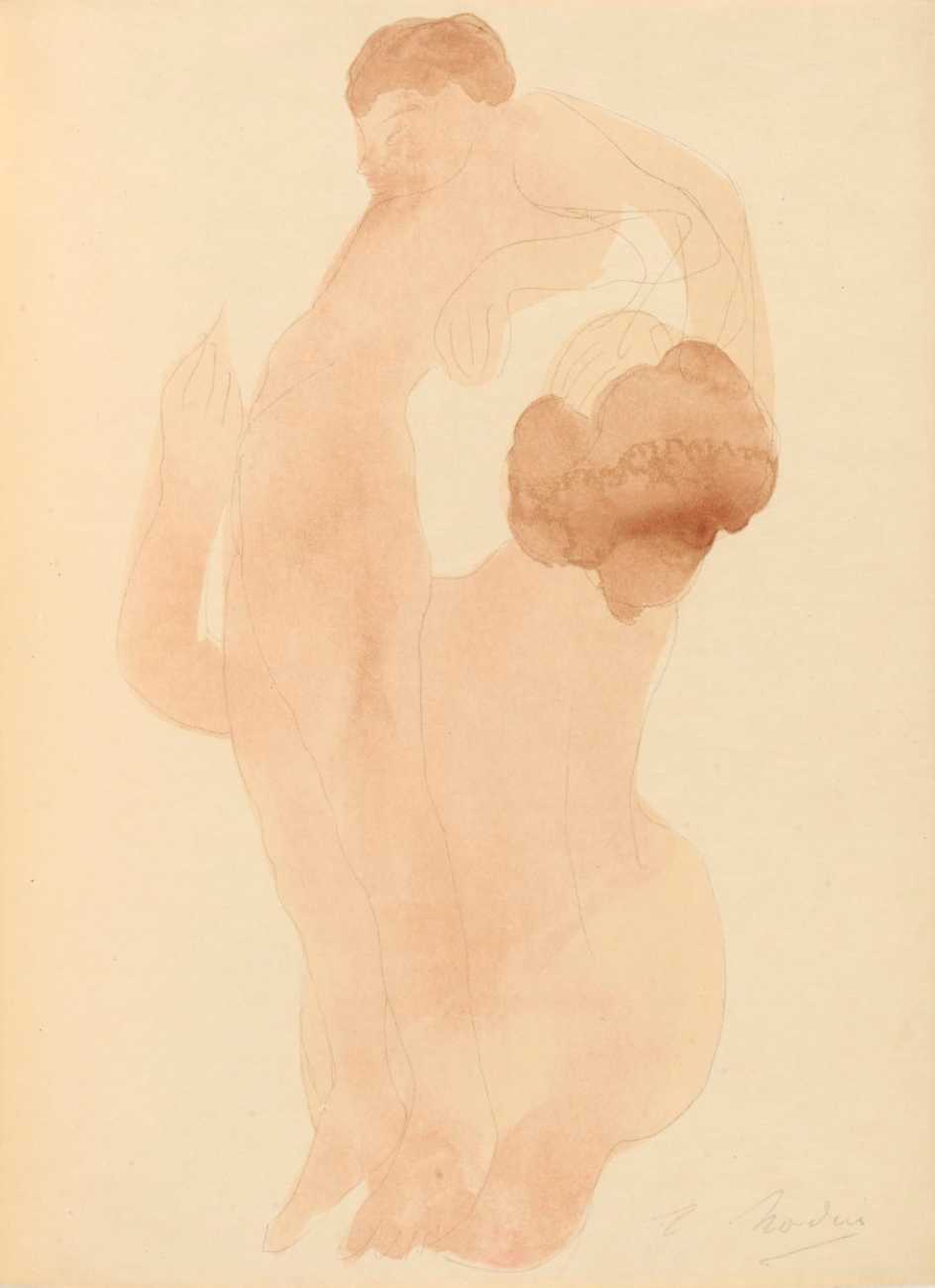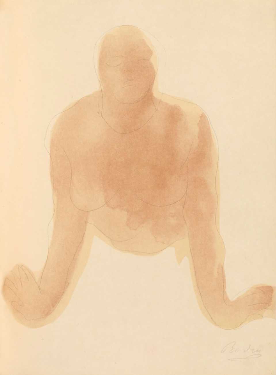 From the outset, however, Rodin had no intention of illustrating Mirbeau’s narrative; he planned to choose the twenty matched illustrations from his recent drawings, more stylised, experimental and uniformly-coloured than his earlier work. The Le jardin des supplices drawings coincided with Rodin’s first one-man exhibition (which included the Jardin drawings). A quotation from the German poet Rainer Maria Rilke sums up the critical response to these works: ‘There appeared these strange documents of the instantaneous, of what happens imperceptibly. Rodin suspected that the unintentional movements executed by the model thinking herself unobserved, if one caught them quickly, could harbour a vigour we have no idea of because we are not used to paying active and sustained attention to them. By not taking his eyes off the model and entirely abandoning the paper to his swift and experienced hand, he drew an infinite number of gestures never seen, always overlooked, and the expressive power they exude is immense.’