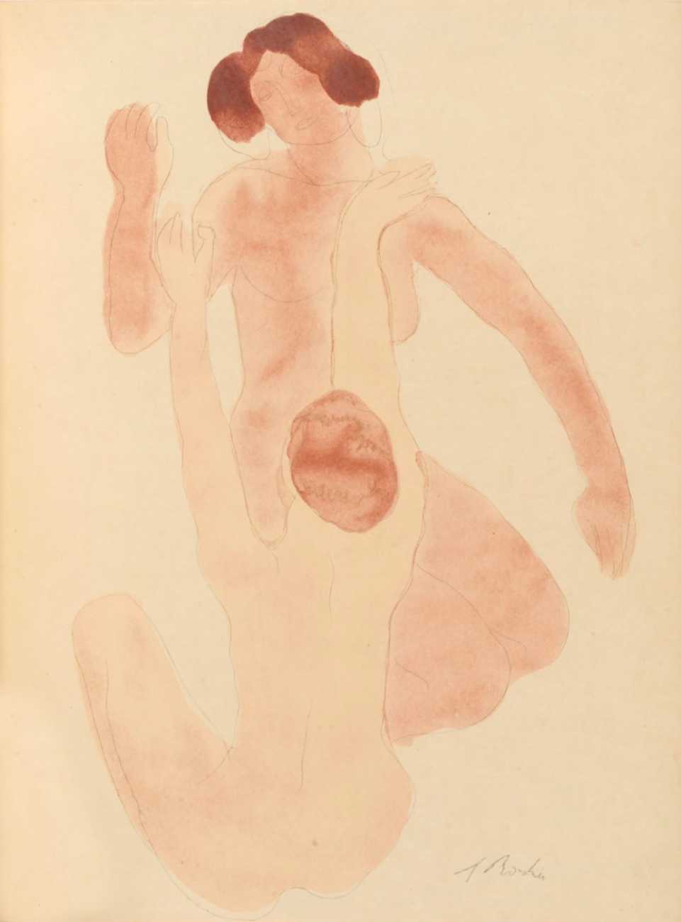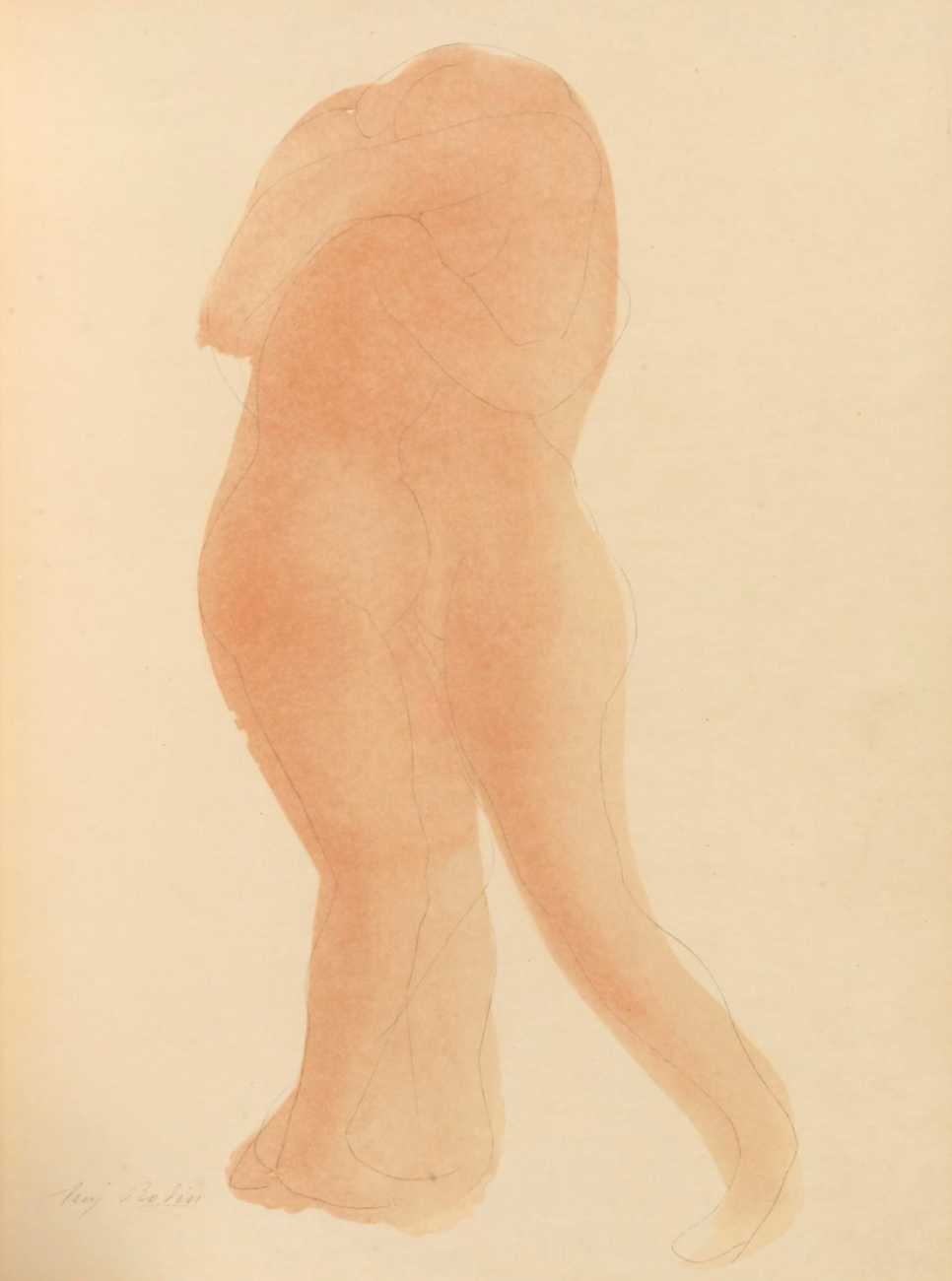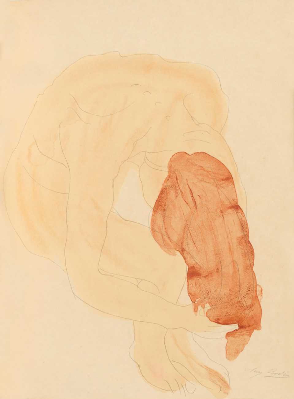 From the outset, however, Rodin had no intention of illustrating Mirbeau’s narrative; he planned to choose the twenty matched illustrations from his recent drawings, more stylised, experimental and uniformly-coloured than his earlier work. The Le jardin des supplices drawings coincided with Rodin’s first one-man exhibition (which included the Jardin drawings). A quotation from the German poet Rainer Maria Rilke sums up the critical response to these works: ‘There appeared these strange documents of the instantaneous, of what happens imperceptibly. Rodin suspected that the unintentional movements executed by the model thinking herself unobserved, if one caught them quickly, could harbour a vigour we have no idea of because we are not used to paying active and sustained attention to them. By not taking his eyes off the model and entirely abandoning the paper to his swift and experienced hand, he drew an infinite number of gestures never seen, always overlooked, and the expressive power they exude is immense.’