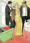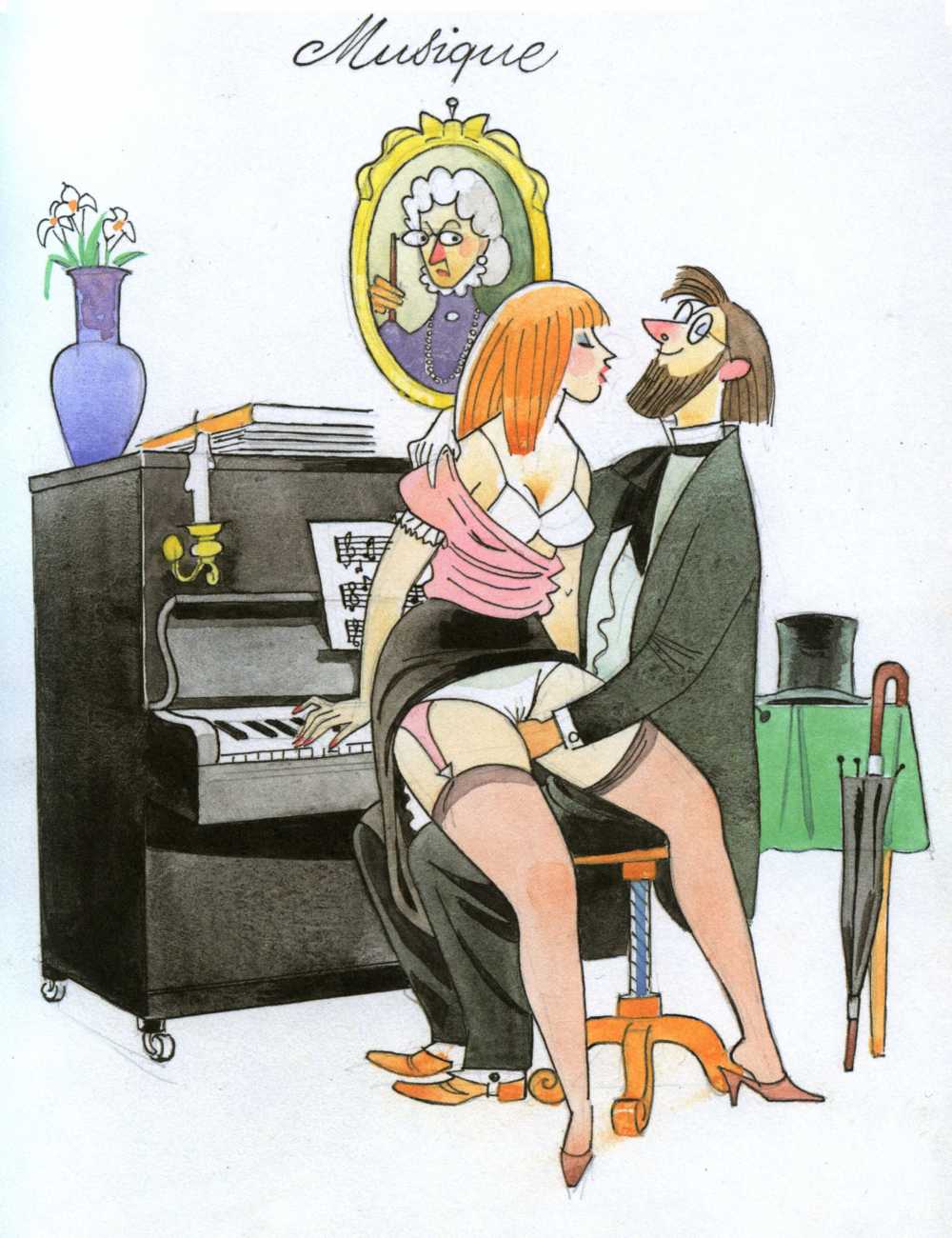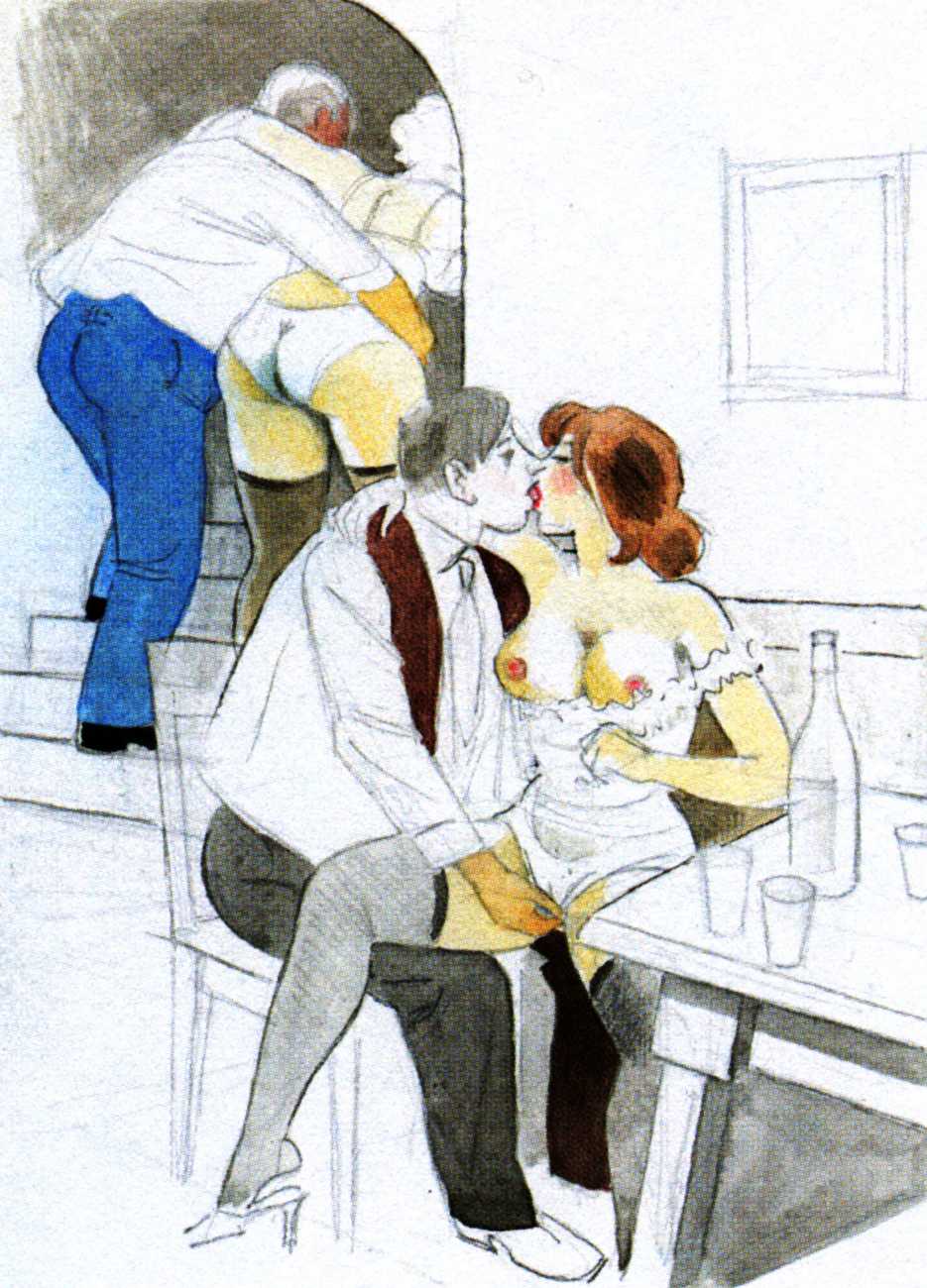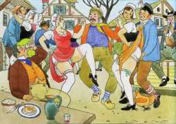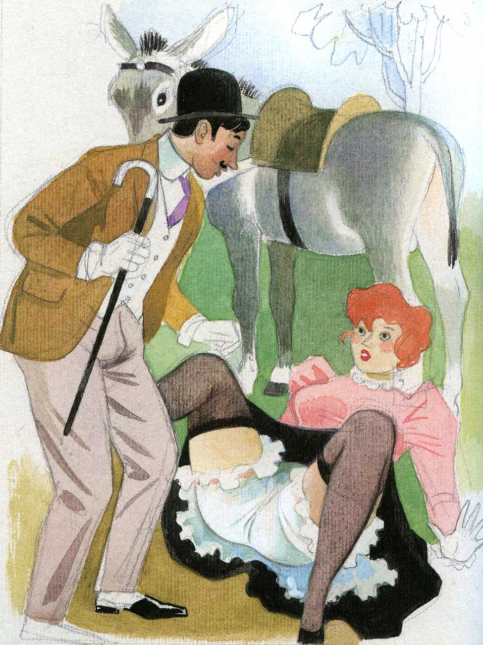 Drunkenness opens the floodgates of erotic encounter, while nature acts as a reservoir of emotions, suggesting to walkers and hunters that they turn away from mushrooms and rabbits to frolic in the woods. His speciality is the chance glimpse of female flesh, with knickers, suspenders and tight stockings suddenly revealed by the sudden kick of a horse, or by the blast of the rascal wind.