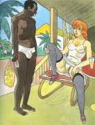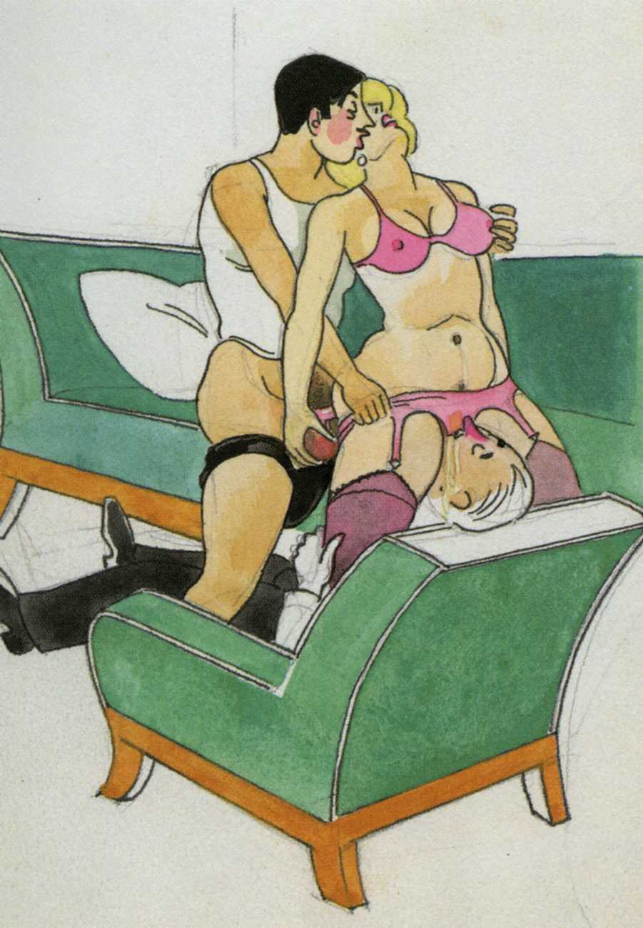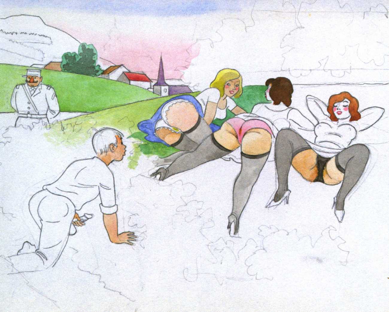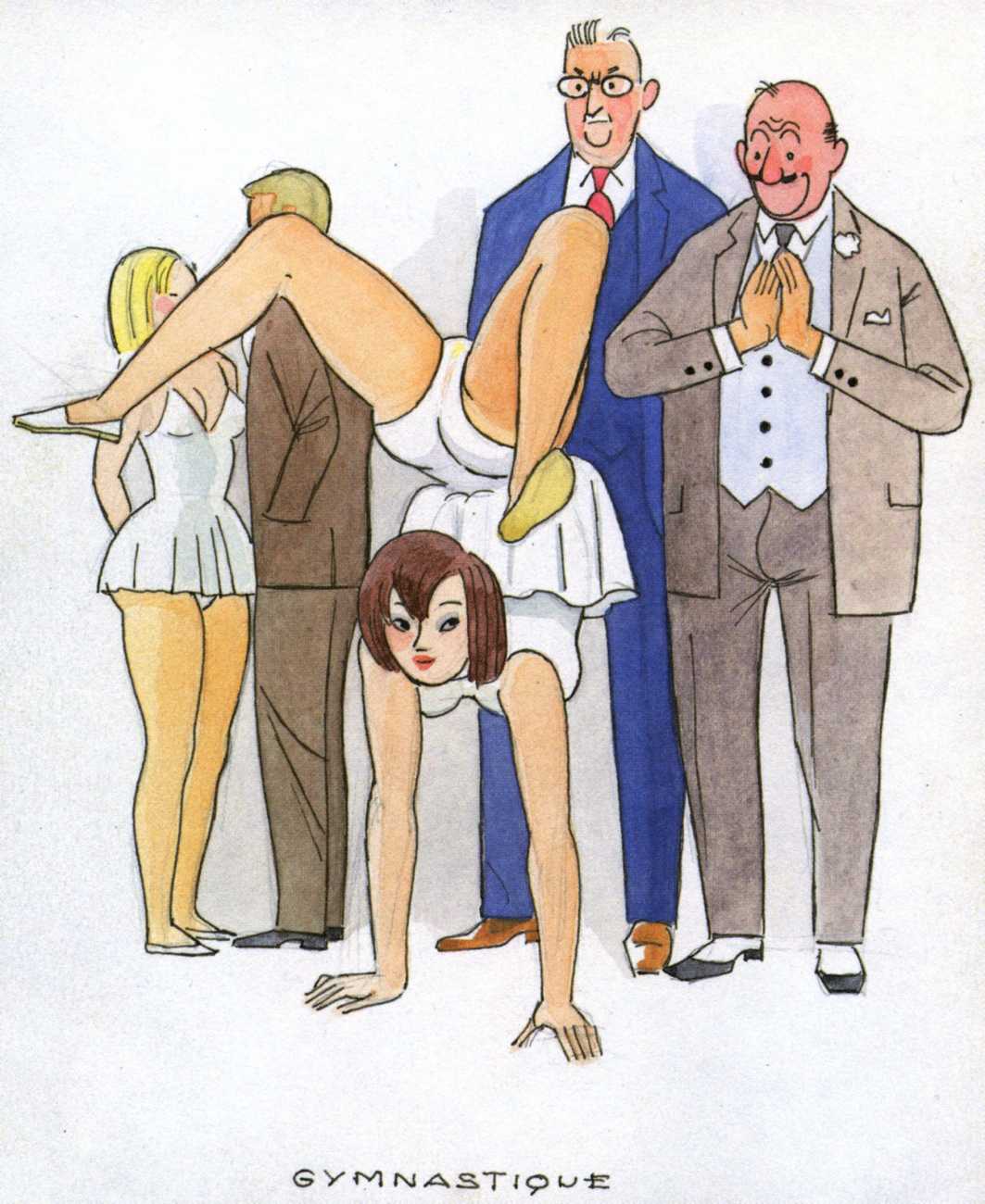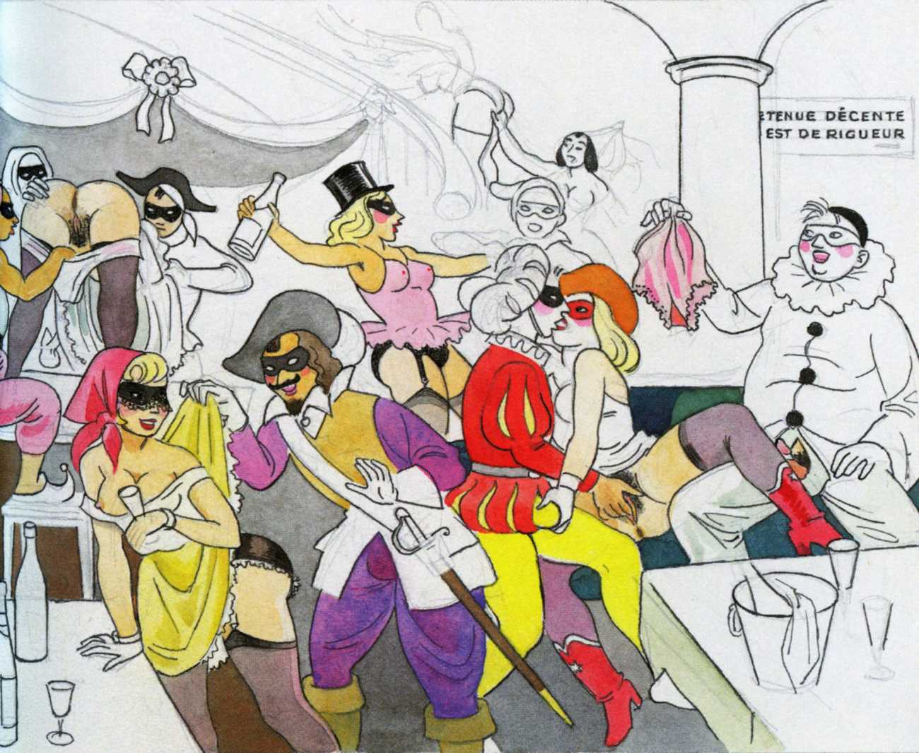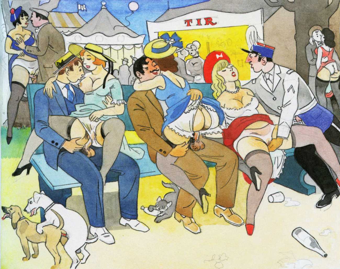 He was, for his time, quite a man of the world, taking his viewers to a hotel room, a gambling den, a deep forest or an exotic landscape. Often the children’s cartoonist is not entirely absent, for in a corner of a licentious composition stands a placid little cat or a mischievous puppy (often with his own erection).