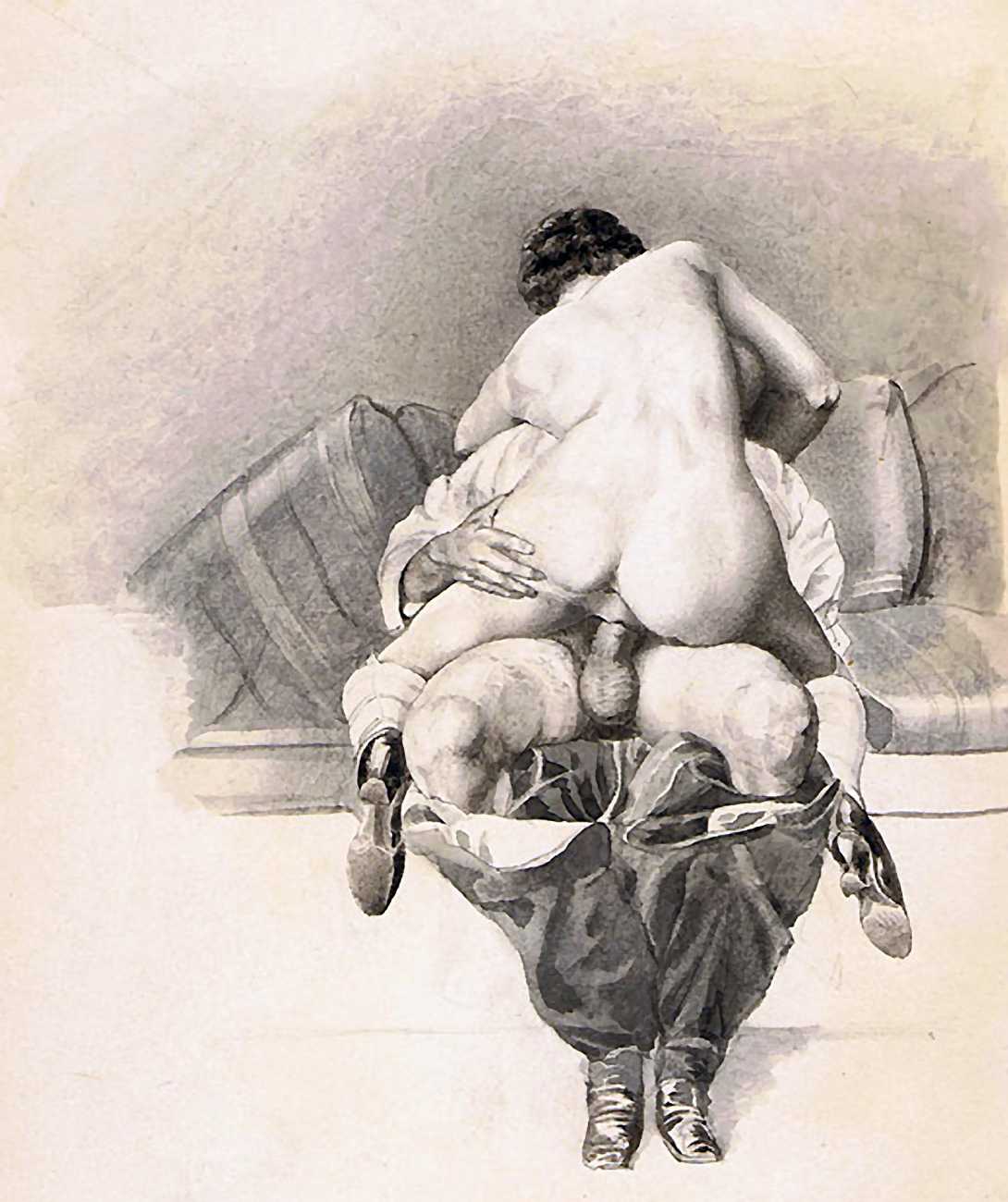 Here we have the few erotic images that have survived – they include The Young Squire (amor feudalis), The Farmer (amor rusticus), a happy foursome, and a number of dildos (godmiché is French for dildo) and strap-ons. How modern is that?
