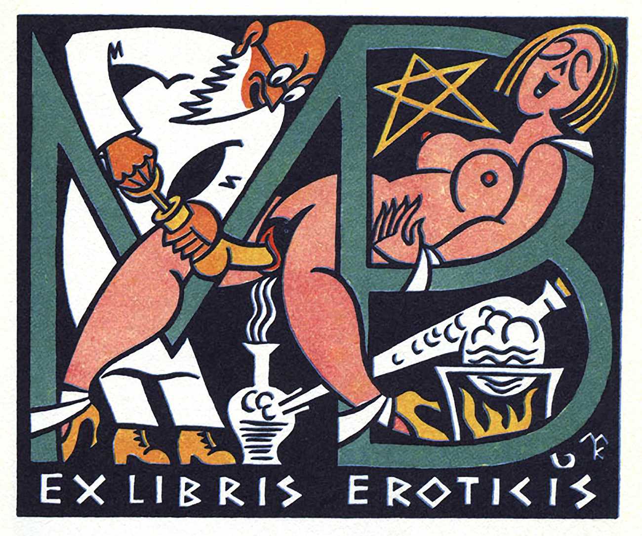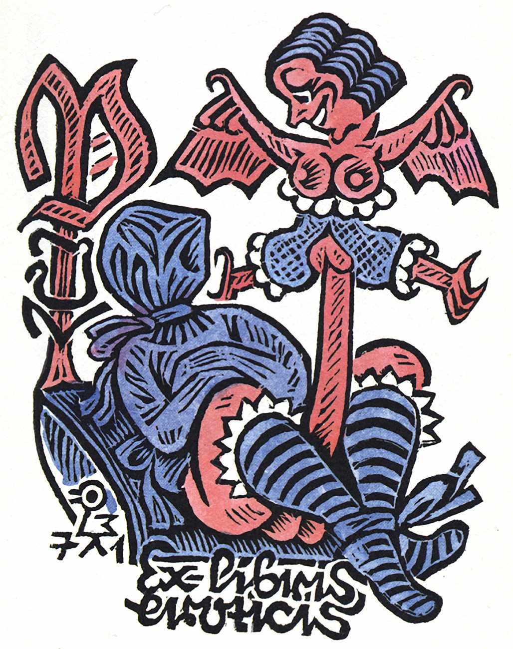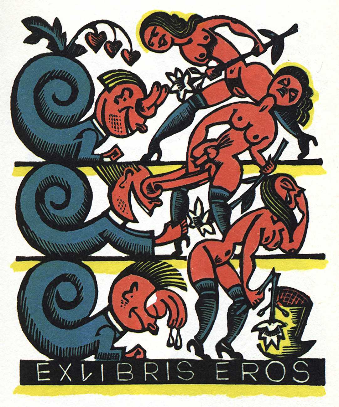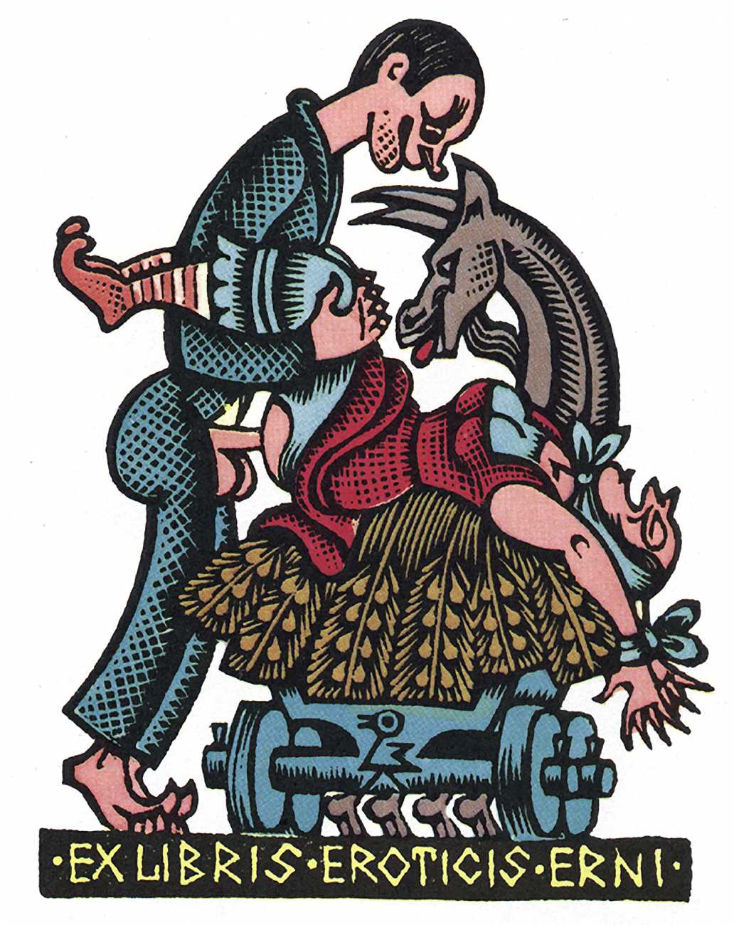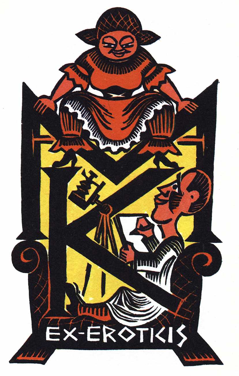 Nearly all of Max Kislinger’s erotic work is in the form of bookplates or Ex Libris, almost certainly because he wanted these private commissions not to interfere with his civil service work and his growing influence as an authority in folk art. However, as can be seen from these beautifully executed designs, mostly woodcuts but also some paintings, he was very aware that there was a strong tradition of earthy eroticism entwined with the folk art of his native country. His ‘Ex Libris: Eroticis’ series spans at least three decades, and combines witty composition with strong lines and bright colour to evoke a culture that had minimal shame around matters sexual.