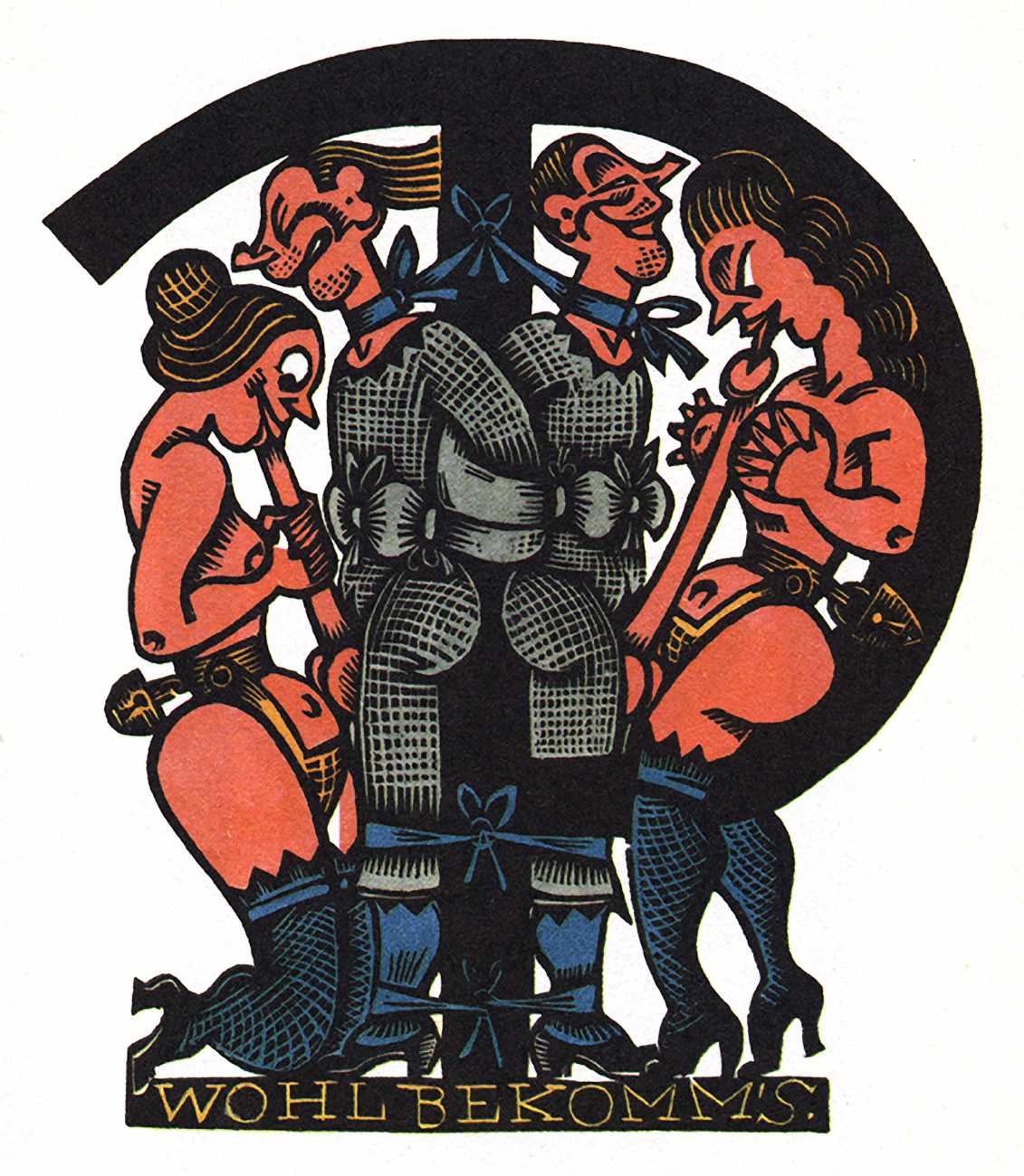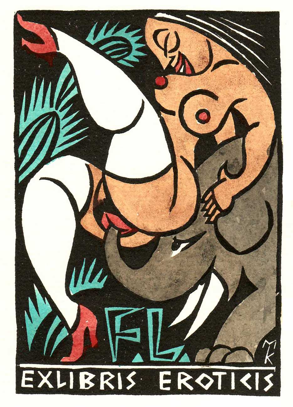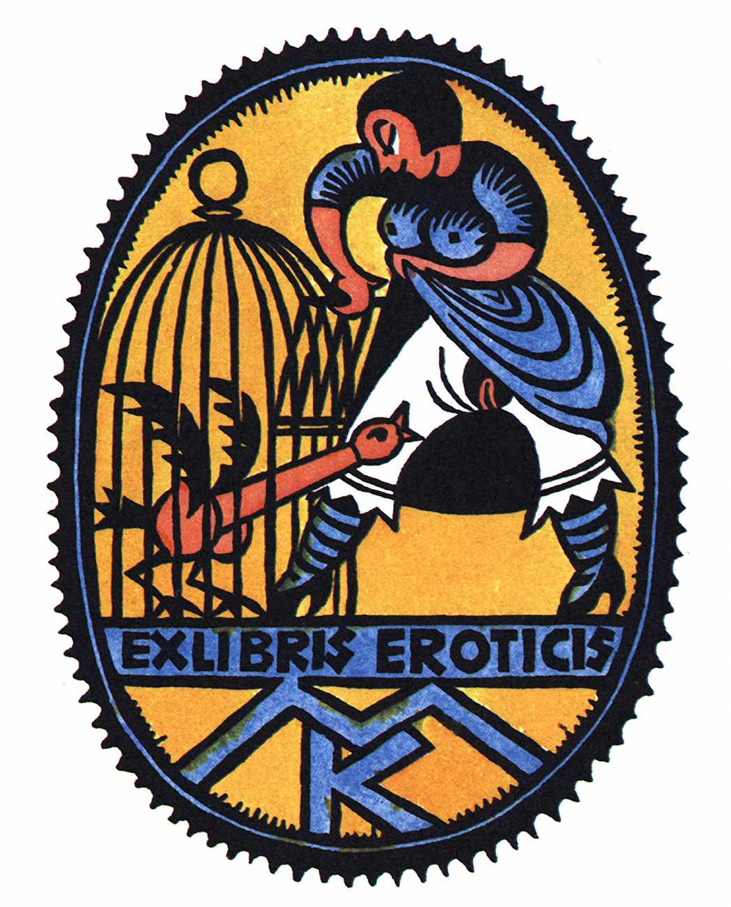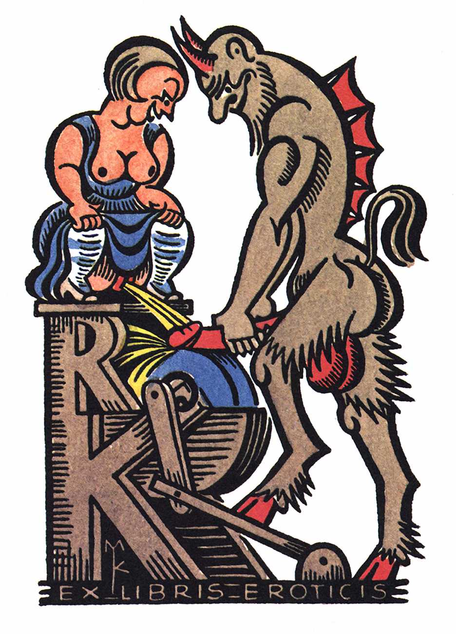 Nearly all of Max Kislinger’s erotic work is in the form of bookplates or Ex Libris, almost certainly because he wanted these private commissions not to interfere with his civil service work and his growing influence as an authority in folk art. However, as can be seen from these beautifully executed designs, mostly woodcuts but also some paintings, he was very aware that there was a strong tradition of earthy eroticism entwined with the folk art of his native country. His ‘Ex Libris: Eroticis’ series spans at least three decades, and combines witty composition with strong lines and bright colour to evoke a culture that had minimal shame around matters sexual.