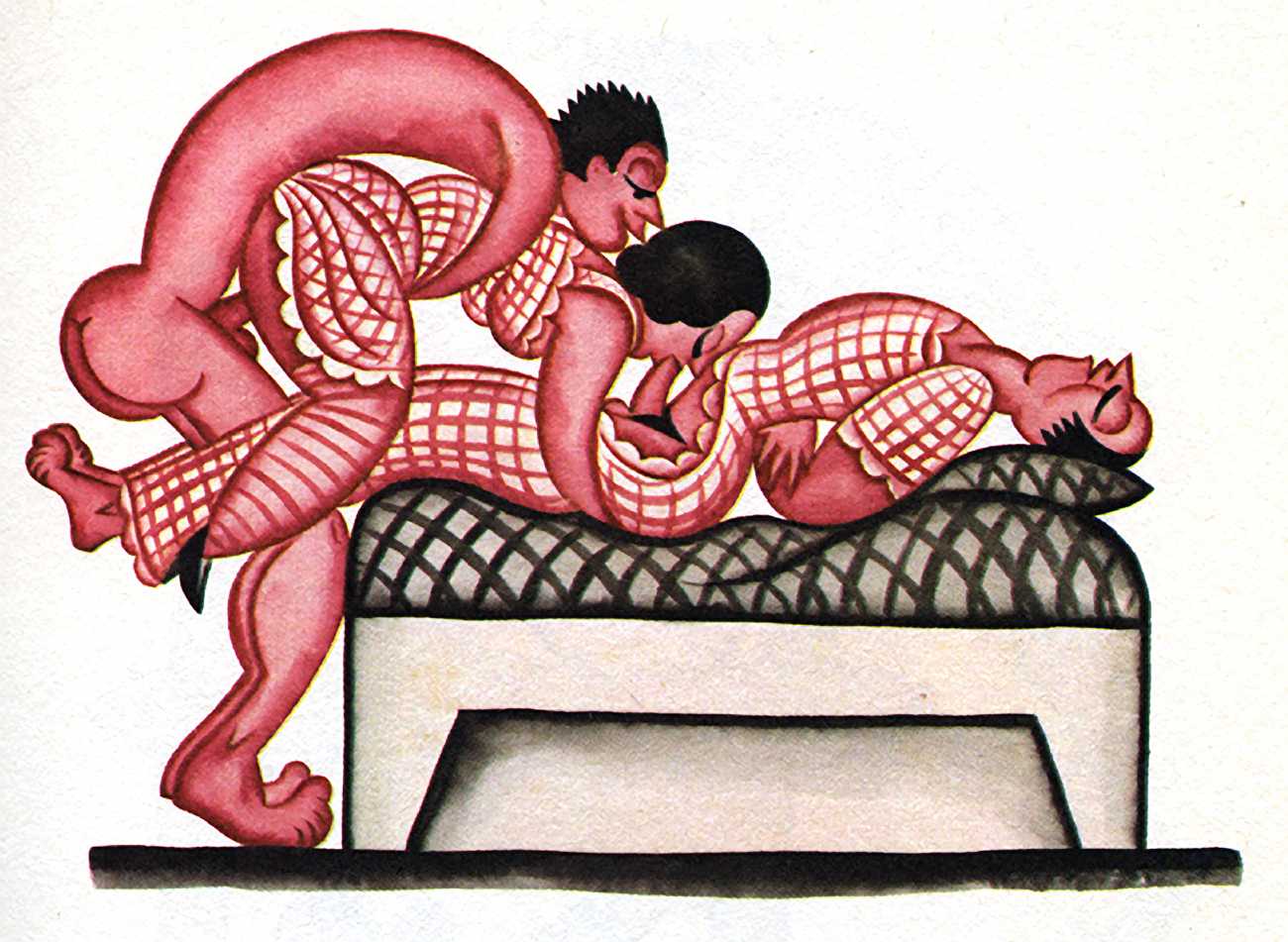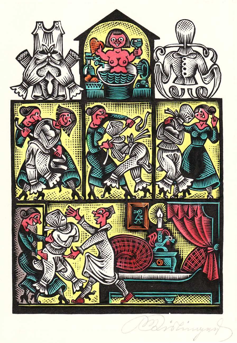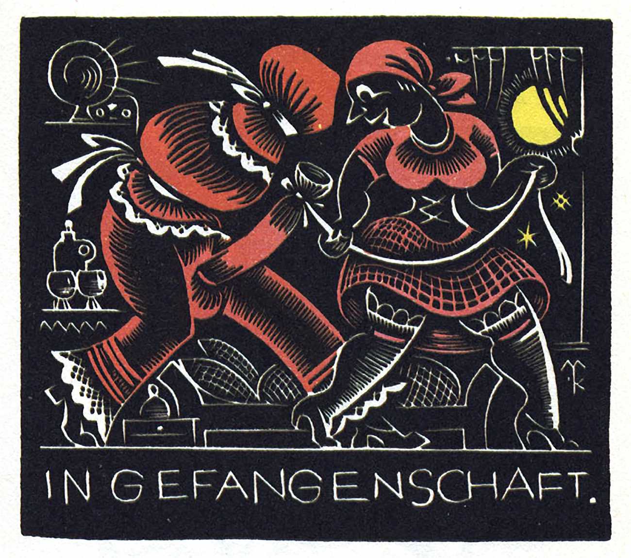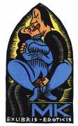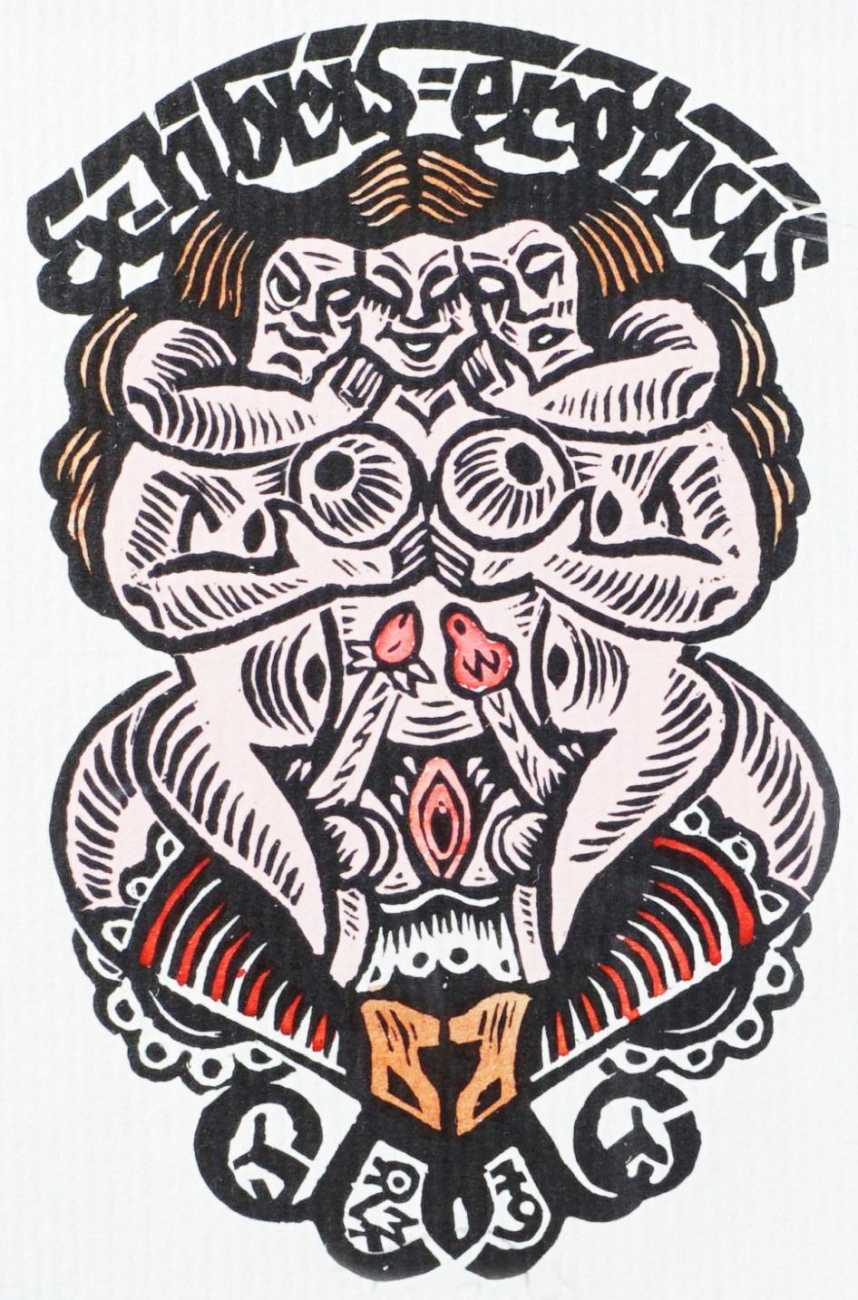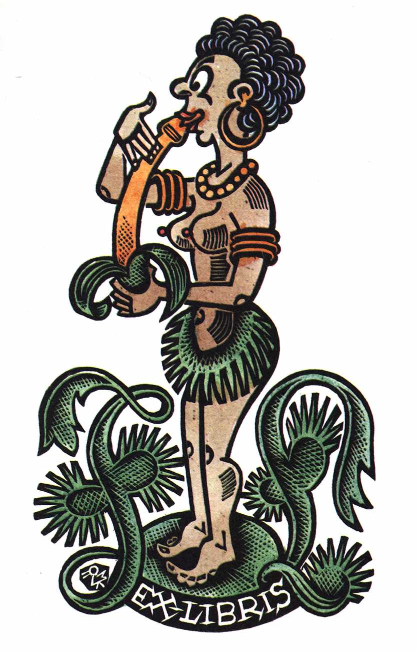 Nearly all of Max Kislinger’s erotic work is in the form of bookplates or Ex Libris, almost certainly because he wanted these private commissions not to interfere with his civil service work and his growing influence as an authority in folk art. However, as can be seen from these beautifully executed designs, mostly woodcuts but also some paintings, he was very aware that there was a strong tradition of earthy eroticism entwined with the folk art of his native country. His ‘Ex Libris: Eroticis’ series spans at least three decades, and combines witty composition with strong lines and bright colour to evoke a culture that had minimal shame around matters sexual.