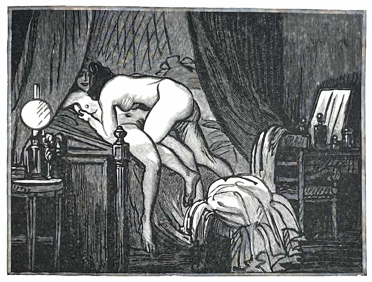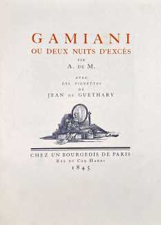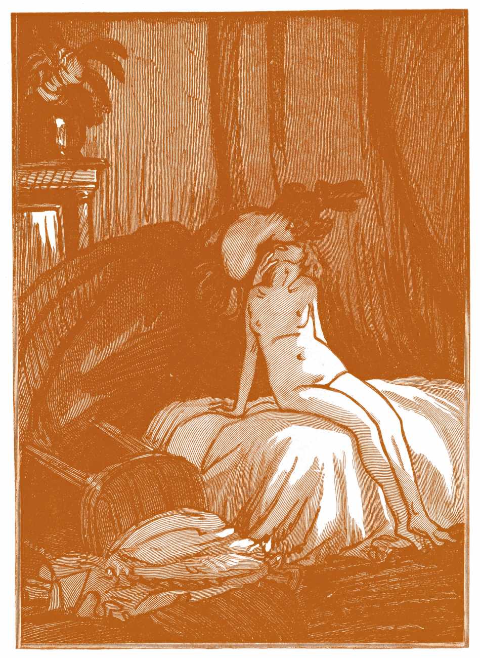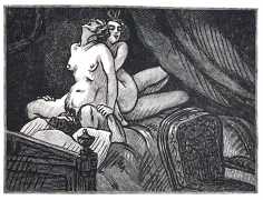 Gamiani, ou une nuit d’excès (Gamiani, or A Night of Excess), generally believed to have been written by Alfred de Musset and first published in 1833, is one of the best-known and most-illustrated of French erotic novels. Based on de Musset’s experiences with George Sand and her lesbian lover, Gamiani opens with Alcide watching Countess Gamiani and her young lover Fanny enjoying one another’s bodies. Very much aroused, Alcide reveals himself and joins them, and they spend the rest of their time together sharing their intimate stories and re-enacting scenes from them.