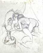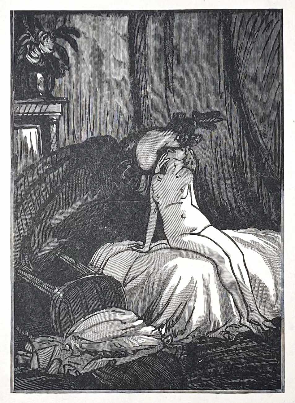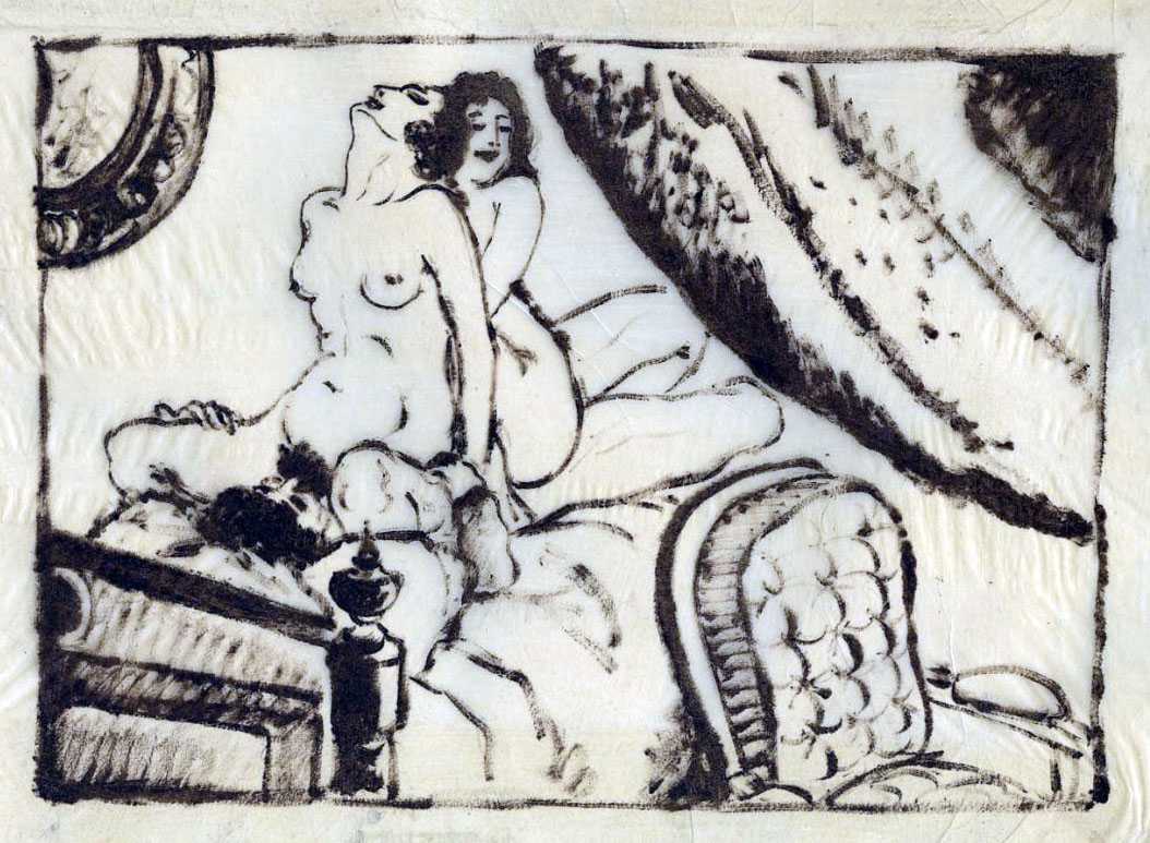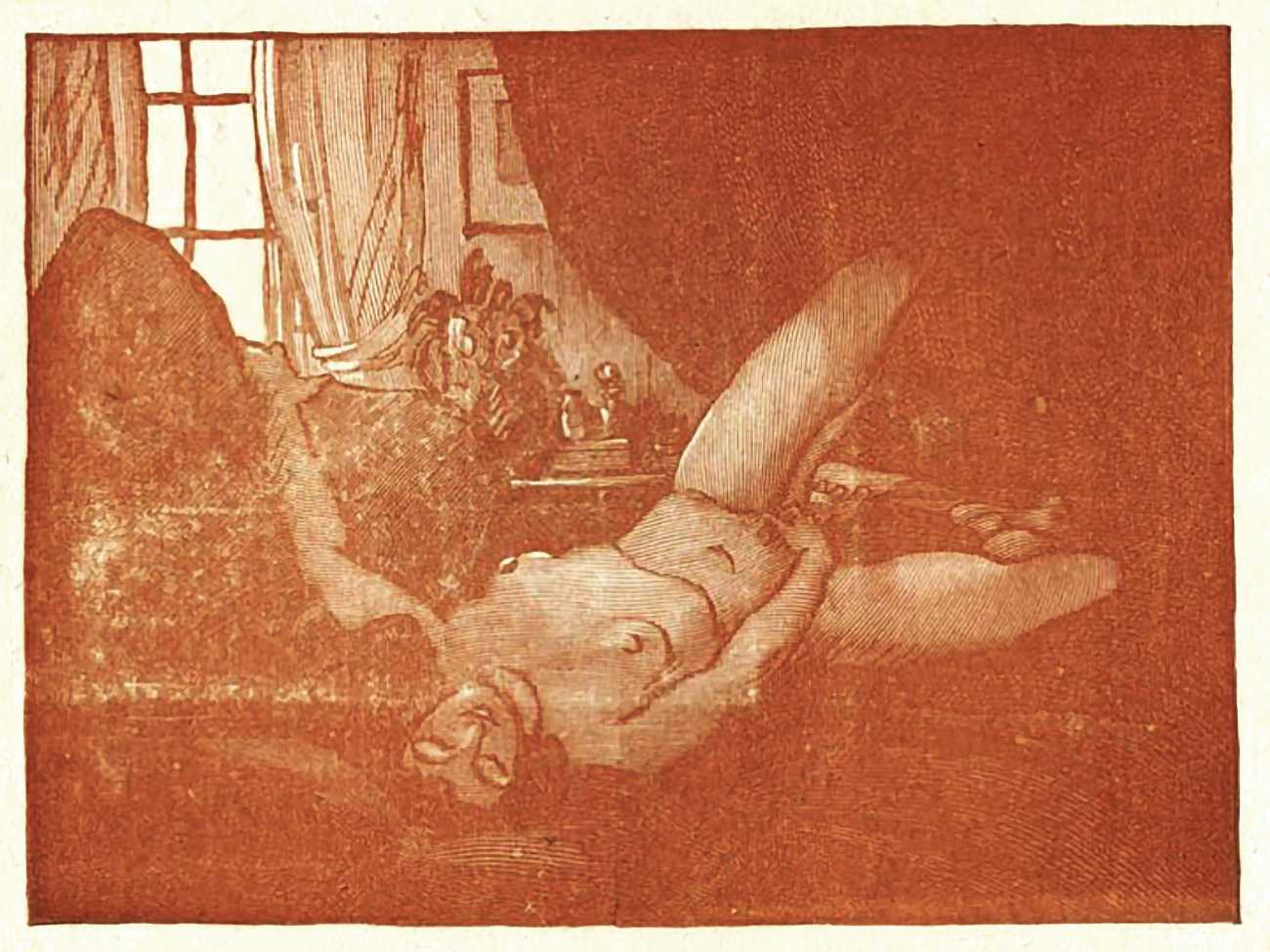 The Daragnès-illustrated Gamiani was published under the imprint Chez un bourgeois de Paris, rue du Coq Hardi (The House of a Parisian Bourgeois, Street of the Bold Rooster). The date given on the title page of 1845 is when the third Devéria-illustrated edition of Gamiani – which you can see here – was published, and not the actual publication date of this edition. 110 numbered copies of the Daragnès-illustrated Gamiani were printed, ten of which included a set of illustrations in sanguine and an original drawing, some of which are included here.