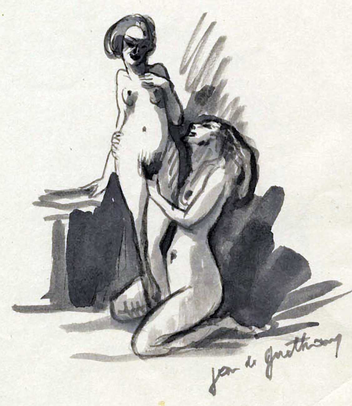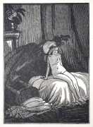 It was almost inevitable that Daragnès would produce illustrations for Gamiani – it was a rite de passage expected from any artist wanting to make a name in erotic illustration, and would have been well-rewarded by its wealthy clientele eager to possess a fine limited edition. However, in order to distance the portfolio from his more mainstream output, Daragnès chose to use the pseudonym Jean de Guethary for his Gamiani. Coming hot on the heels of his Verlaine plates, the trademark bold compositions cover all the key aspects of Musset’s narrative, including both the ape and the hanged man. The Daragnès-illustrated Gamiani is considered by many to be the artist’s finest work.