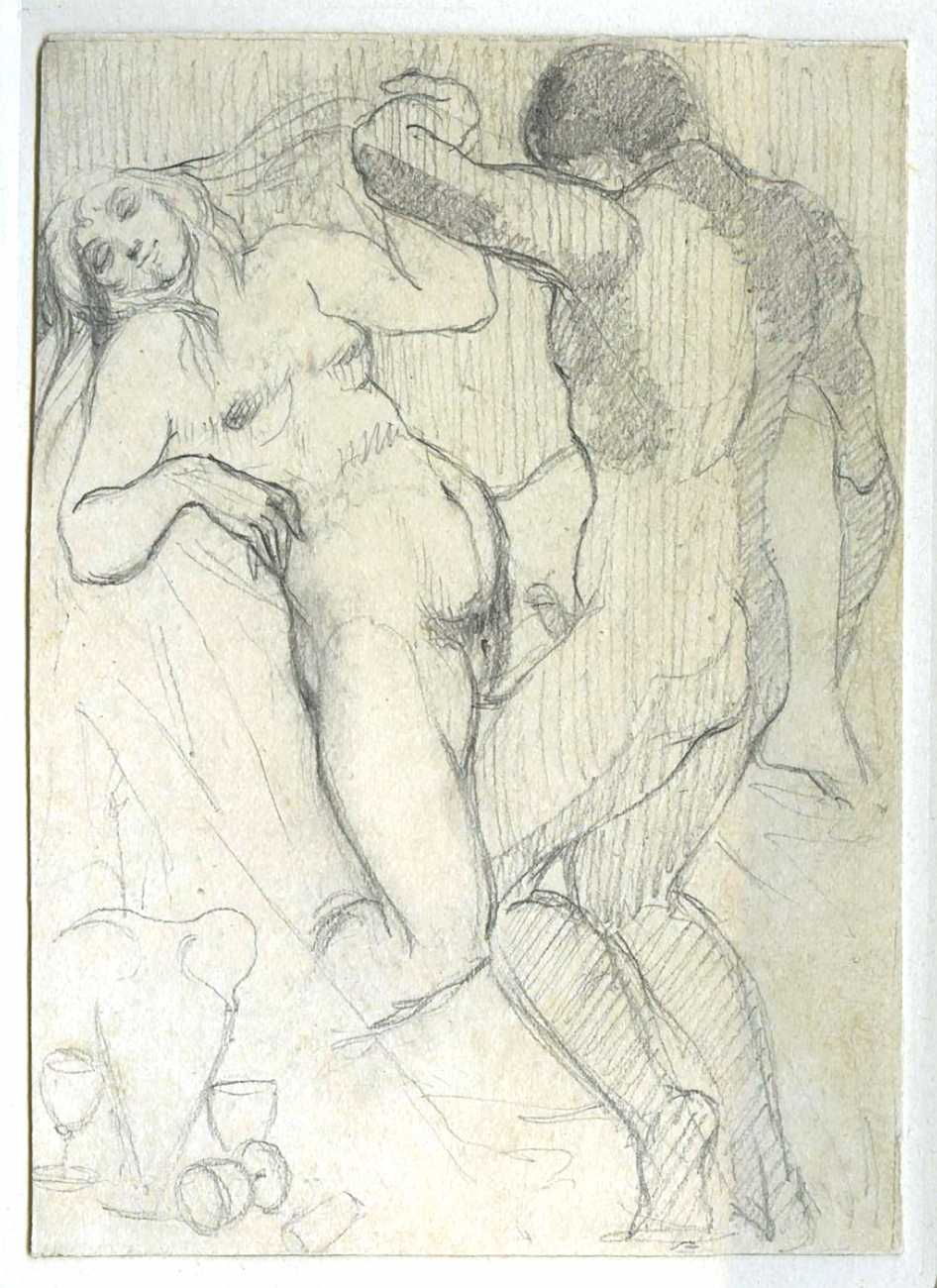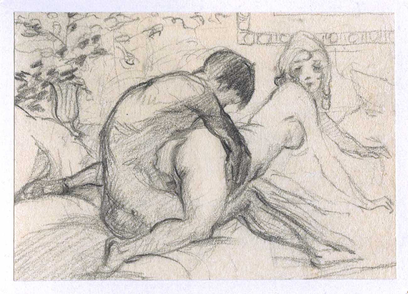 As far as we are aware, this portfolio of drawings with the generic title Accouplements (Couplings) is the only set of explicitly erotic drawings of Kernstok to have survived. Until May 2021 they were in the possession of the long-time erotica collector Tony Fekete, when they were sold in the Christie’s auction of a large part of that library.