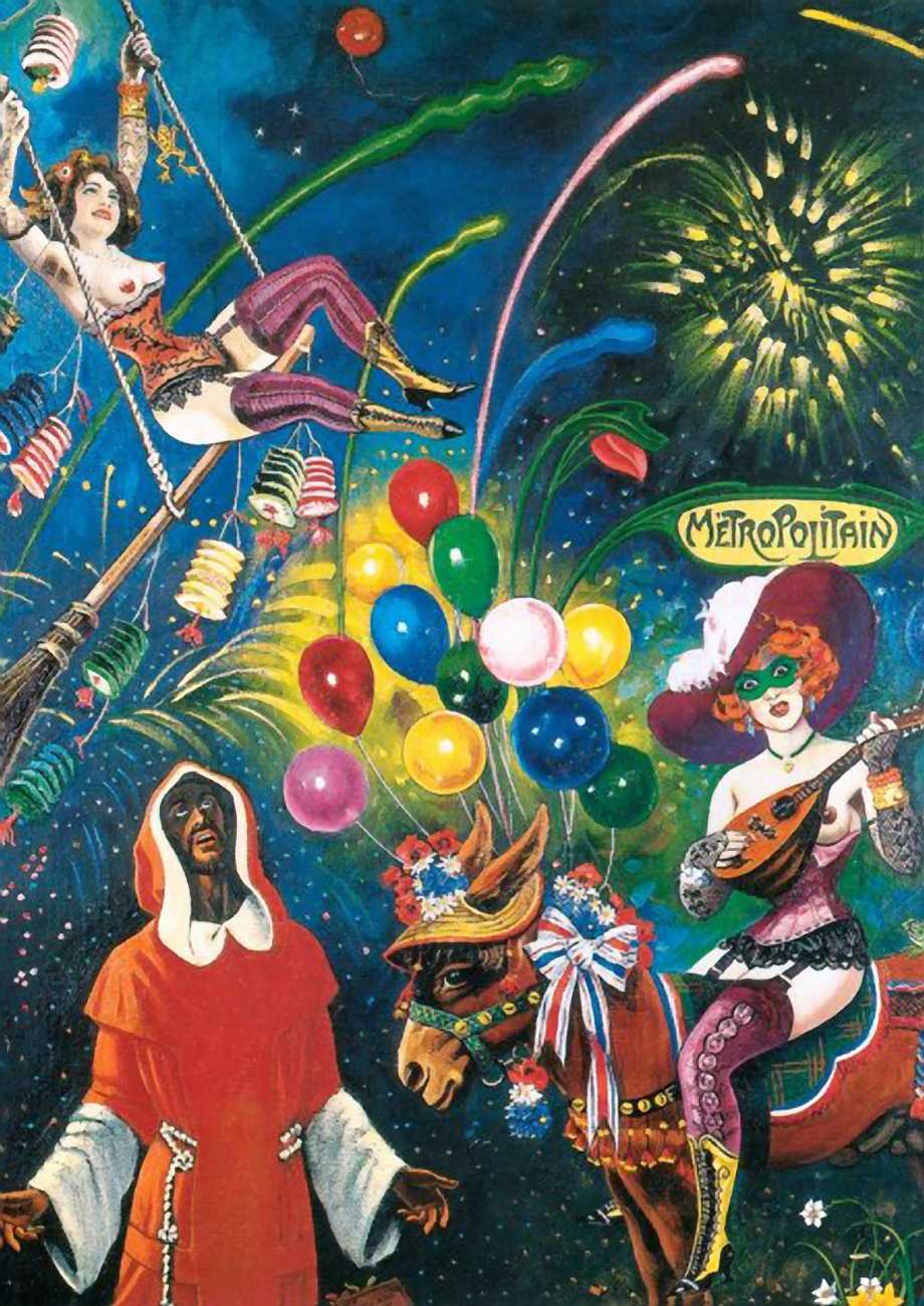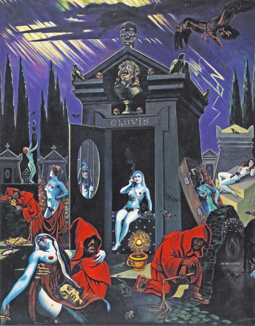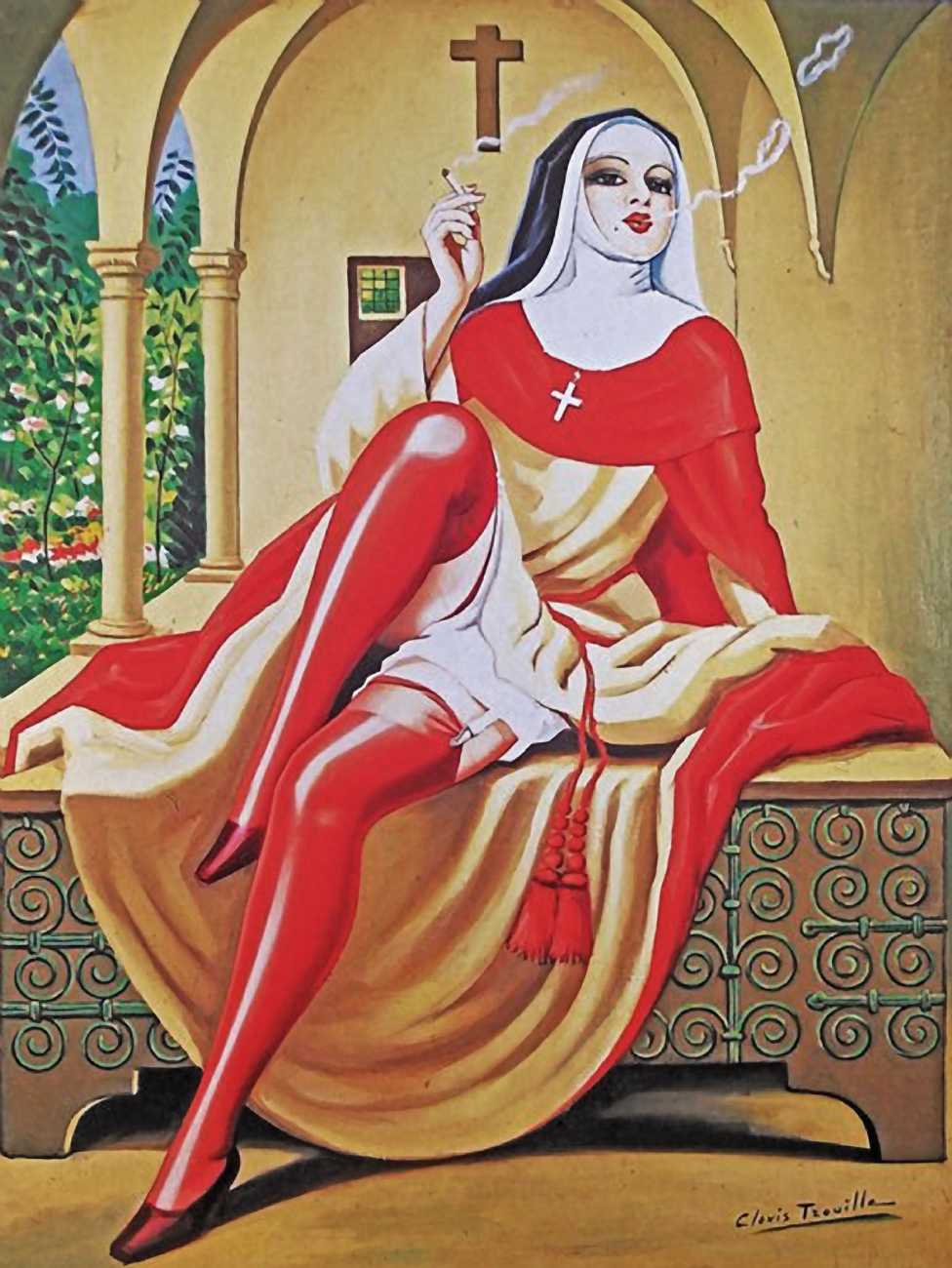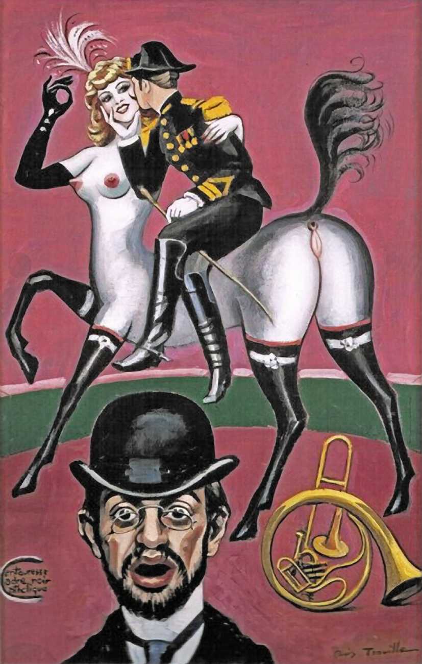 There is no doubt that Clovis Trouille was an erotic artist in every sense of the work, and this collection of more than fifty (probably half) of all his paintings demonstrates that the erotic permeated much of his critique of contemporary morality. From the cross-dressing cardinal of ‘Remembrance’, via the personal fantasies of his own funeral and burial, to his two (‘hard’ and ‘soft’) versions of the Immaculate Conception, his wit and imagination never fails. The skills of composition and colour clearly complement his work designing shop displays and mannequins, making for a chaotic riot of anarchic social critique, always worthy of close attention to his detail and symbolic allusions.