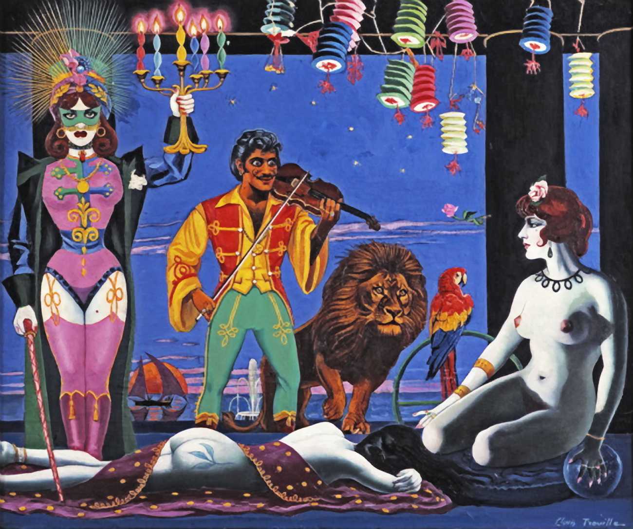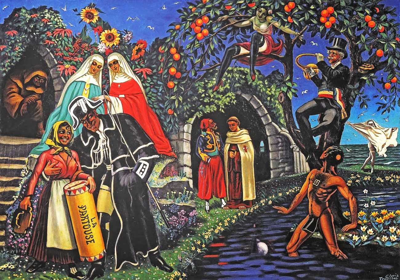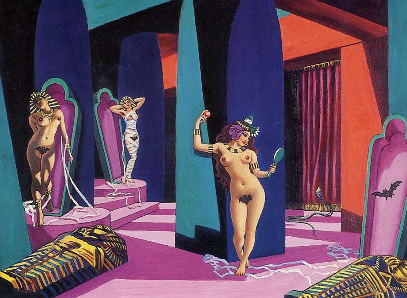 There is no doubt that Clovis Trouille was an erotic artist in every sense of the work, and this collection of more than fifty (probably half) of all his paintings demonstrates that the erotic permeated much of his critique of contemporary morality. From the cross-dressing cardinal of ‘Remembrance’, via the personal fantasies of his own funeral and burial, to his two (‘hard’ and ‘soft’) versions of the Immaculate Conception, his wit and imagination never fails. The skills of composition and colour clearly complement his work designing shop displays and mannequins, making for a chaotic riot of anarchic social critique, always worthy of close attention to his detail and symbolic allusions.