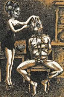 As Reinhard Scheibner explains, both Horny and his latest collection, True Devotion, are mainly about Berlin’s Naktleben (naked life) in clubs and nudist locations in the city’s parks, woods and lakes, mixed up with fantasies, memories from childhood, and whatever he observes happening in the world around him. The young woman with a cock who appears in several of the drawings is a self-identified alter ego.