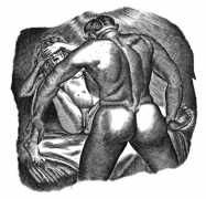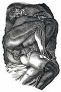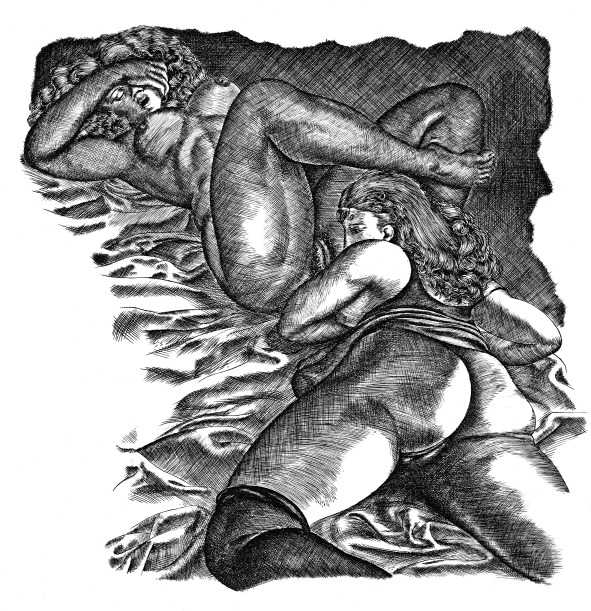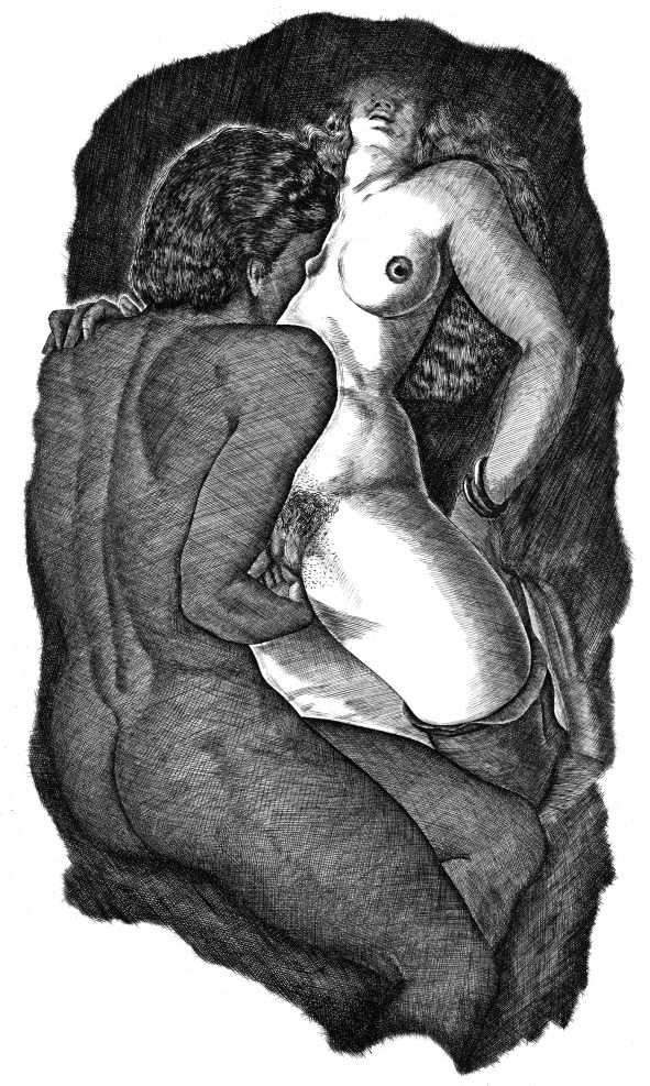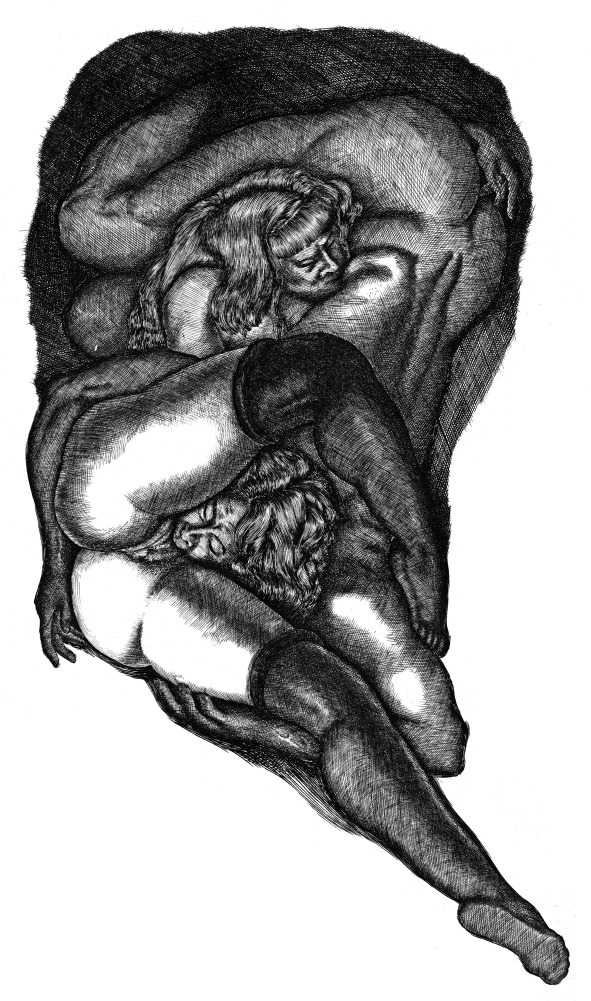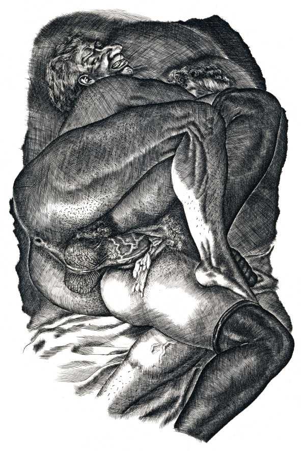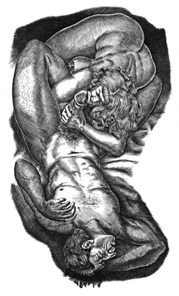 Tavy Notton’s explicit and powerful engravings are far from safe and pretty; the interplay of naked bodies is strong, energetic, dramatic. Here are lovers truly meeting one another.