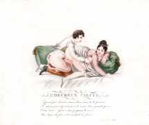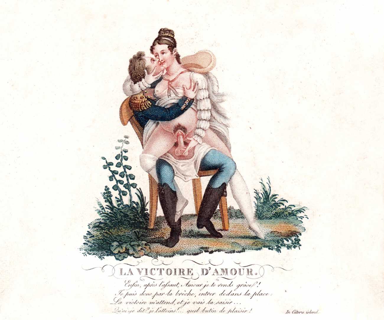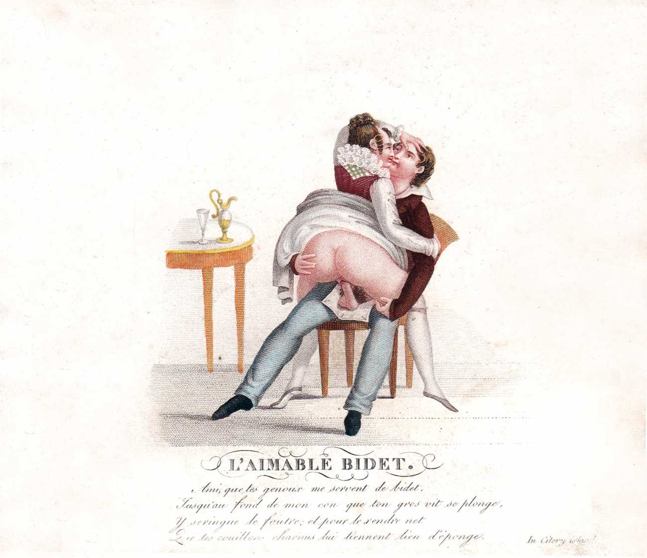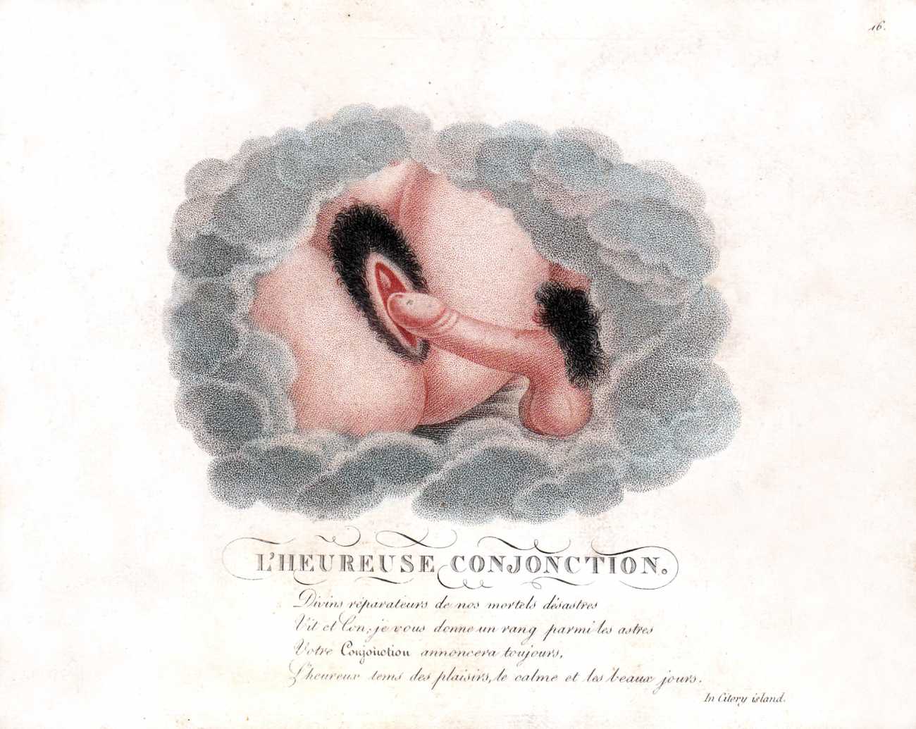Les extases de l’amour (The Ecstasies of Love) is a rare and strange portfolio, known in different versions in only a handful of surviving copies. Jean-Pierre Dutel’s standard reference work, Bibliographie des ouvrages érotiques publiés clandestinement en France entre 1650 et 1880, lists a version containing just eleven plates in a vertical format; another copy from the collection of Georges Hugnet (1906–1974), which was bought by Tony Fekete and sold by him at auction in 2014, contains twenty uncoloured plates. A third copy, containing eighteen coloured plates with titles in French and English – an example, ‘Les deux tetons: The two Brearts (sic)’ is shown here – came to auction in Berlin in April 2022.