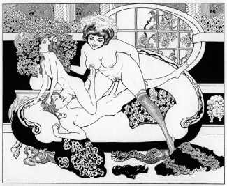 Whatever the arguments for and against its subject matter, there is very little about Melinda Gebbie’s illustrations for Lost Girls that fails to satisfy, either erotically or artistically. Perhaps the most interesting aspect of the artwork is the way she uses a variety of styles, colours and perspectives to bring a varying coherence to each of the book’s thirty chapters. In addition to her own colourful use of crayon, there are sequences which pay appropriate and brilliantly-observed homage to many of the earlier erotic artists whose work appears on this website – Franz von Bayros, Aubrey Beardsley, Gerda Wegener, Egon Schiele and Alphonse Mucha.