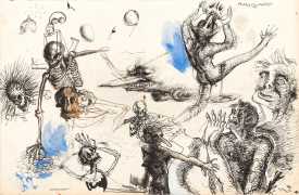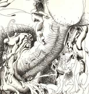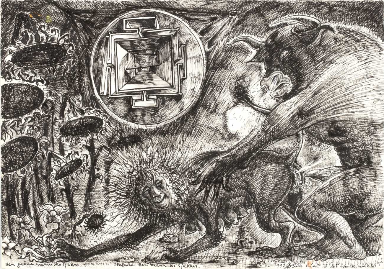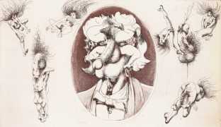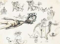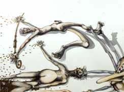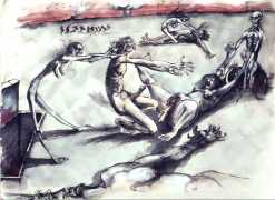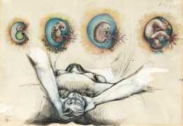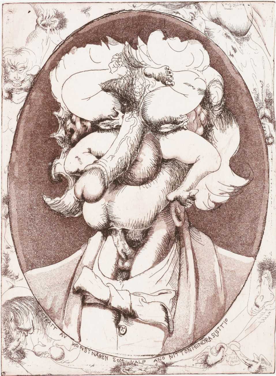 Rahmberg regularly precedes his paintings, especially his larger ones, with a series of preparatory sketches, often little more than doodles, filling large sheets of paper with ideas and texts to help him work out the content and composition of the finished painting. In addition to these sketches (you can see some at the end of the Big Bang series), and ever inventive and experimental, he has also tried his hand at etching, with some impressive results such as the Arcimboldo-head (here in two versions), and the three ‘Sexual Motif’ prints at the end of this selection.