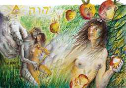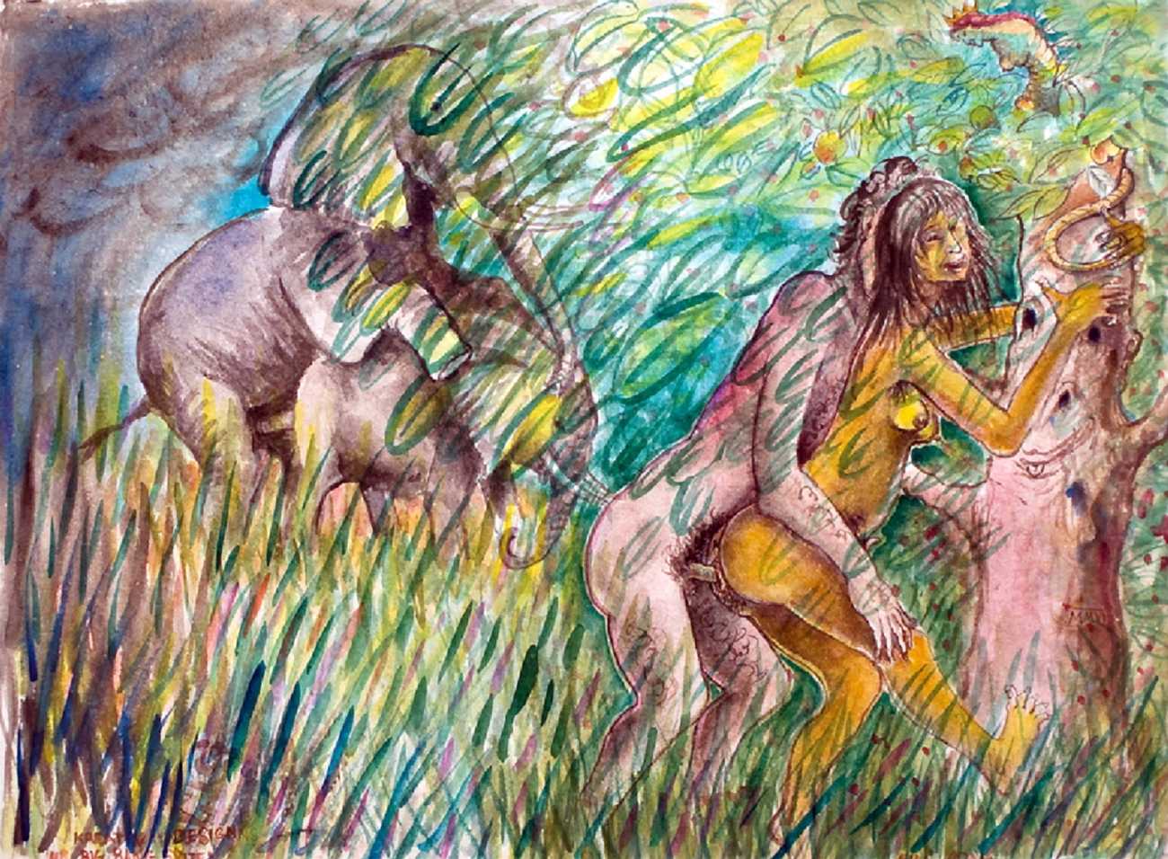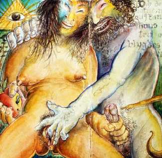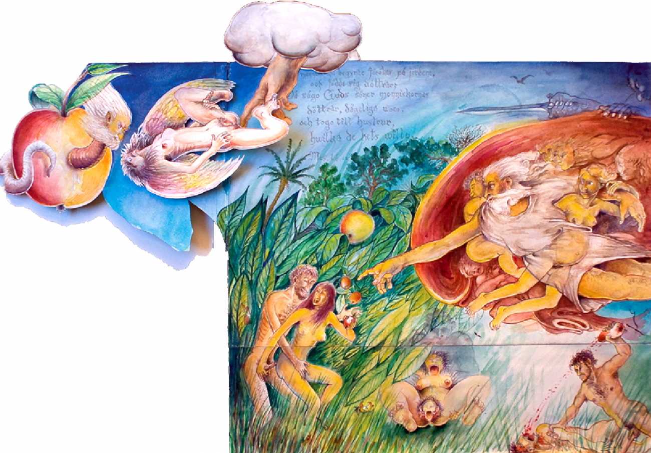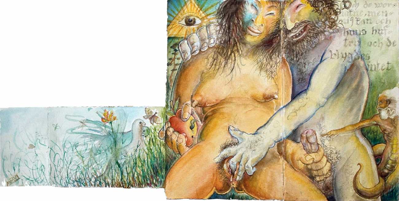 In the Big Bang series of the late 1990s, Rahmberg takes as his inspiration the creation myth according to Genesis in the Old Testament. As Clemens Altgård wrote of the exhibition which featured the Big Bang material, ‘Rahmberg takes as his inspiration the creation myth according to Genesis in the Old Testament. It is a motif that also attracted Robert Crumb (which you can see here), though if you compare Rahmberg’s way of approaching the biblical myth world with Crumb’s, you soon discover that there are big differences. Crumb follows the original text and does not satirise the motifs, at least not in any obvious way. Ulf Rahmberg’s Big Bang is definitely more disrespectful. Rahmberg, “the political preacher”, has in an anarchist and decidedly erotic way embarked on a myth that allows his outlook on life to be fully expressed. The motif of Cain killing Abel sets the tone for what is to come in the history of humanity – no wonder the snake seems satisfied. Ulf Rahmberg’s visions have both a virtuoso character and a universal validity.’