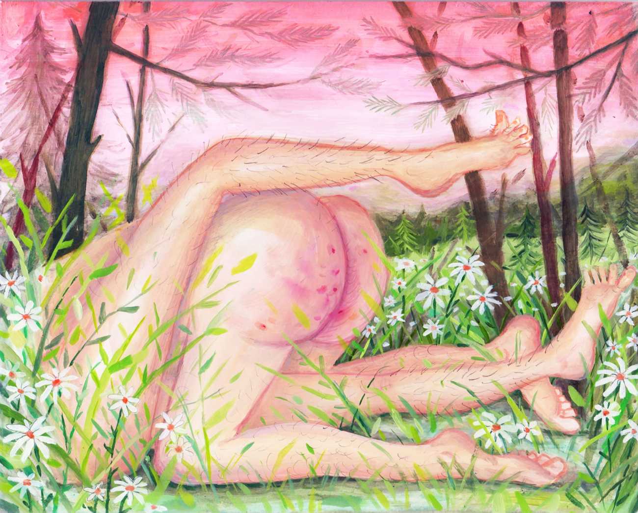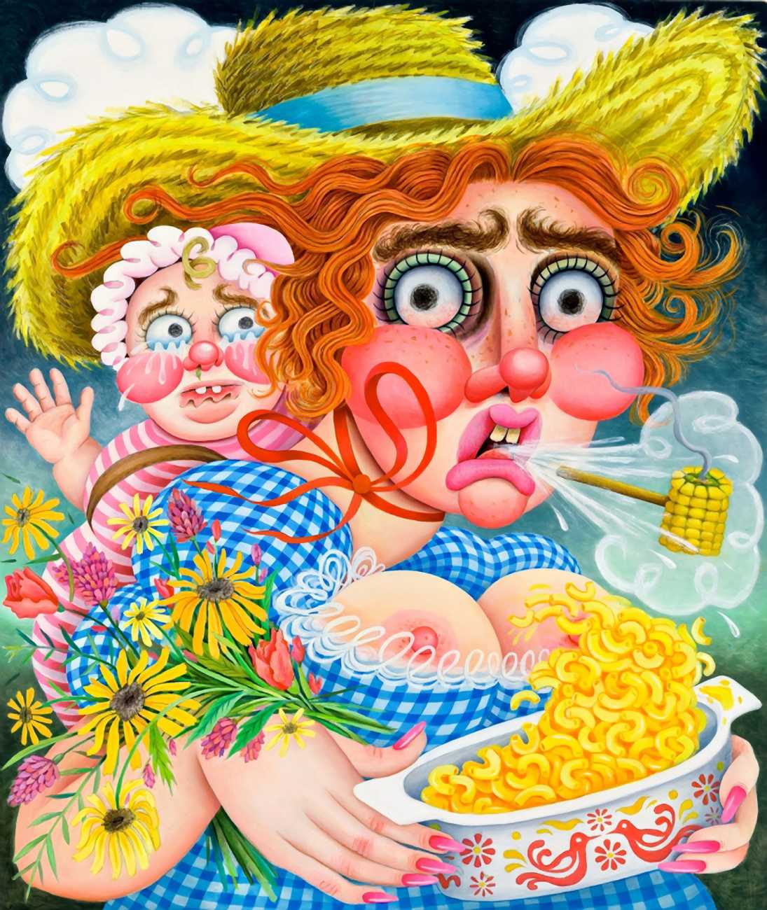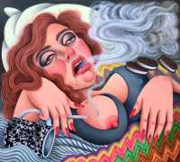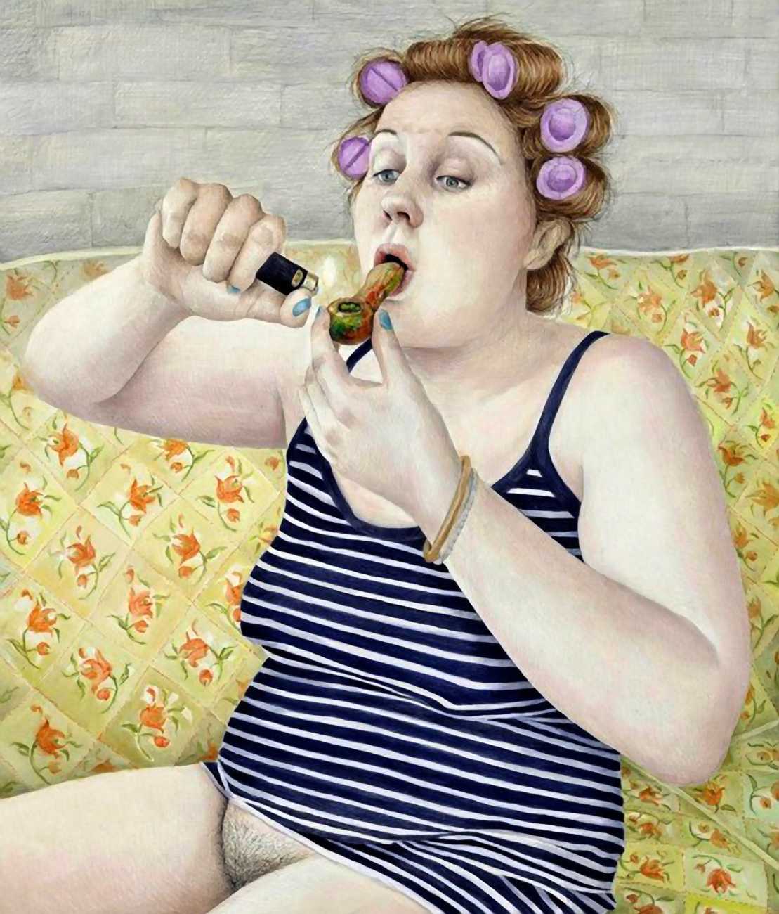 We show here a representative selection of Rebecca Morgan’s paintings, including realistic self-portraits of a confident, naturally-curvy young woman, bright paintings where the colour covers the whole canvas, like Self-Portrait as Bernini’s Ecstasy of Saint Teresa, Face Unwashed, Smoking and Eating Oreos in Bed (2019) and You Can Have It All (2020), and her trademark mountain-folk offerings including Reclining Mountain Man (2016) and Mountain Love (2014).