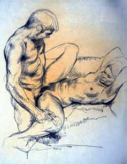 Three months before the show, the drawings numbered eighteen and I had four in the works. Since I’d set twenty as my goal, I was on schedule. The erotic content of my art was quite modest: a kiss, sexual intercourse and oralsex. No genitals showed except one couple embracing where the man had an erection. I’d drawn that one for women to enjoy. Meanwhile Dimitri, an artist friend was designing the invitations with the perfect title: “The Love Picture Exhibition”. Everyone was for love even if they didn’t know what the word meant. When they saw my drawings they’d at least get to see images of sexual love which would be a positive experience for most people.’
