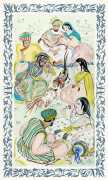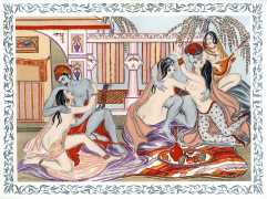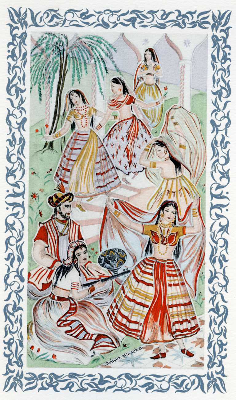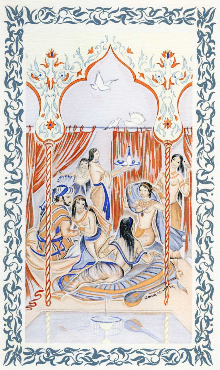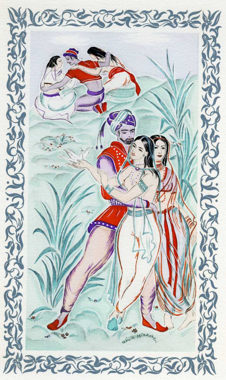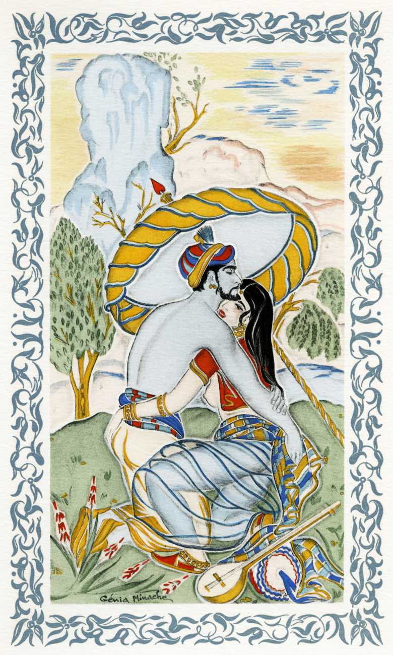After the success of the Minache-illustrated Omar Khayyám, the Kama Sûtra was an obvious sequel, and so this edition of the Indian classic, heavily abridged by Michel Dubessy, appeared three years later. Again Génia Minache created a suite of oriental-style watercolours, which have very little precisely to do with the text, but are still subtly seductive.
