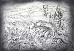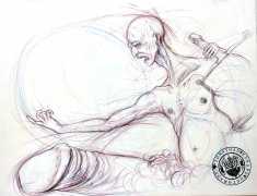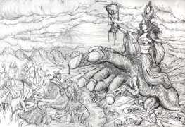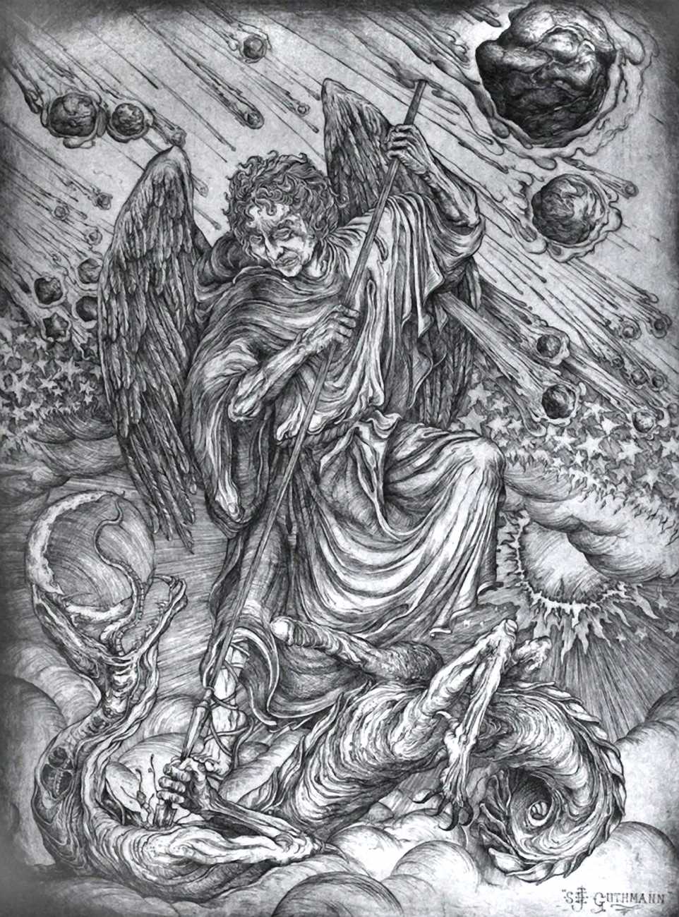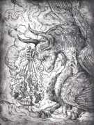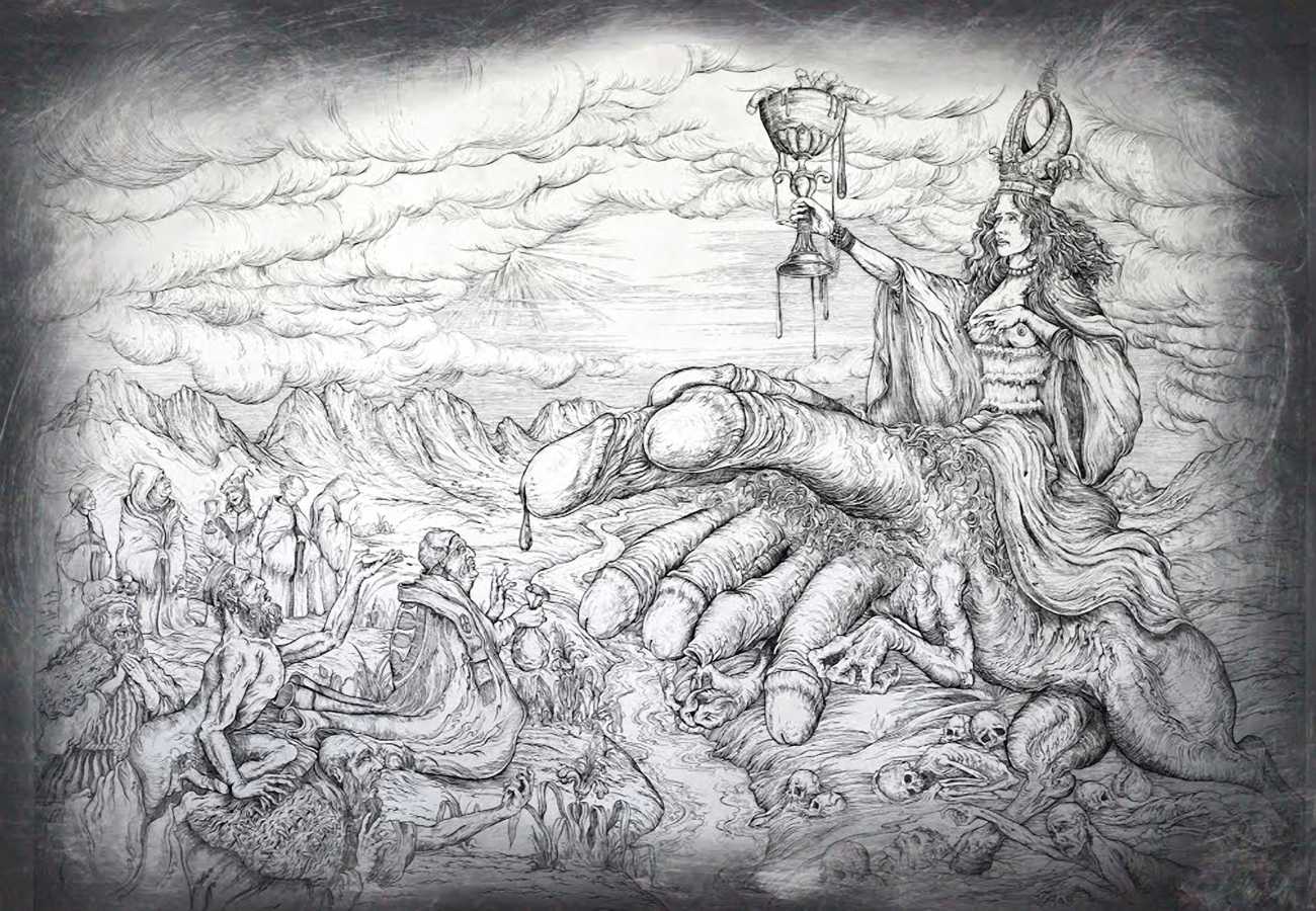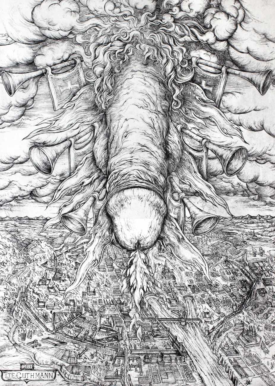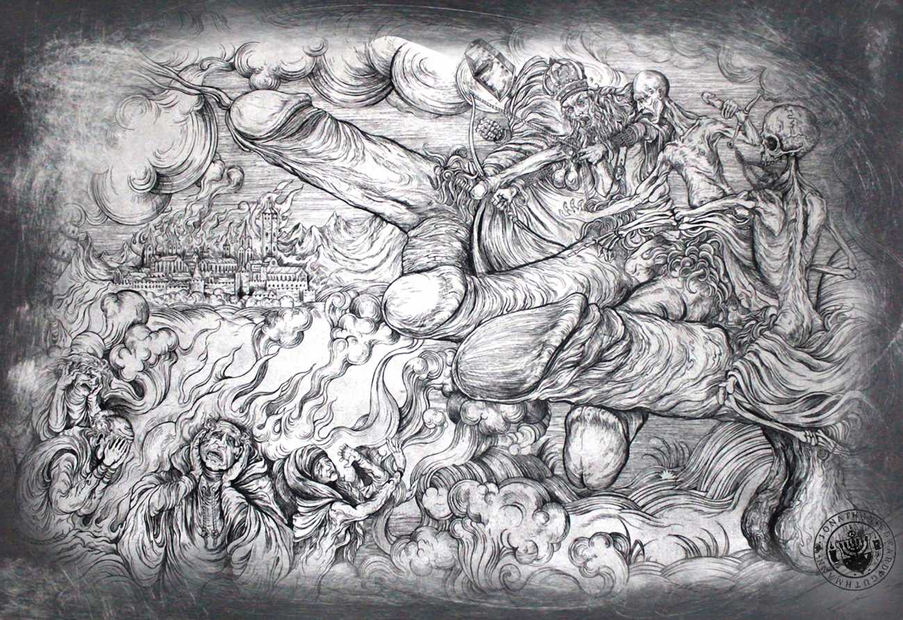 Central to The Book of Revelation are the Four Horsemen of the Apocalypse – Death, Famine, War and Conquest – and in reframing them as the Four Horsemen of the Acockalypse Guthmann raises the uneasy question of the relationship between masculinity and domination. Following the Horsemen, and each in the three stages of drawing, painting and etching, we have the Acockalypse itself, destroying the Holy City, and two versions of the Whore of Babylon, ‘The Mother of Prostitutes and Abominations of the Earth’ according to Revelation Chapter 17. Then we have The Acockalypse Descending on Paris, a direct reference to the 1880 engraving by Félicien Rops, ‘Satan semant l’ivrai’ (‘Satan sowing weeds’) which you can see here. Though less intrinsically erotic, the sequence shown here concludes with St Michael and the Devil (compare it with the Jacob Epstein sculpture at Coventry Cathedral), The Angel Binding Satan, The Redemptive Lamb, The Winged Creature Like an Ox, The Sea Giving Up Its Dead, and The Last Judgement.