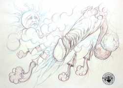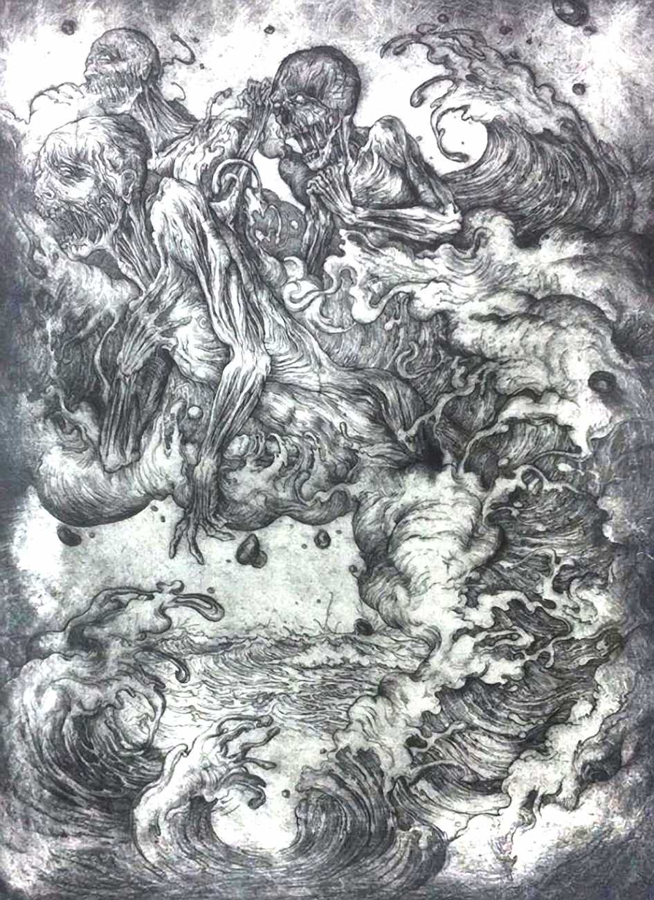 The etchings show a remarkable skill with the technique, producing detailed images which remind the viewer of Albrecht Dürer and Rembrandt van Rijn. Here is how Guttmann explains the process he uses: ‘Etching is a printmaking technique that has been around for centuries. You begin with a flat sheet of metal (I personally use copper), which is covered in a fine layer of bitumen. You then use a sharp instrument to selectively scrape away the bitumen revealing the copper. Once you have created an entire image by scraping away the bitumen, you place the entire sheet in a bath of liquid that is highly corrosive to metal but will not affect the bitumen, this liquid then bites into the areas where you have exposed metal, leaving a network of incised lines. This process can be repeated multiple times with new lines being added between each etch, meaning there are various depths of line work in different areas. Then the bitumen is removed and the newly created lines in the metal plate are filled with a very stiff ink and the plate is firmly pressed against a piece of wet paper with the aid of a press, then the image is firmly imprinted onto the paper.’