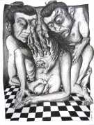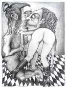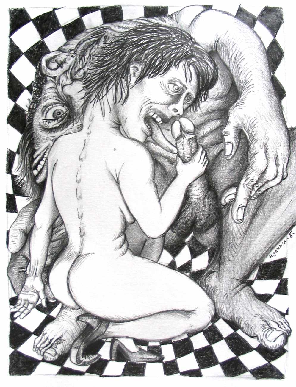 J’aimerais vivre dans un film porno et mourir d’extase plusieurs fois par jour (I’d Like to Live in a Porn Movie and Die of Ecstasy Several Times a Day), to give it its full title, is a small series of five pencil drawings, not Patrick Jannin’s usual medium.