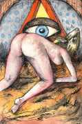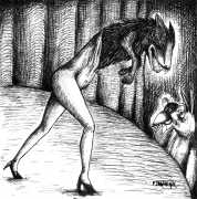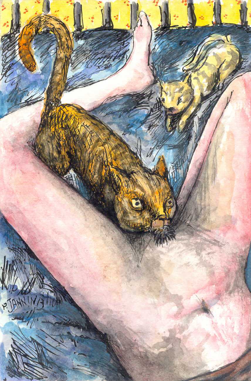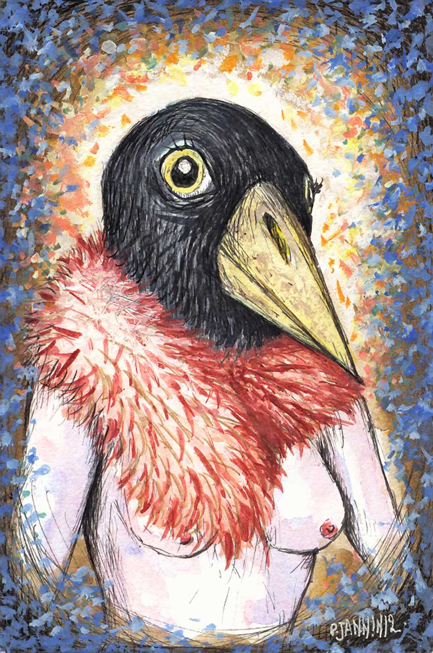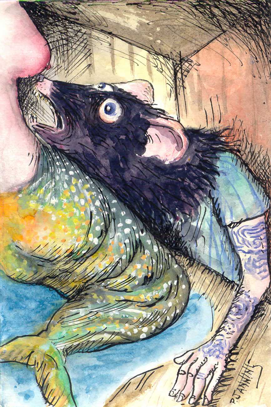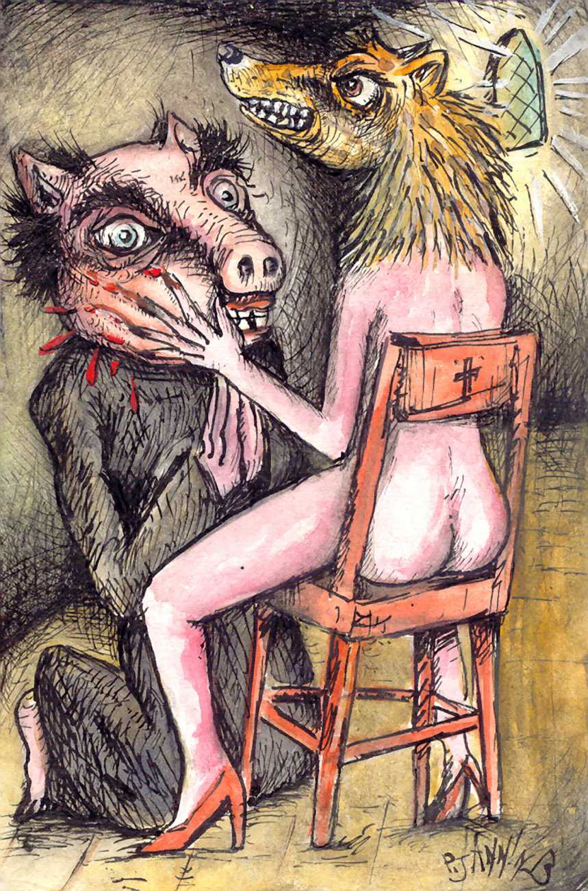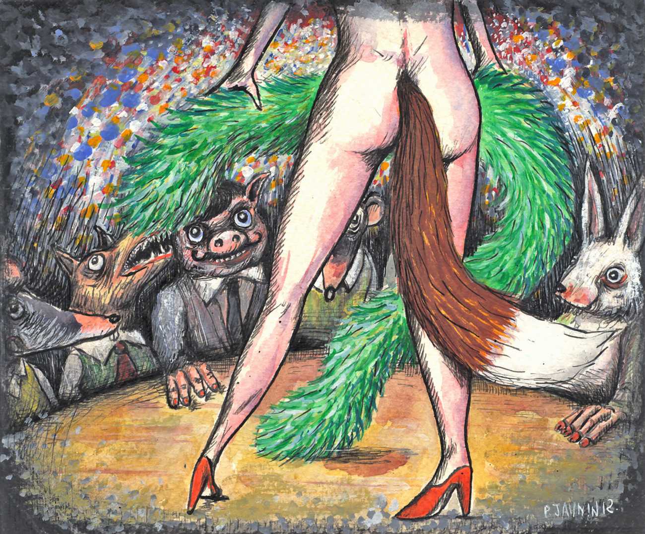 He writes, ‘Are we really talking about pleasure, or about its consumption? Surely the whole point is making money. So my brothel is in a sort of hell. The beings who inhabit it, customers as well as prostitutes, are all decked out in animal heads. So my pictures look as much like the drawings in scary children’s books as they are images of any actual brothel. Plus I like drawing buttocks, so I had fun with those.’