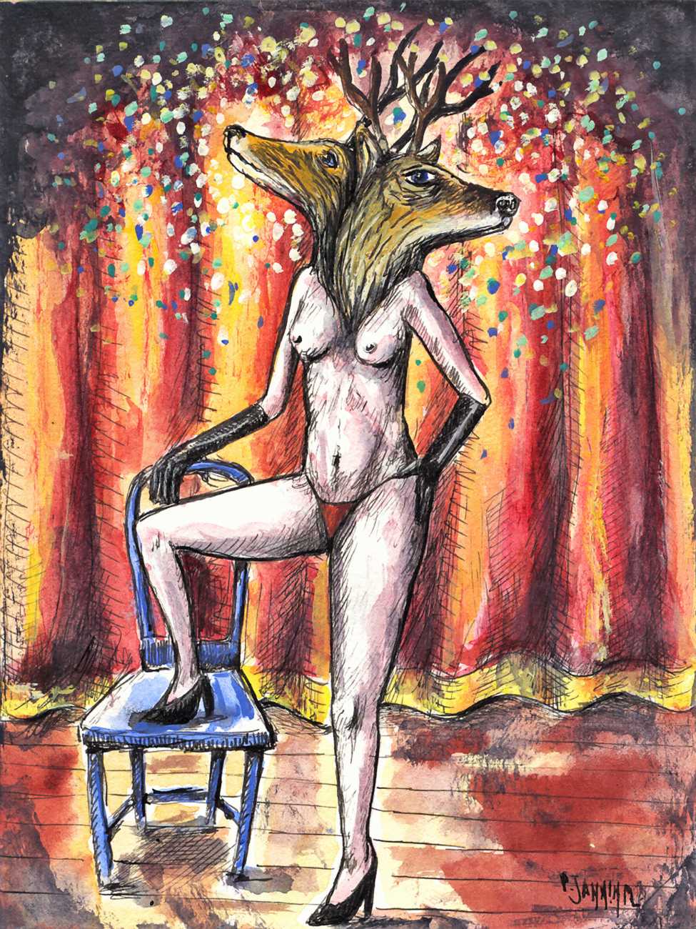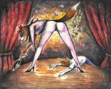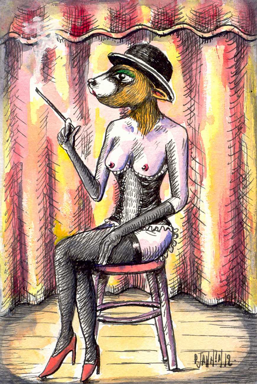 The titles – Un Boxon d’Enfer and Striptease – were set by the gallery, but as Jannin prefers not to be limited by other people’s titles, and by his own admission has never set foot in a brothel or a striptease club, he chose to let his imagination loose on the whole idea of sex being for sale. As he explains, he prefers to keep his fantasies grounded in the real world.