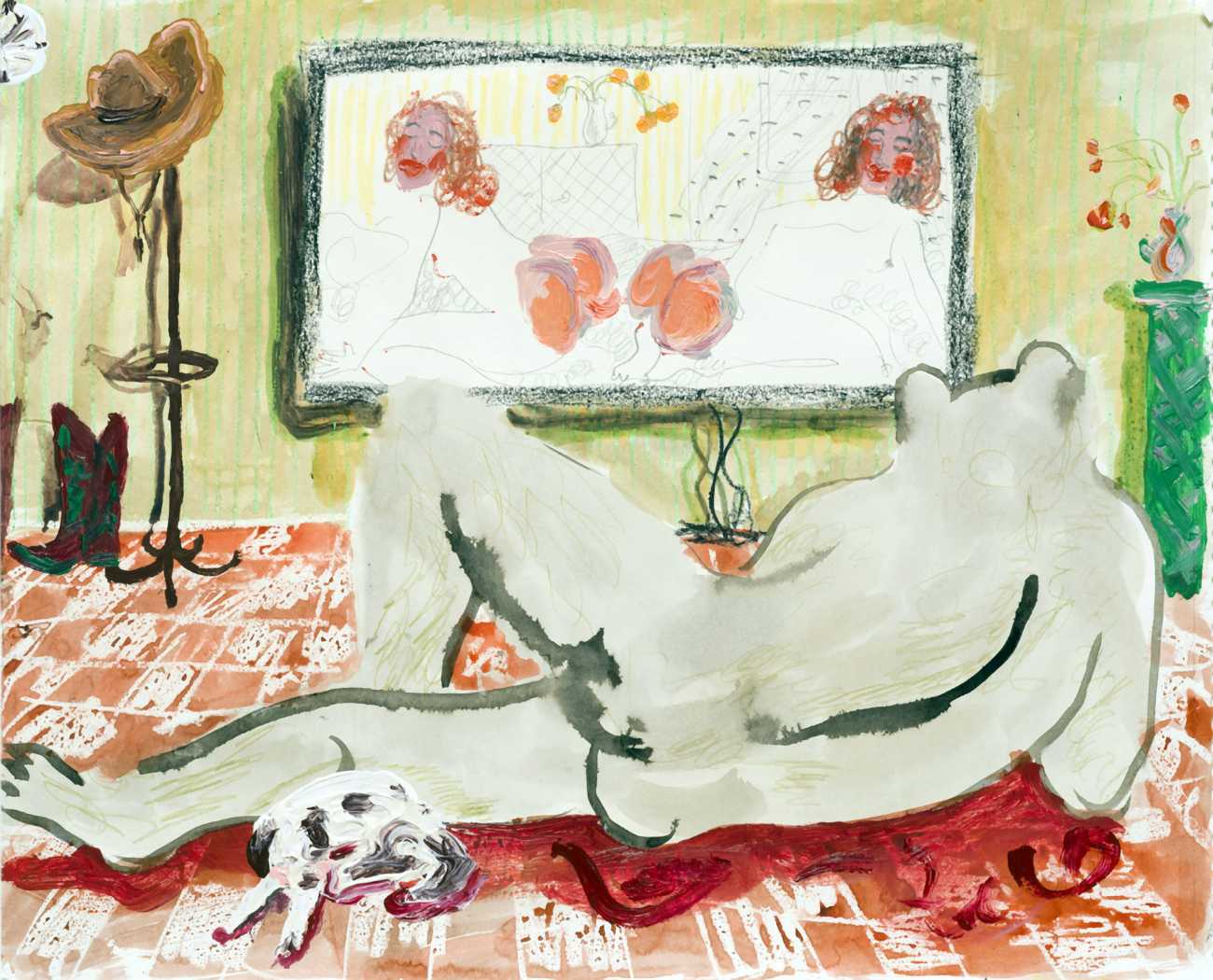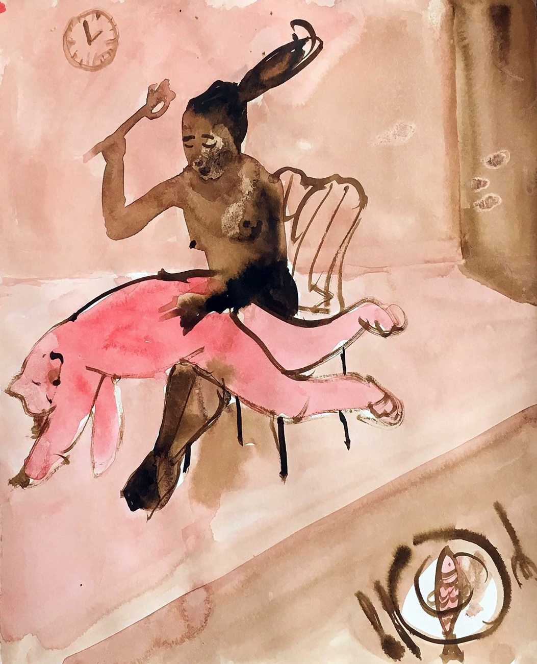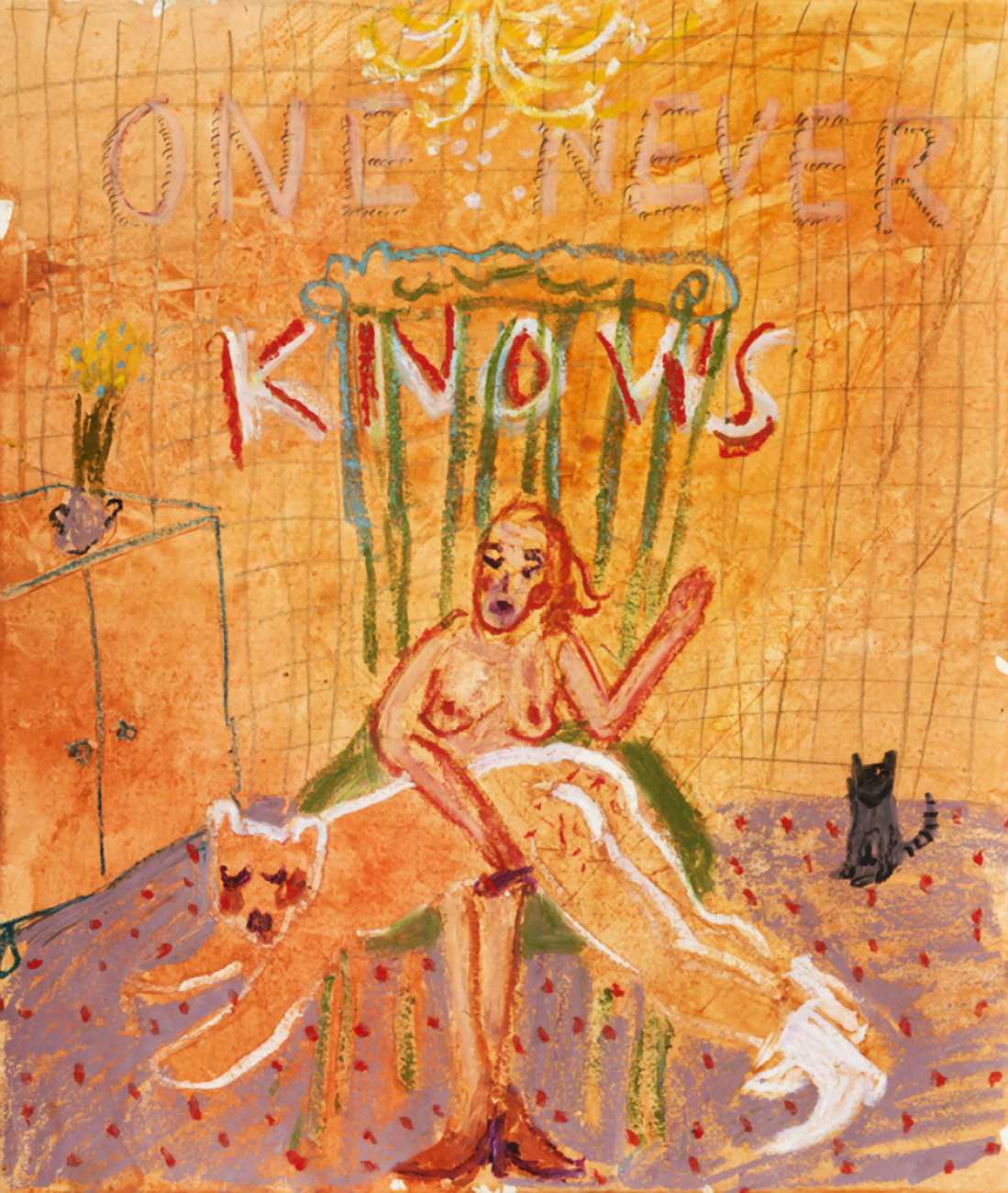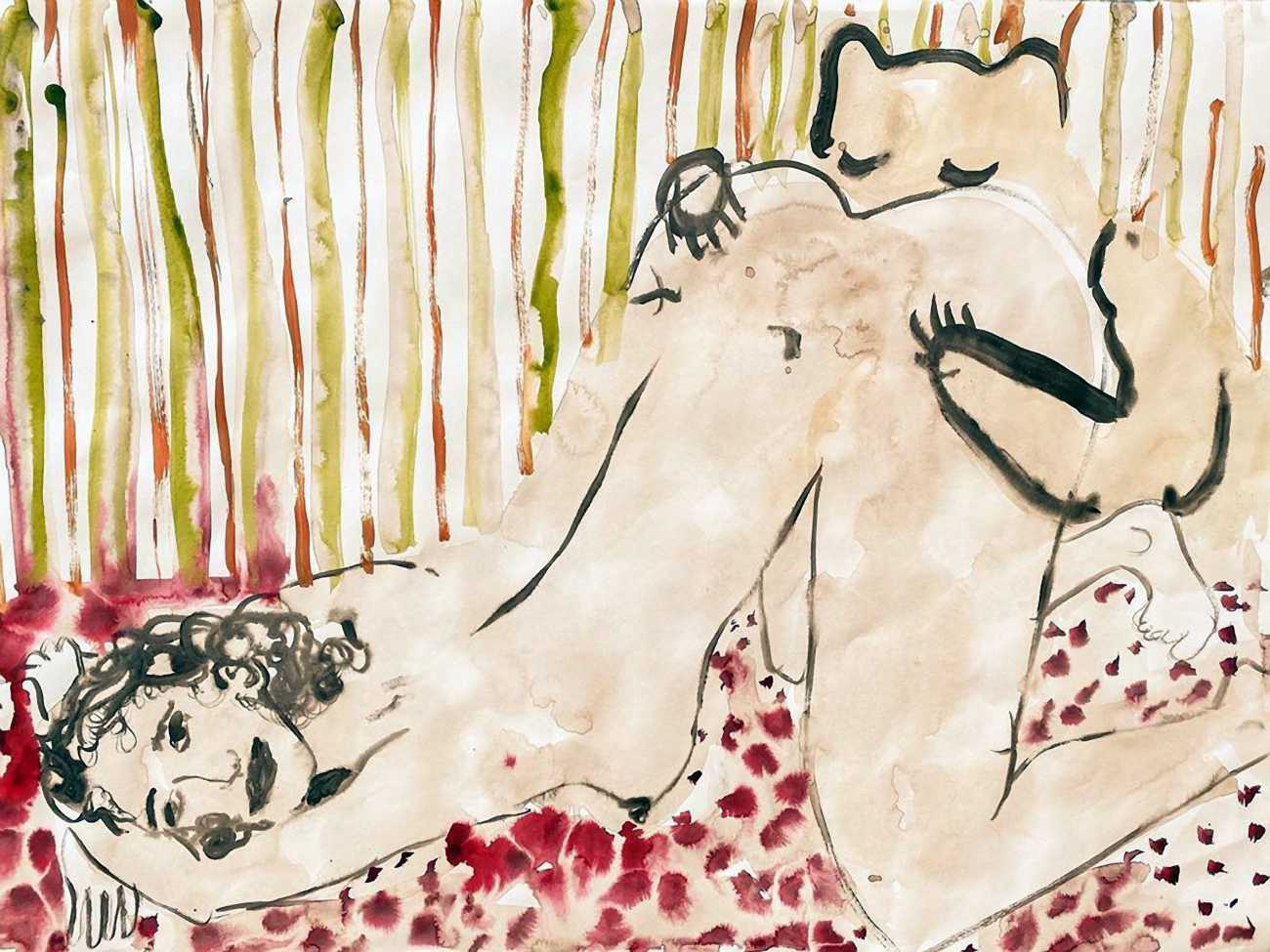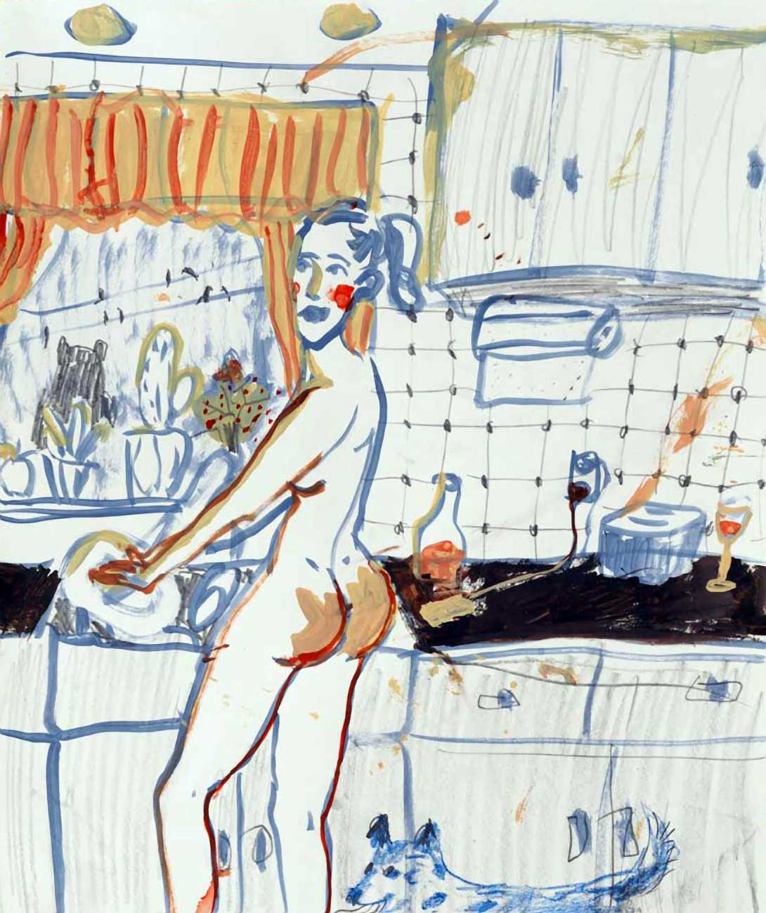 ‘Secrets of a Happy Household’ is the title of a 2020 exhibition shown at the Berlin gallery of Dittrich & Schlechtriem, which presented a series of works on paper in variations of ink, pencil, watercolour and acrylic, combining candid reality with psychological fantasy. As the introduction to the exhibition explained, ‘She uses honesty, fantasy and humour in her painting practice as tools of survival, the key to a tongue-in-cheek happy household’.