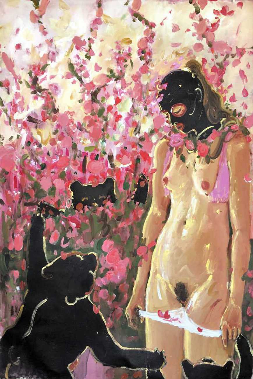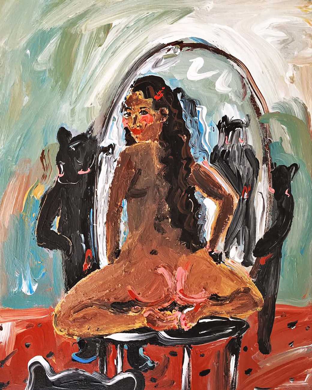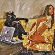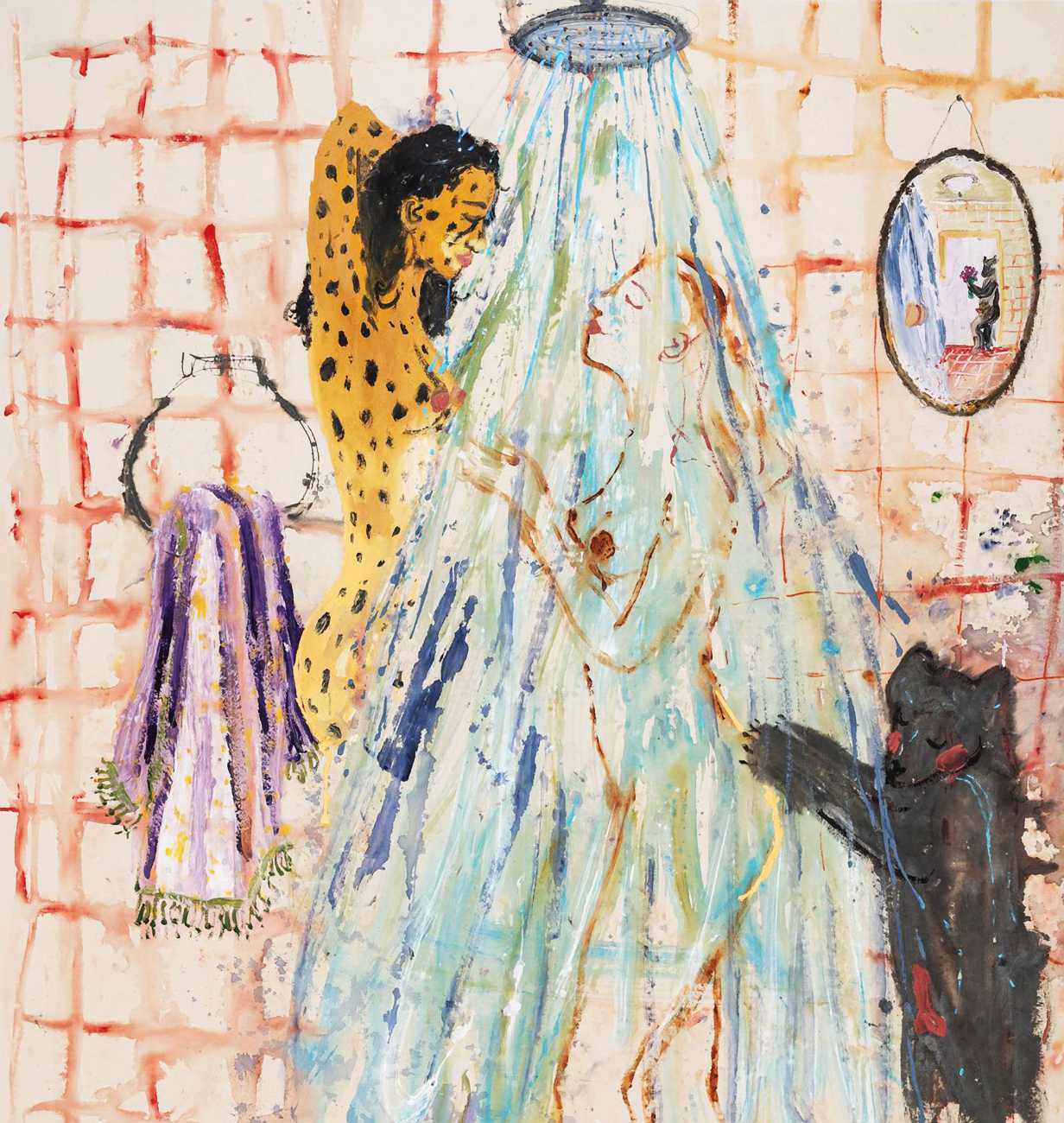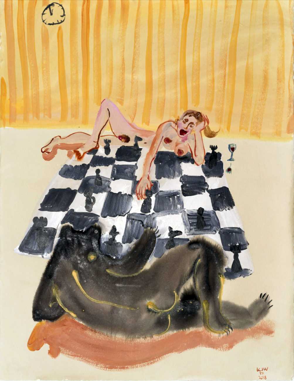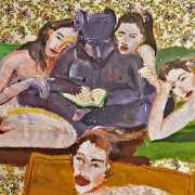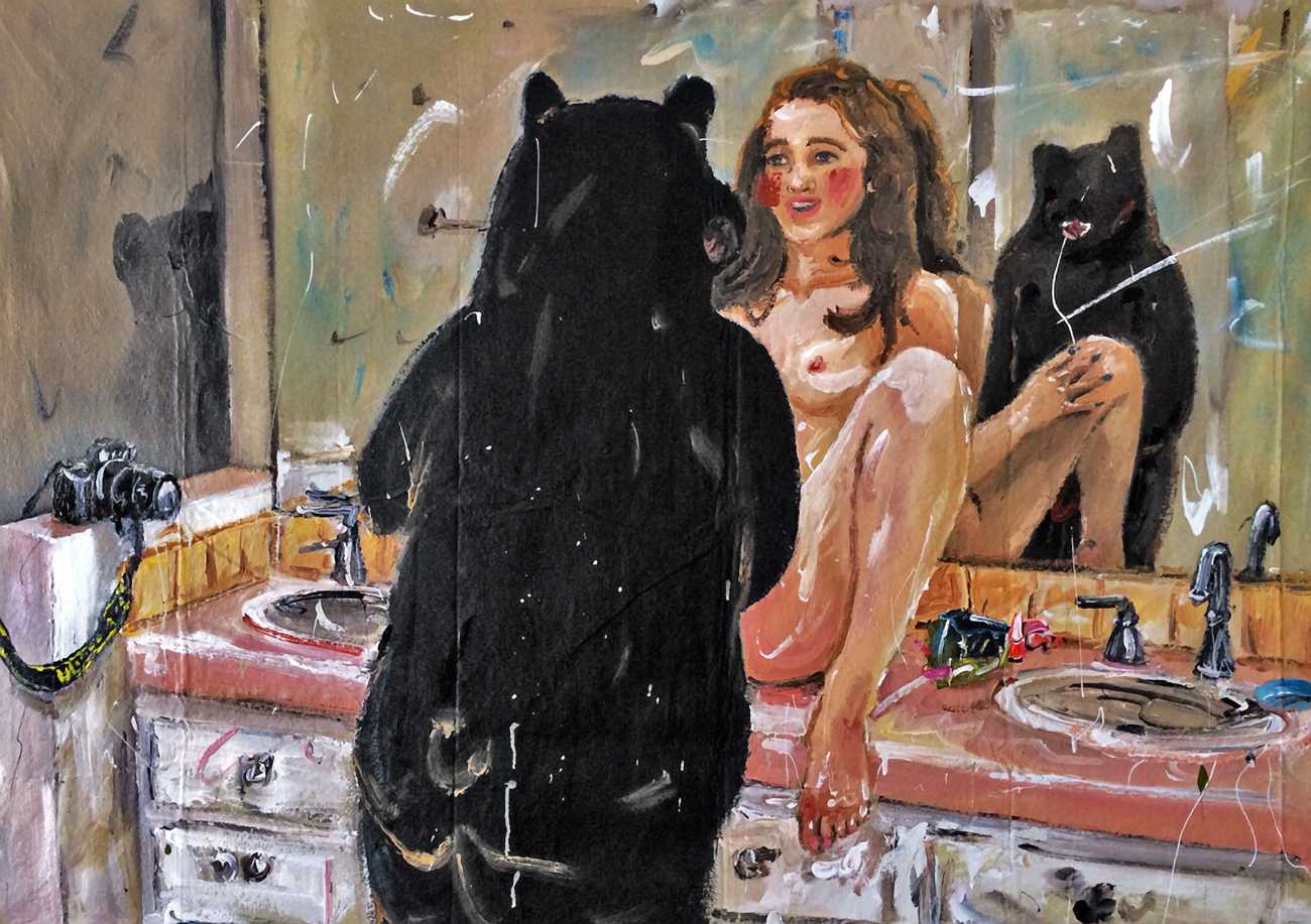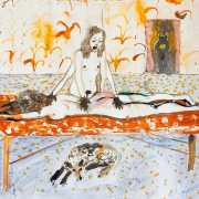 Stylistically varied, Katarina Janečková Walshe’s works can be quick diaristic depictions of everyday life. Others are patterned and layered, symbolic and allegorical, articulating a larger narrative on identity, femininity, and the complexities of power. Bears, snakes and dogs regularly stand in for men, while the women remain in focus and control. Deliberately, often provocatively, the artist and her subjects direct the viewer’s gaze, allowing a connection to and reflection on sexuality and identity.