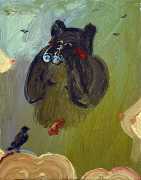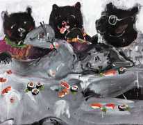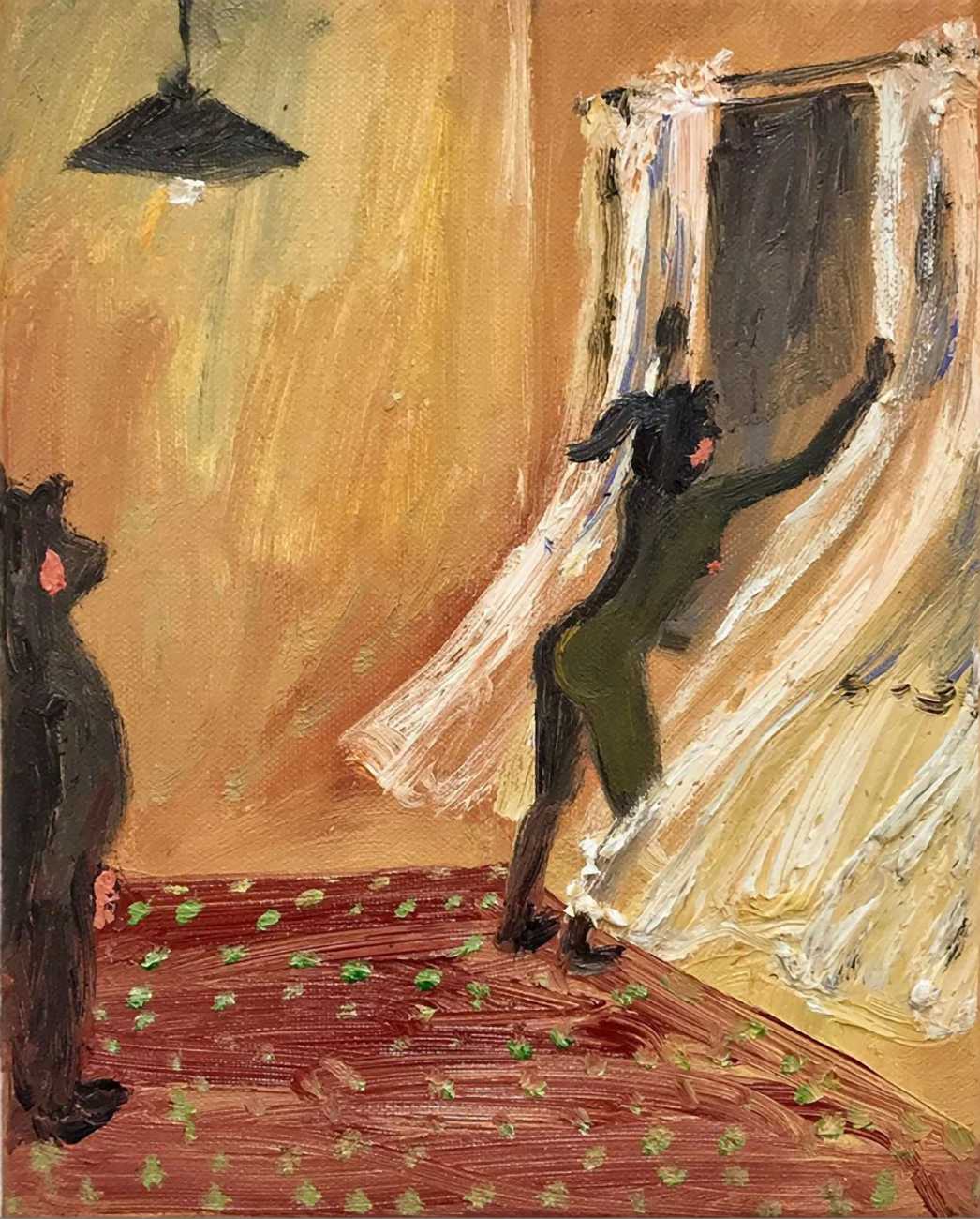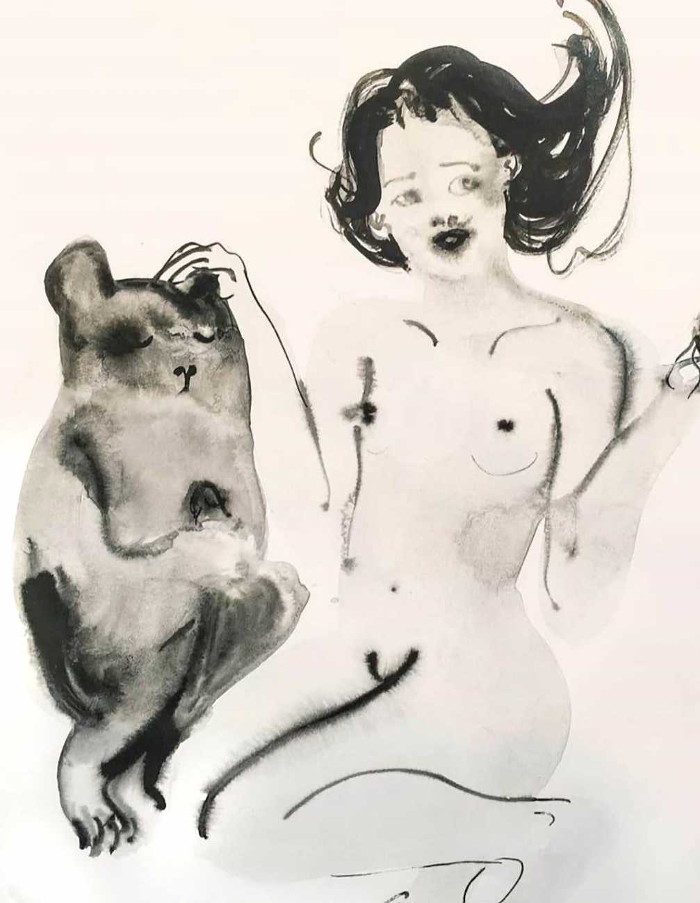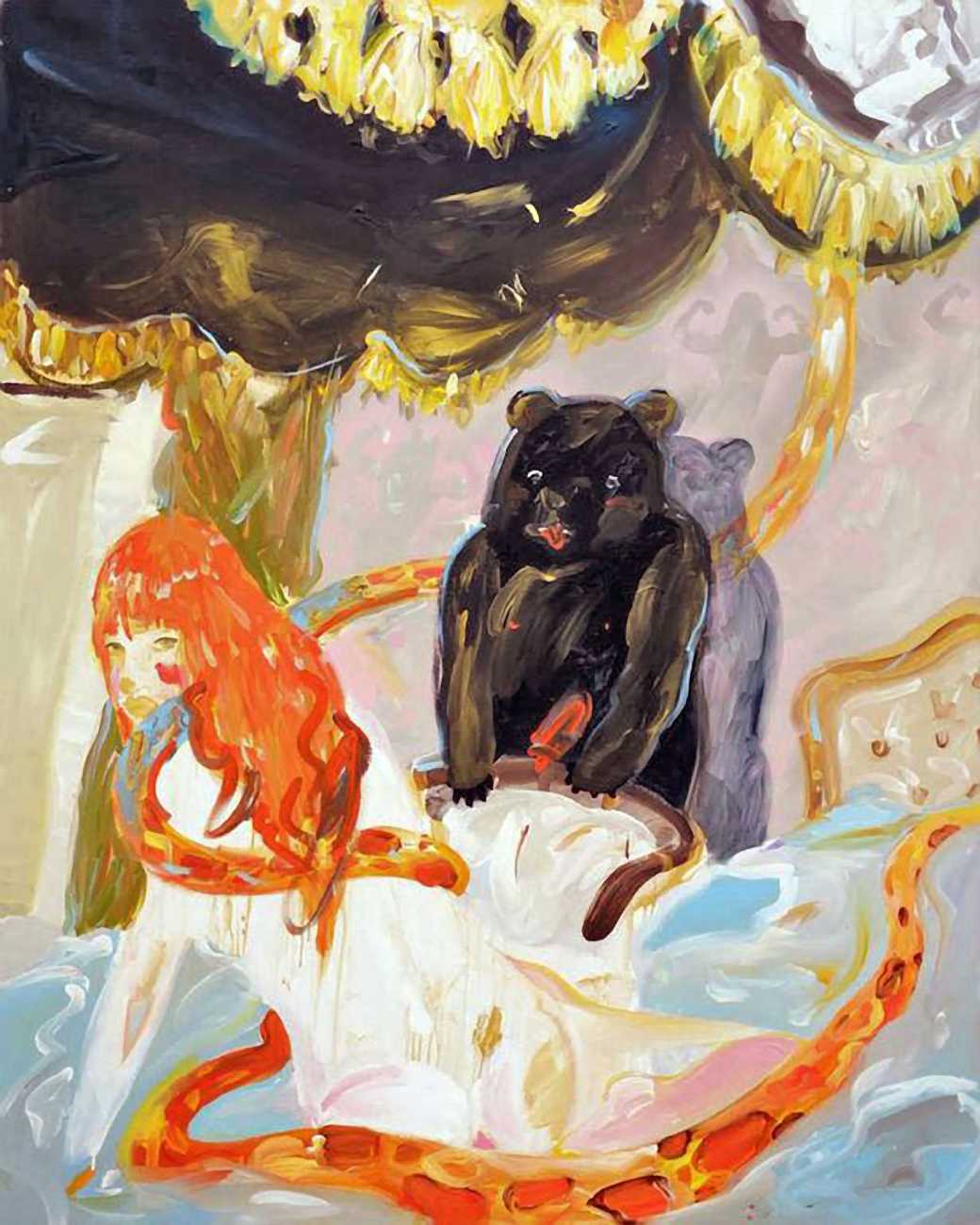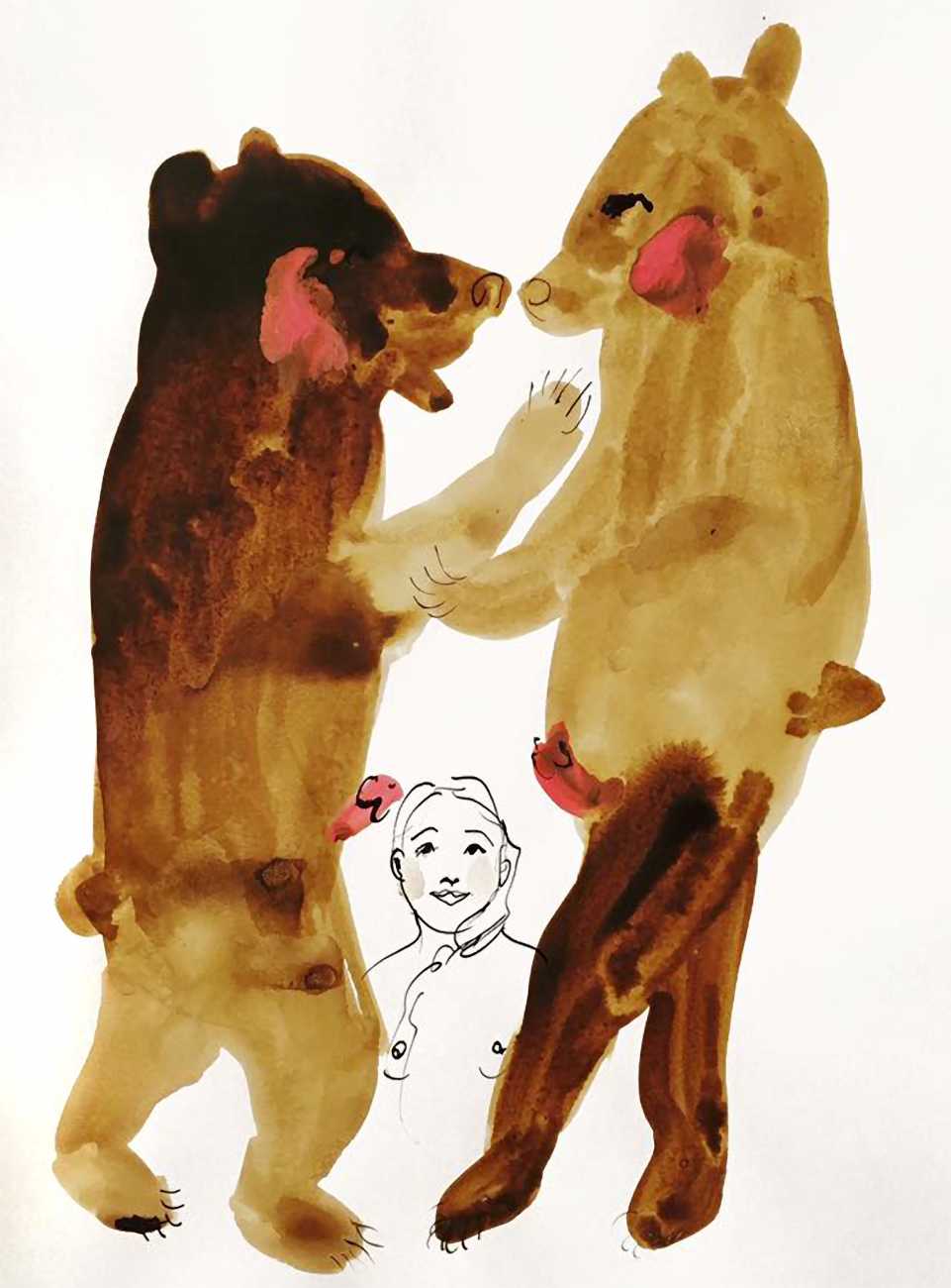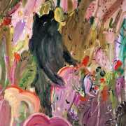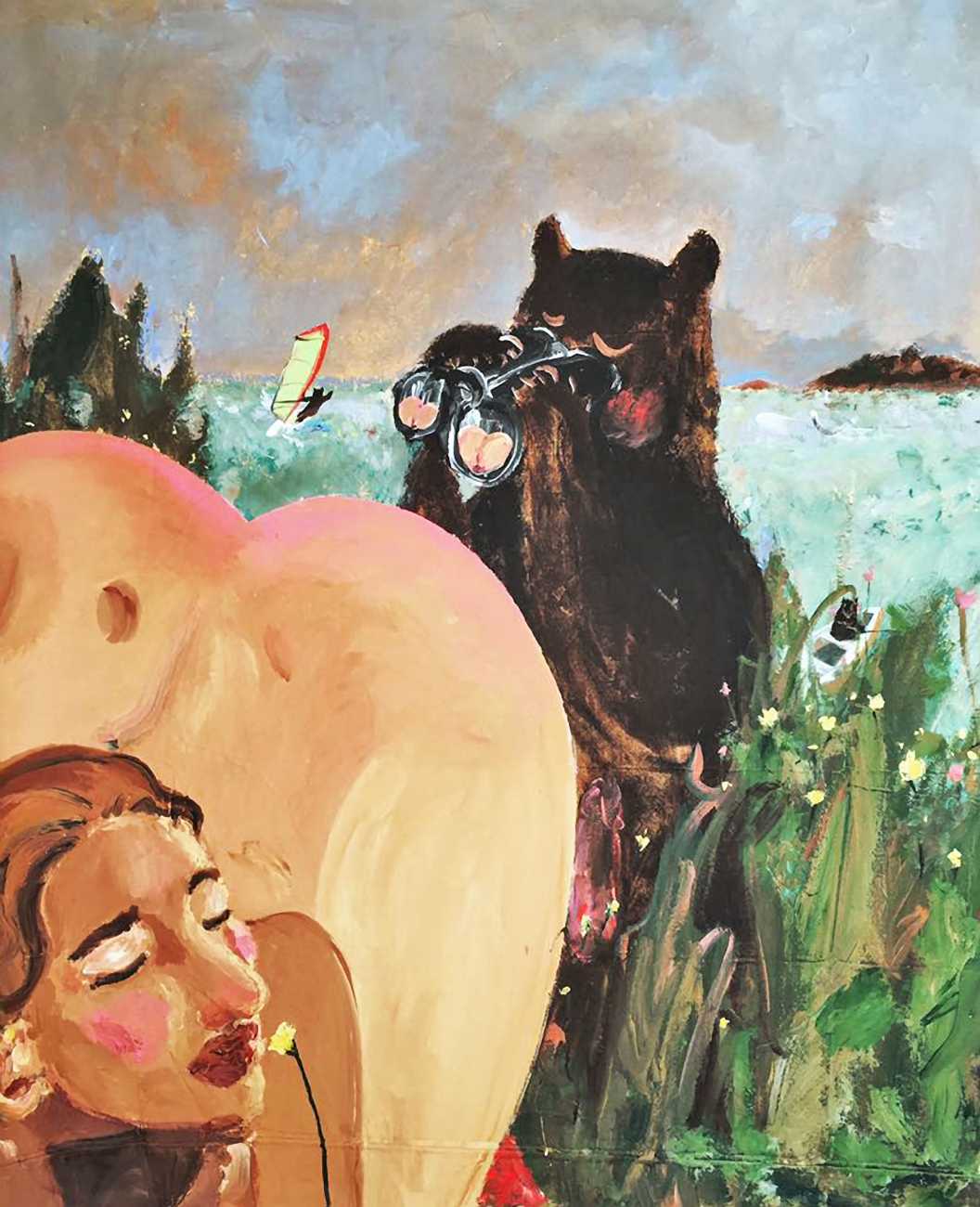 As she says in a video recorded for the ‘Secrets of a Happy Household’ exhibition, which you can see here, much of her work is a way of channelling anger into loving criticism. And she explains the bears, so central to much of her work – ‘Bears started appearing in my work during my university studies; they have always served me as a mysterious replacement for a lover, a voyeur, some kind of protection. I enjoy how their simple black figures leave space for the viewer’s imagination, and mine too.’
