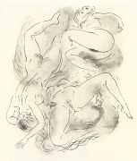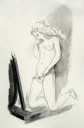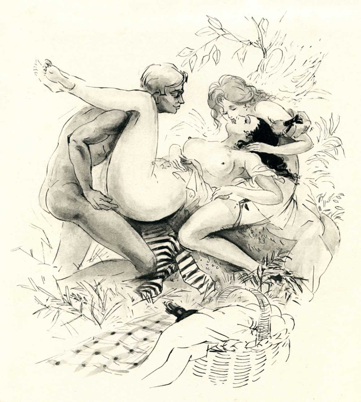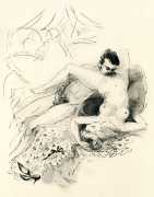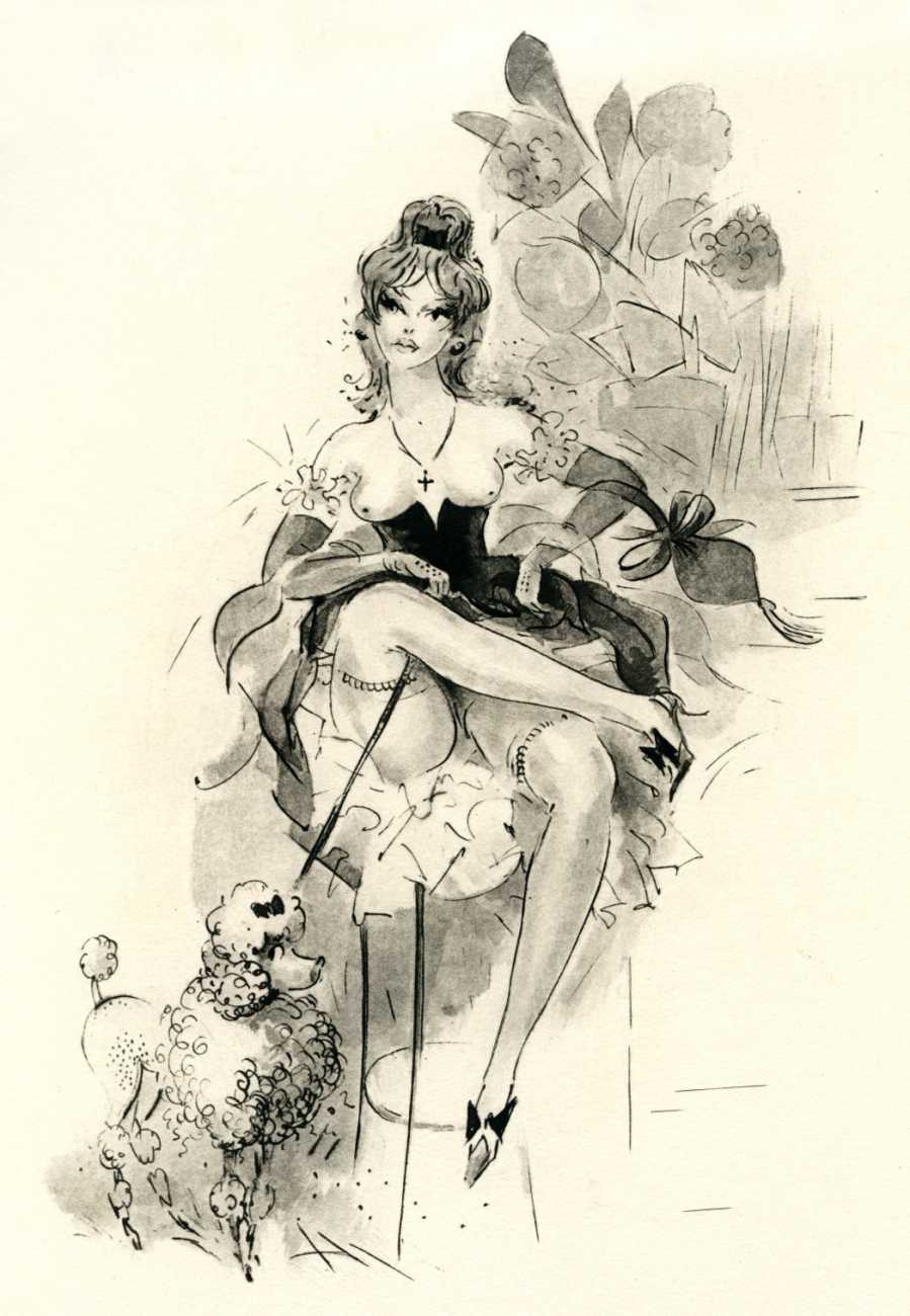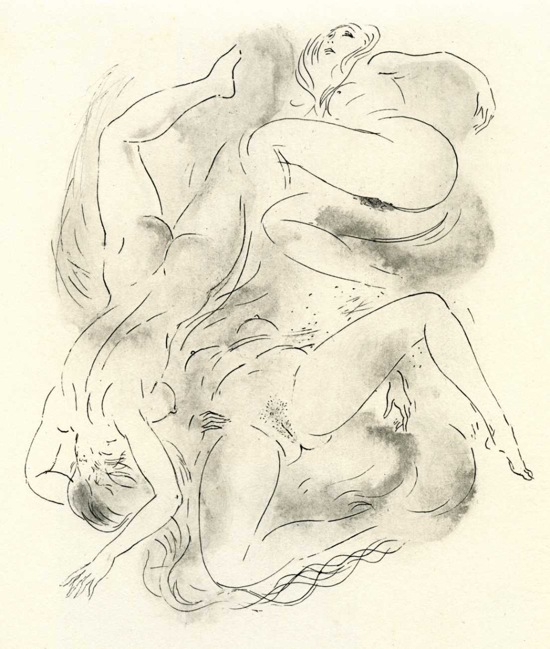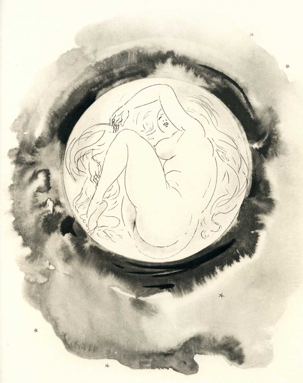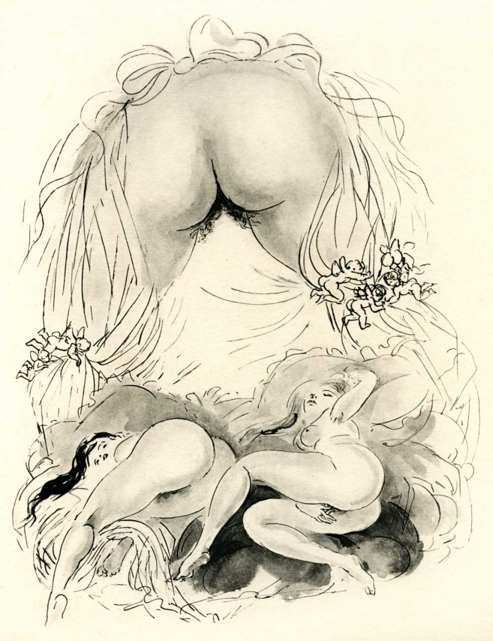 These illustrations show this talented artist at the height of her skills; though many are fairly standard compositions, two or three – the woman in the moon, for example, and the rear view of self-pleasuring (with cherubs) – are highly original, demonstrating that Amandine Doré was one of the exceptional erotic talents of the immediate post-war period.