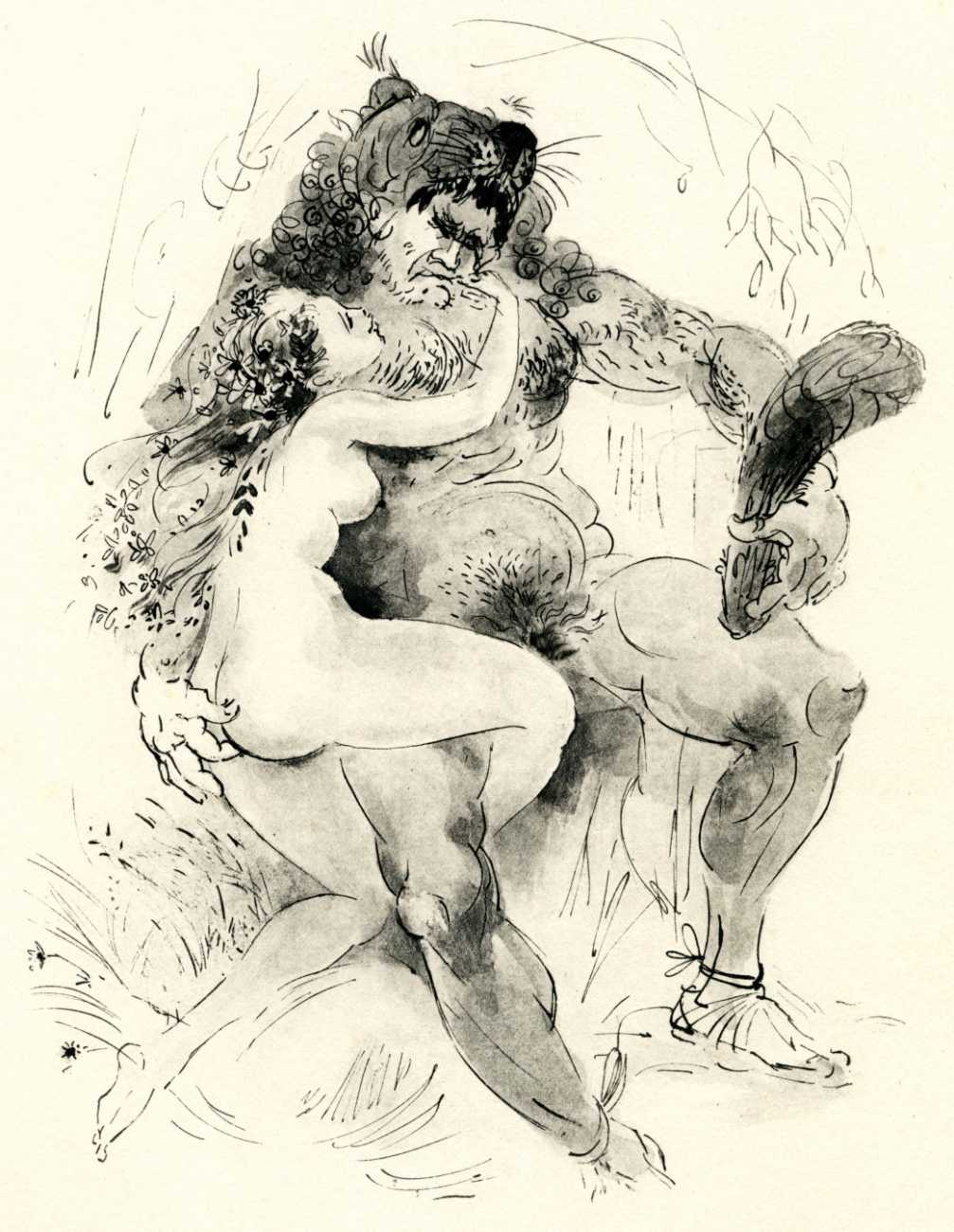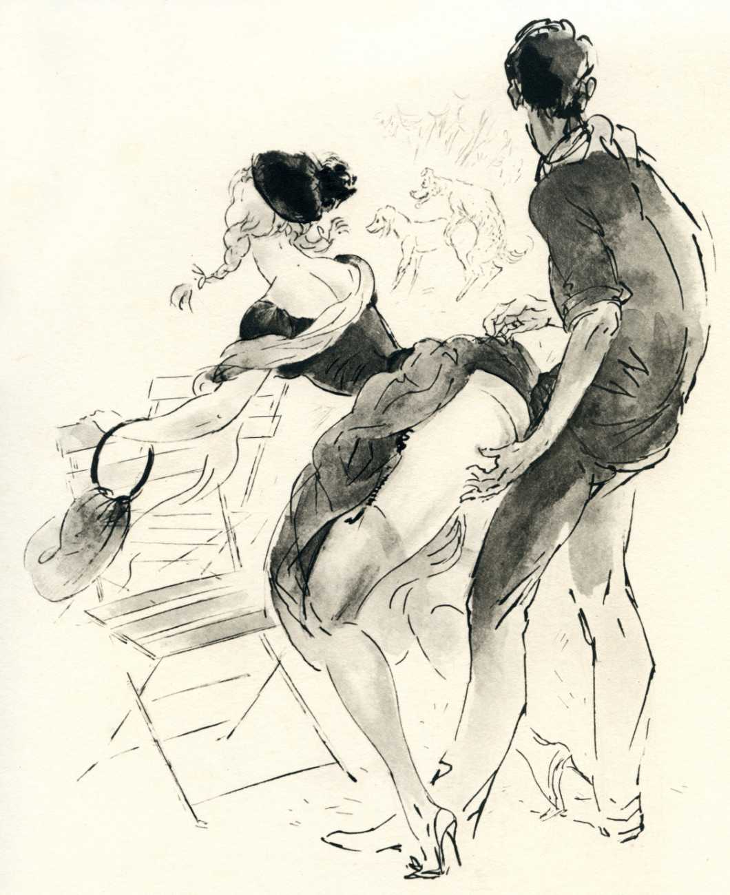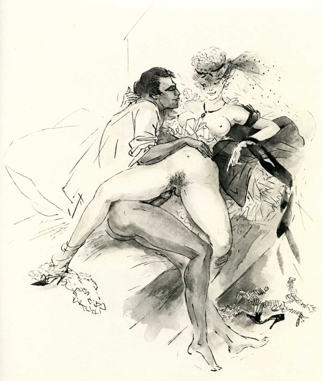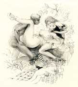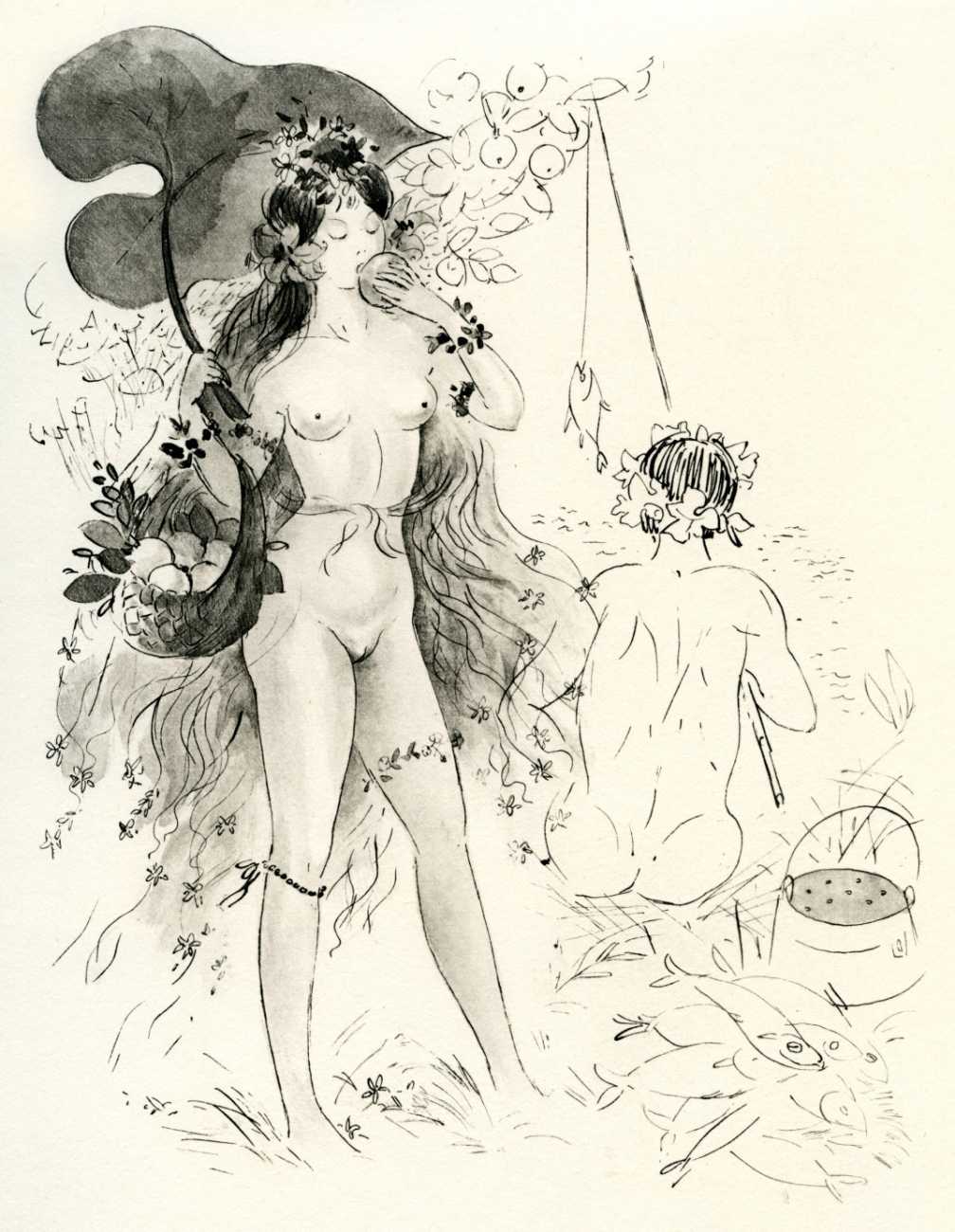 Florilège literally means the gathering of flowers, but over the years has come to refer to a collection of selected pieces of literary works, especially poems. That is what it means here, and is little more than an excuse to present several dozen mildly erotic poems, generally assumed to have been compiled by Amandine Doré’s husband Albert t’Serstevens (though just as likely a joint effort), alongside some of Amandine’s most original and explicit pen and wash drawings.