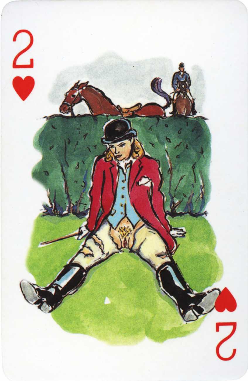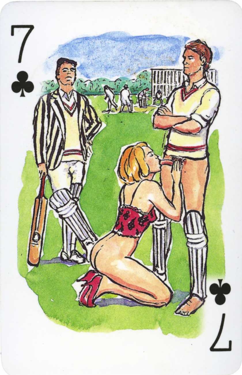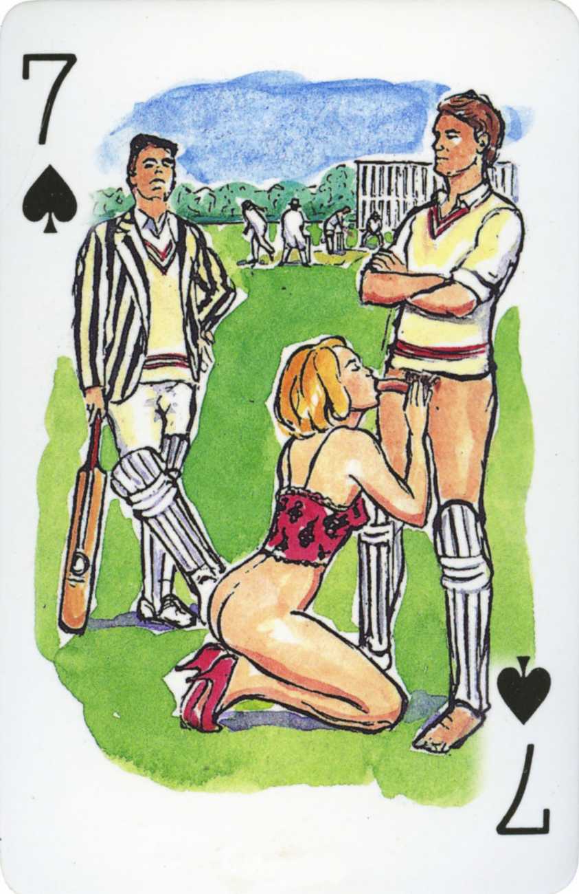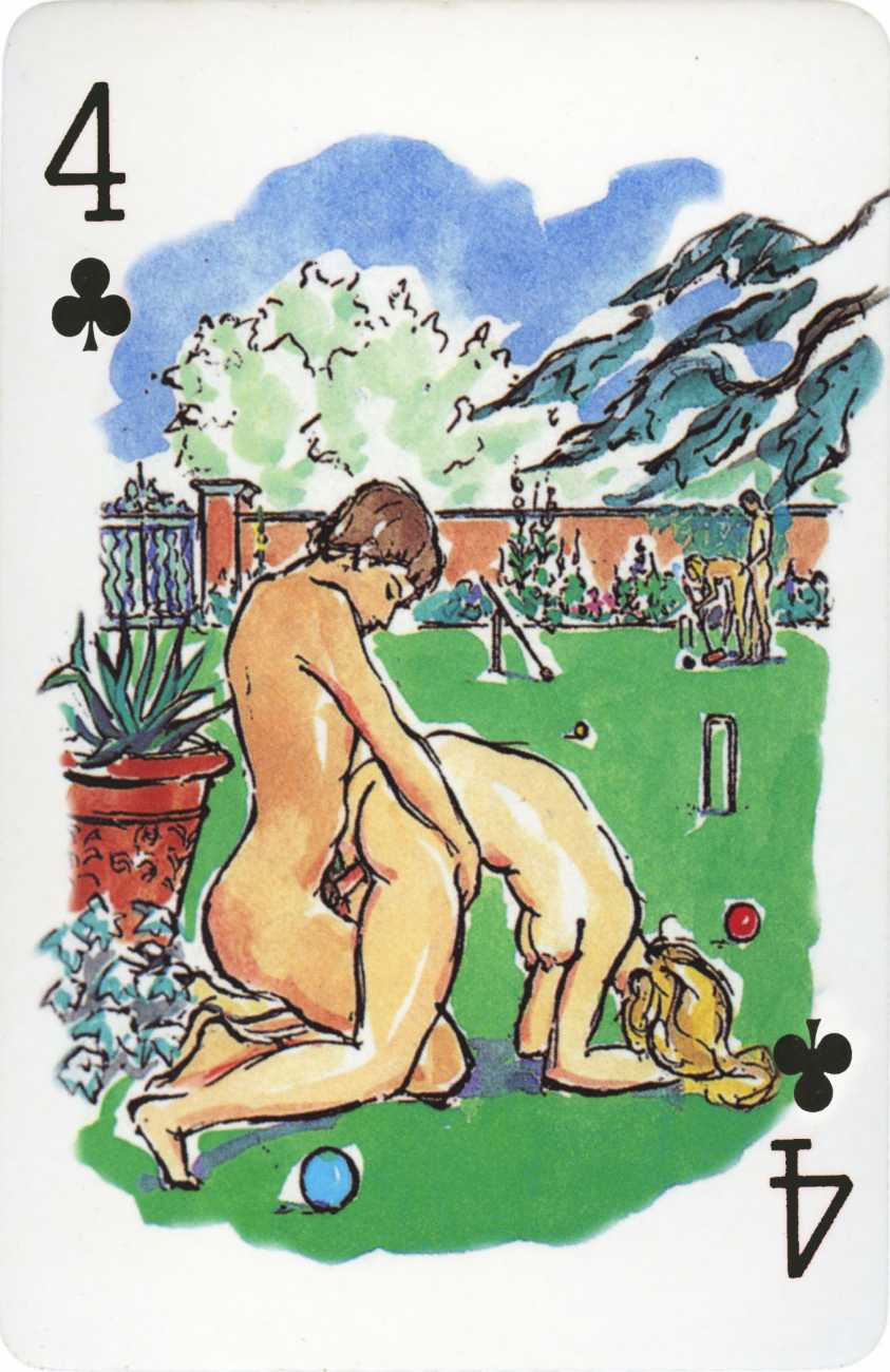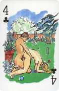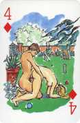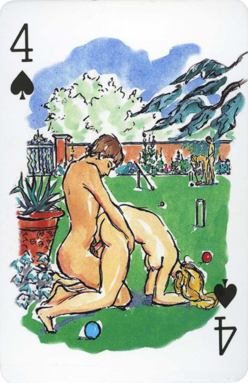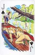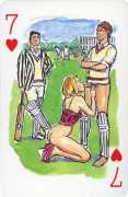 A Wicked Pack was the Erotic Print Society’s second offering of erotic playing cards, following Monica Guevara’s Black Box cards of two years earlier, which you can see here. The sports-themed paintings are not Sylvie Jones’ best, and the small format does not help; in addition the numbered cards from 2 to 10 repeat the same designs across all four suits, whether due to lack of time, budget or both we shall probably never know.