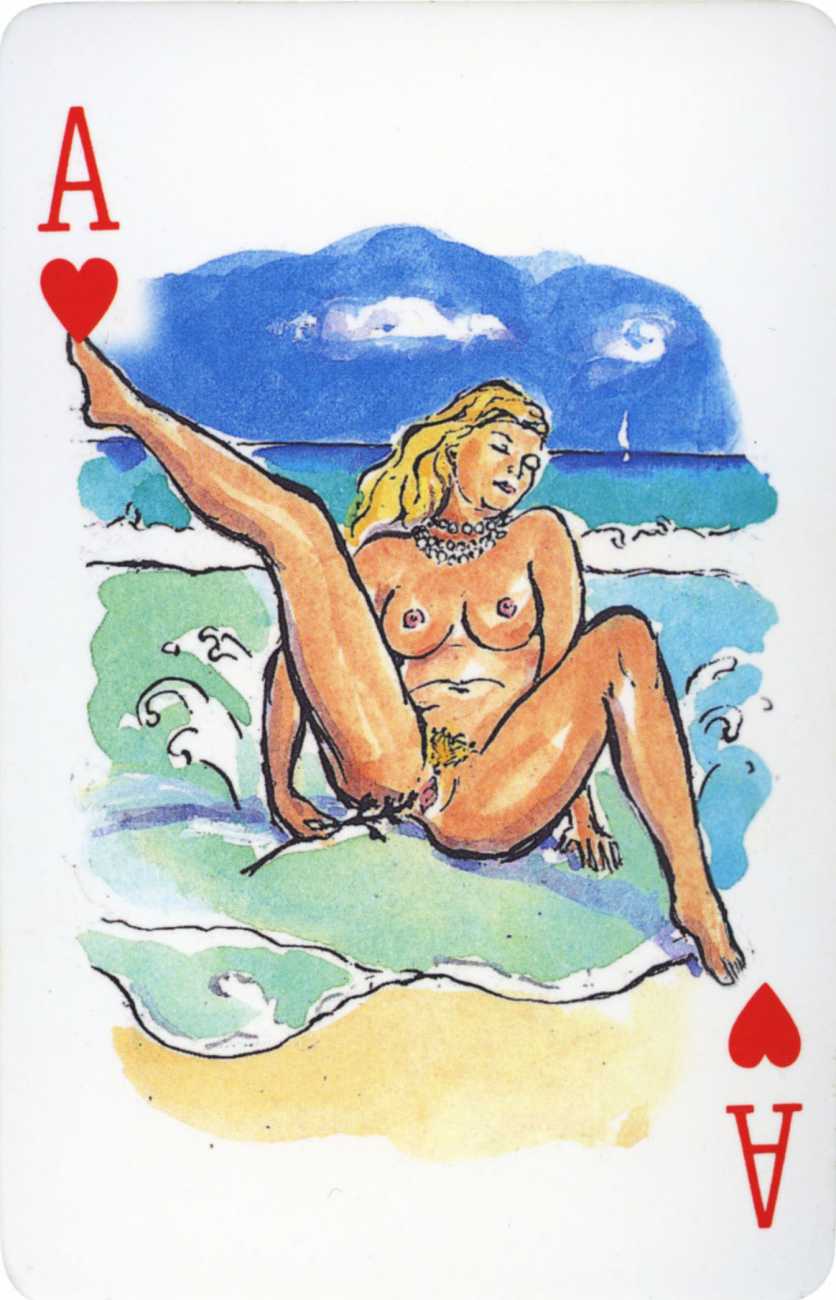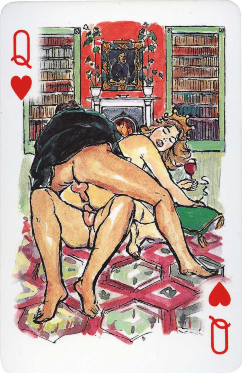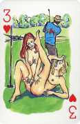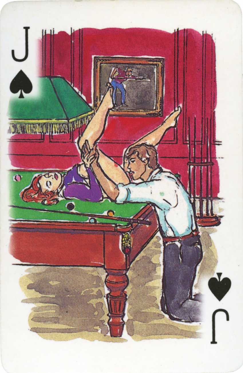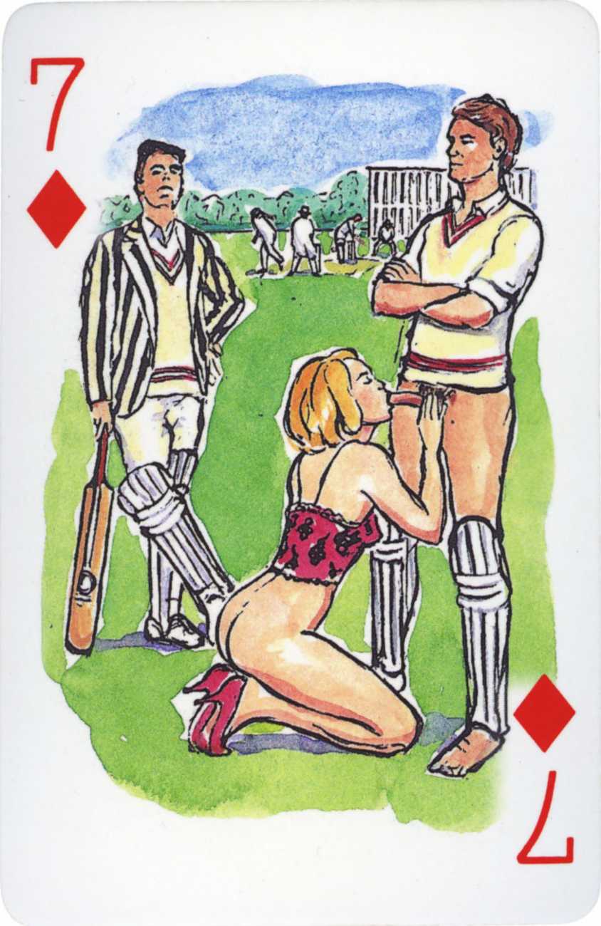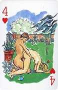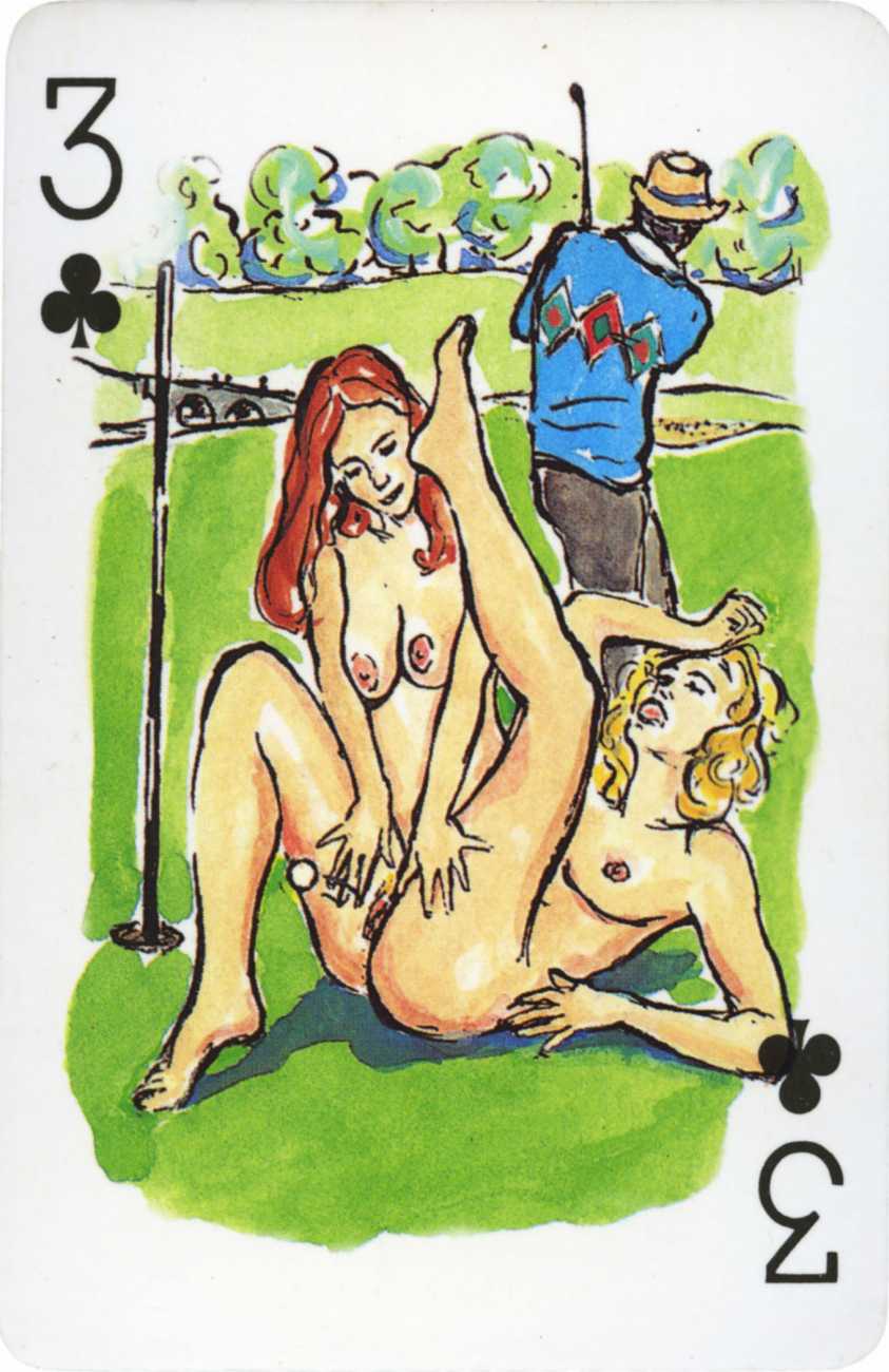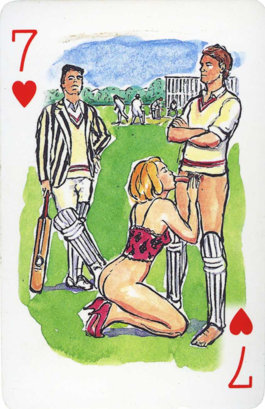 A Wicked Pack was the Erotic Print Society’s second offering of erotic playing cards, following Monica Guevara’s Black Box cards of two years earlier, which you can see here. The sports-themed paintings are not Sylvie Jones’ best, and the small format does not help; in addition the numbered cards from 2 to 10 repeat the same designs across all four suits, whether due to lack of time, budget or both we shall probably never know.