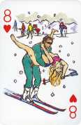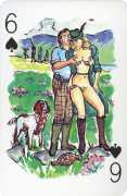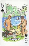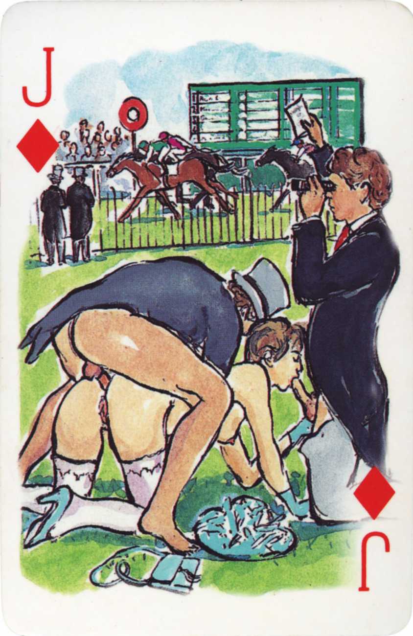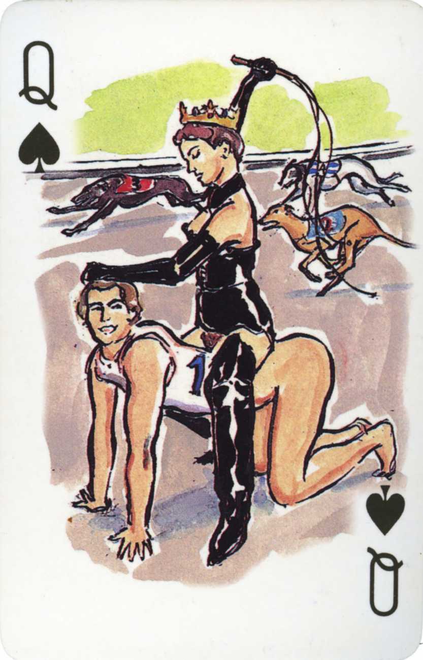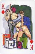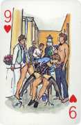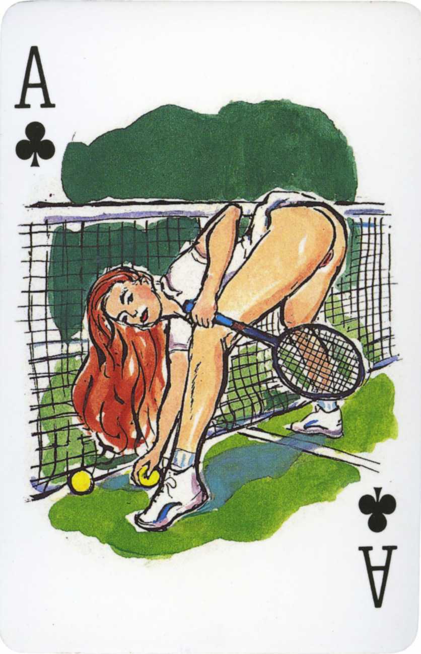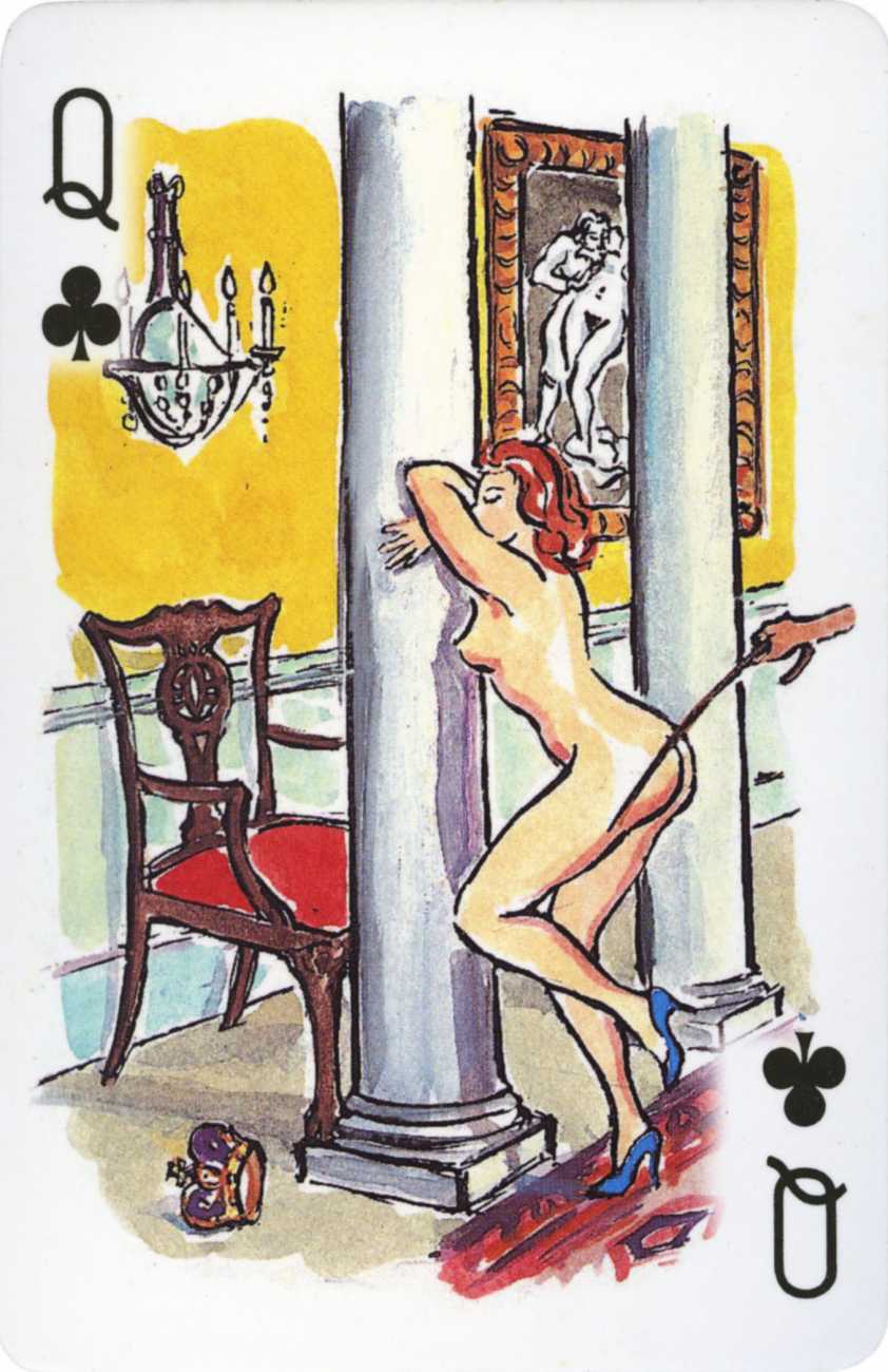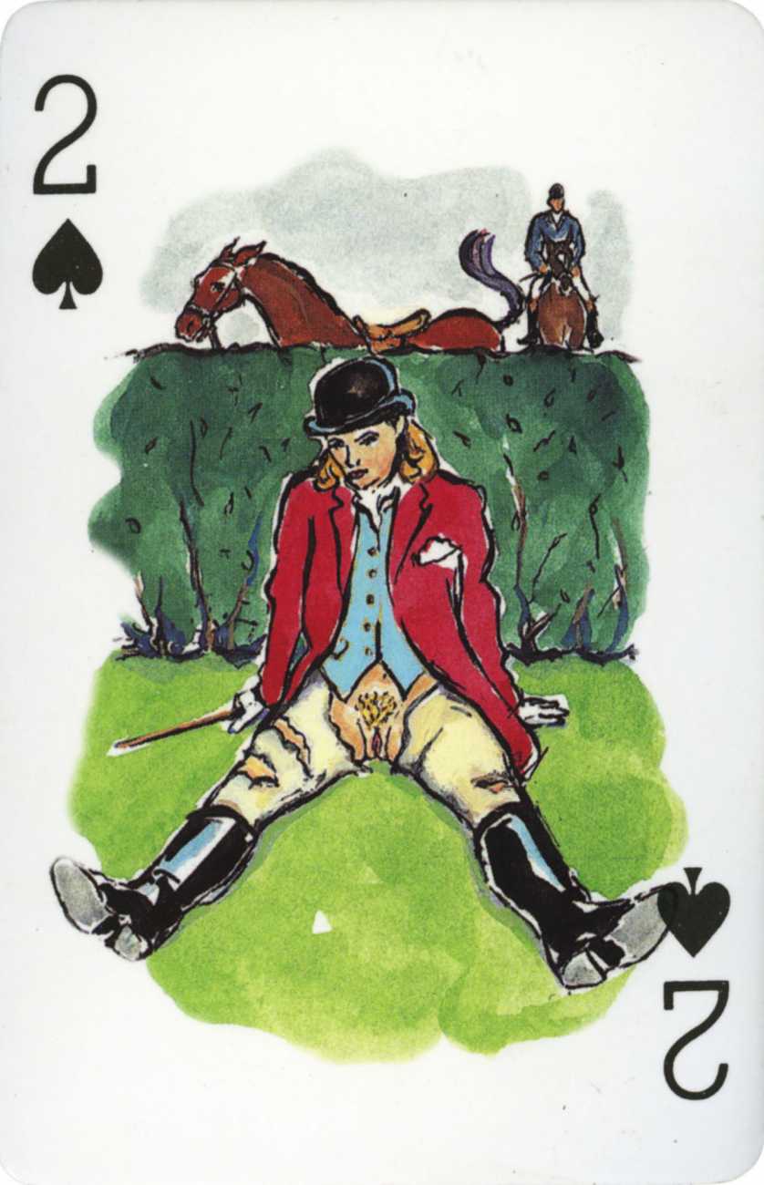 A Wicked Pack was the Erotic Print Society’s second offering of erotic playing cards, following Monica Guevara’s Black Box cards of two years earlier, which you can see here. The sports-themed paintings are not Sylvie Jones’ best, and the small format does not help; in addition the numbered cards from 2 to 10 repeat the same designs across all four suits, whether due to lack of time, budget or both we shall probably never know.