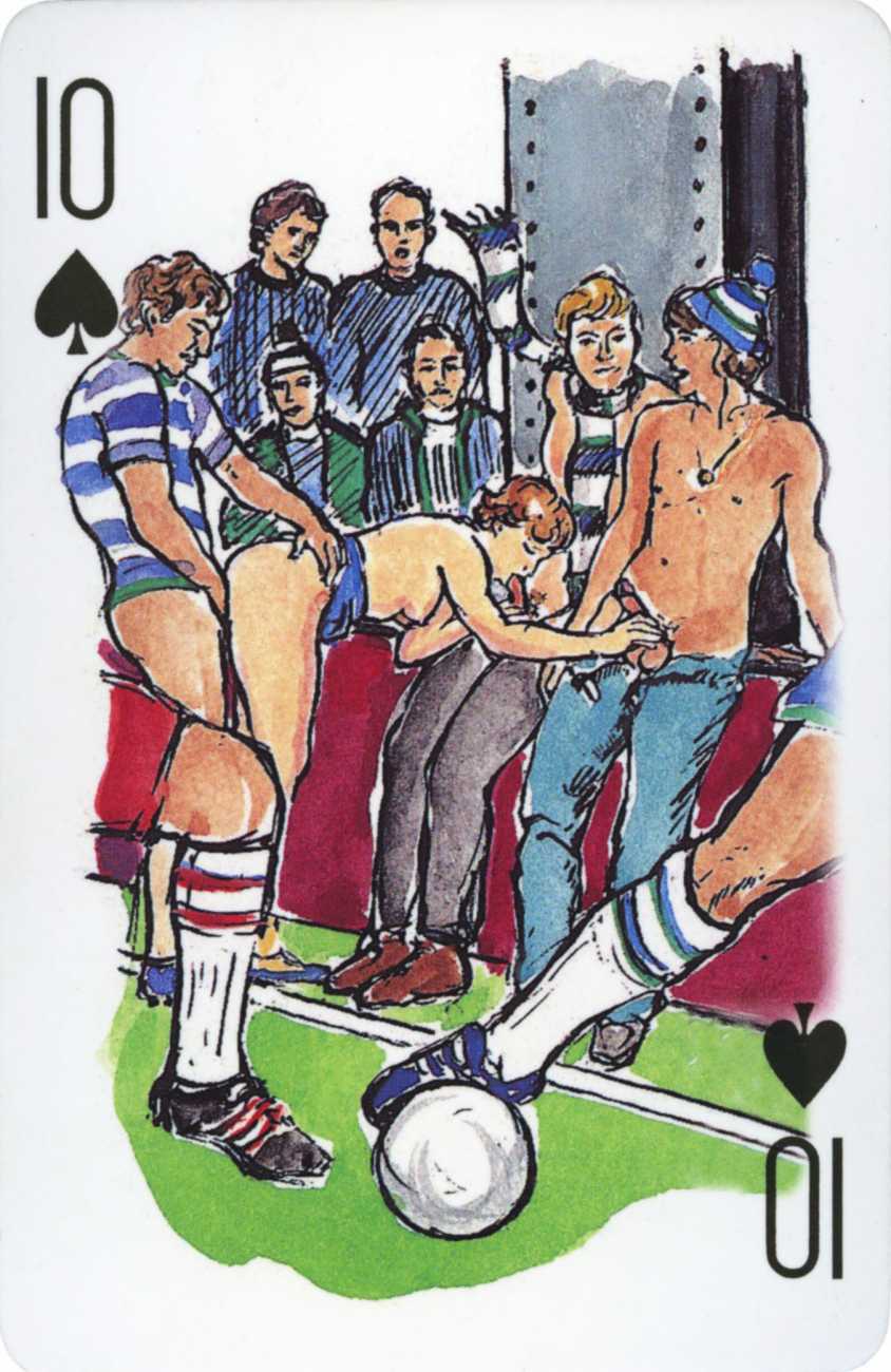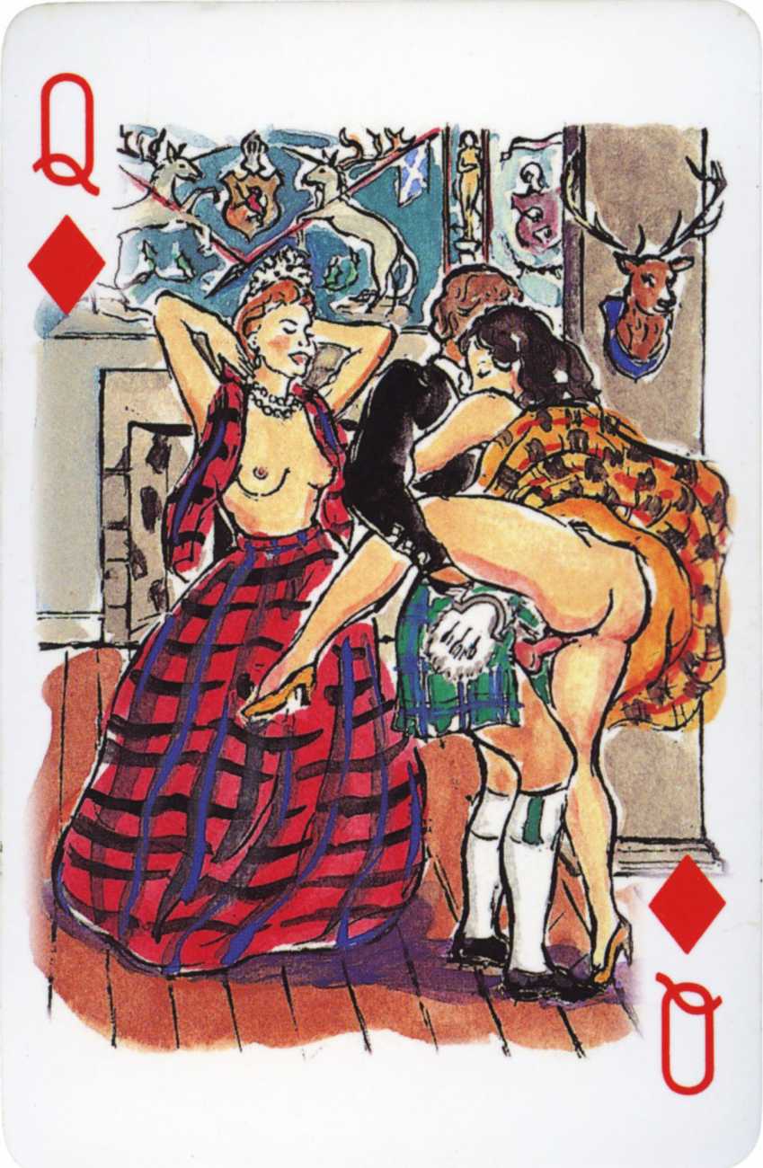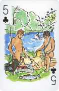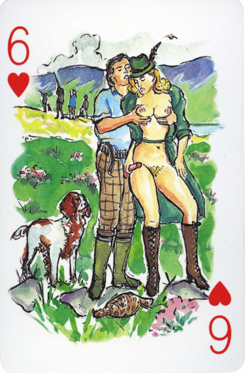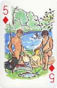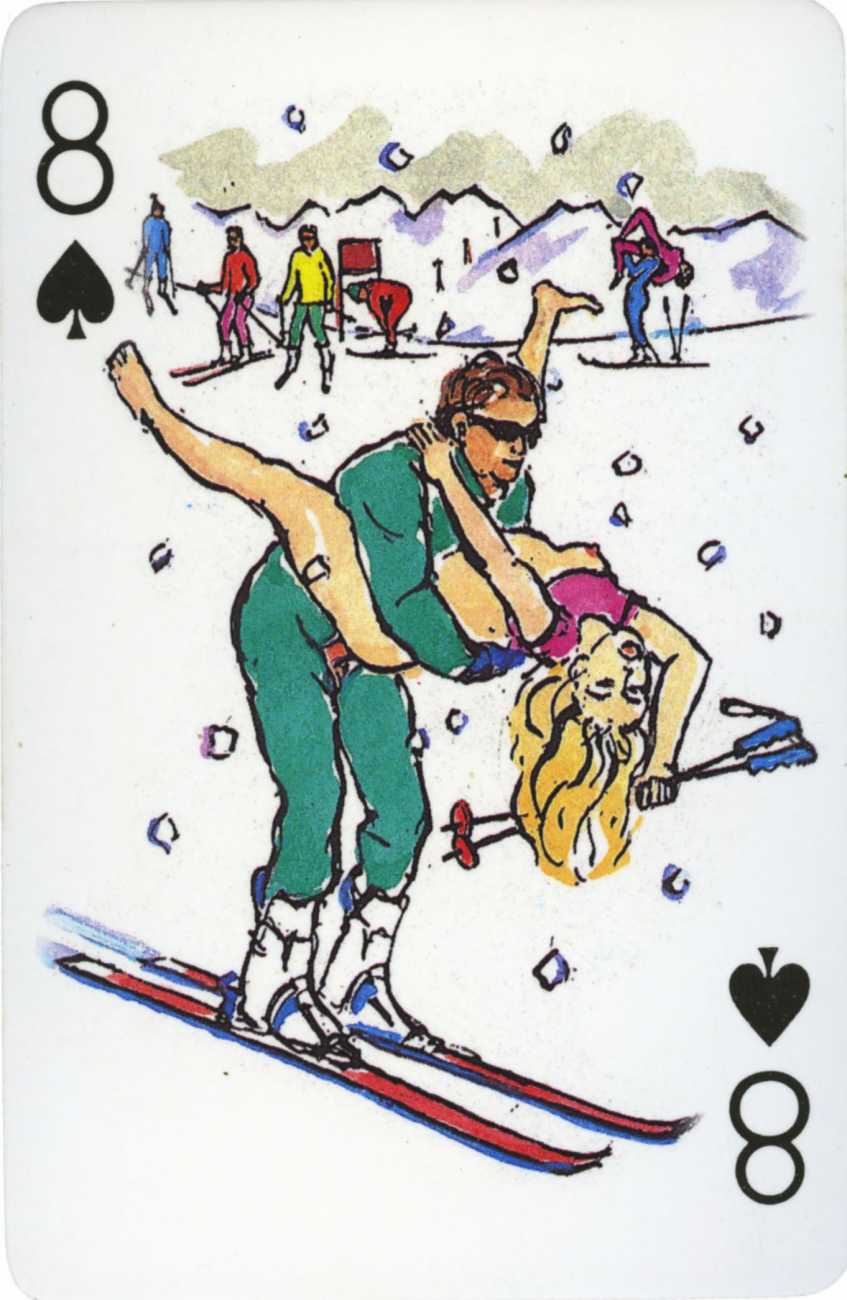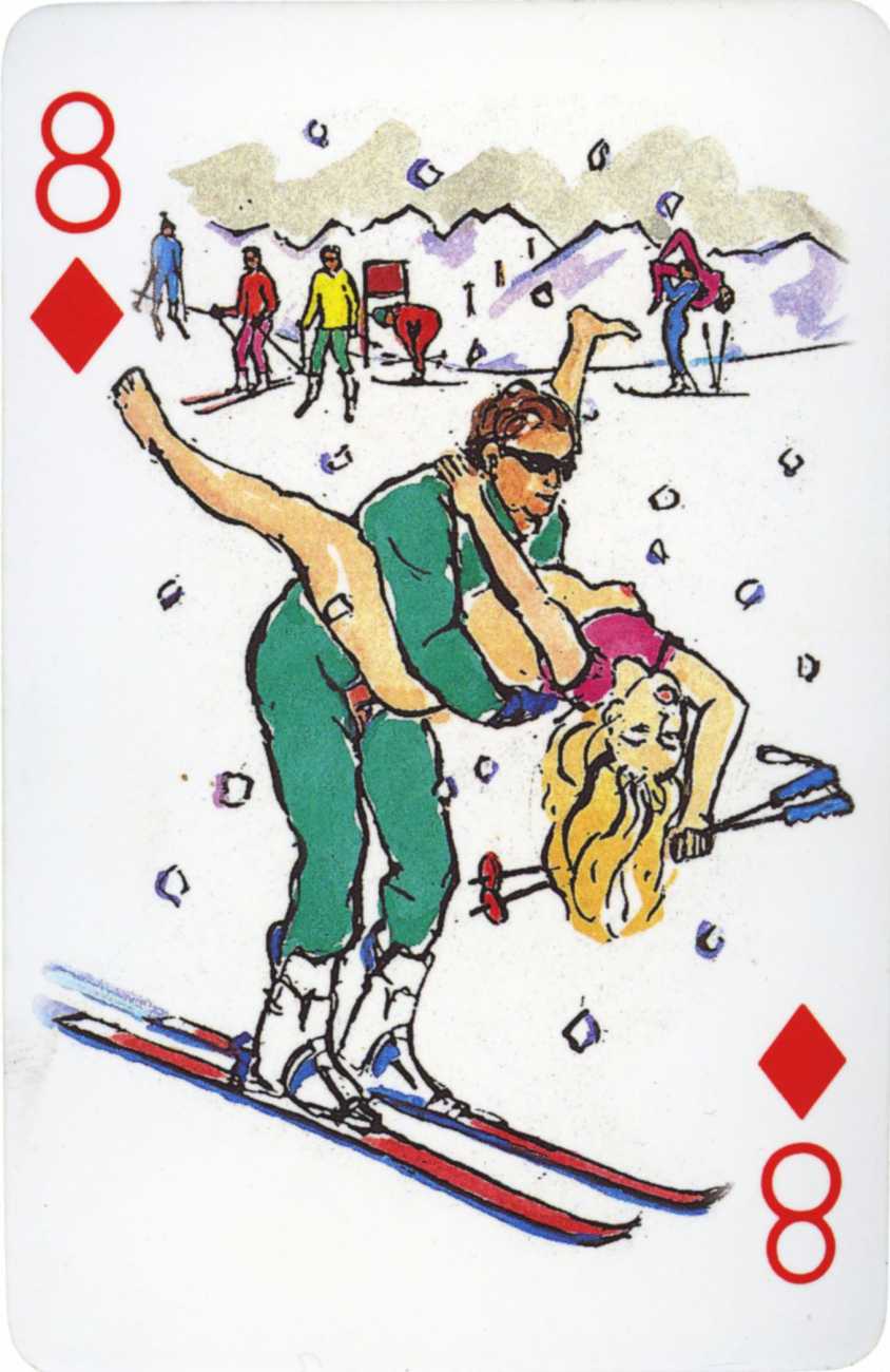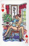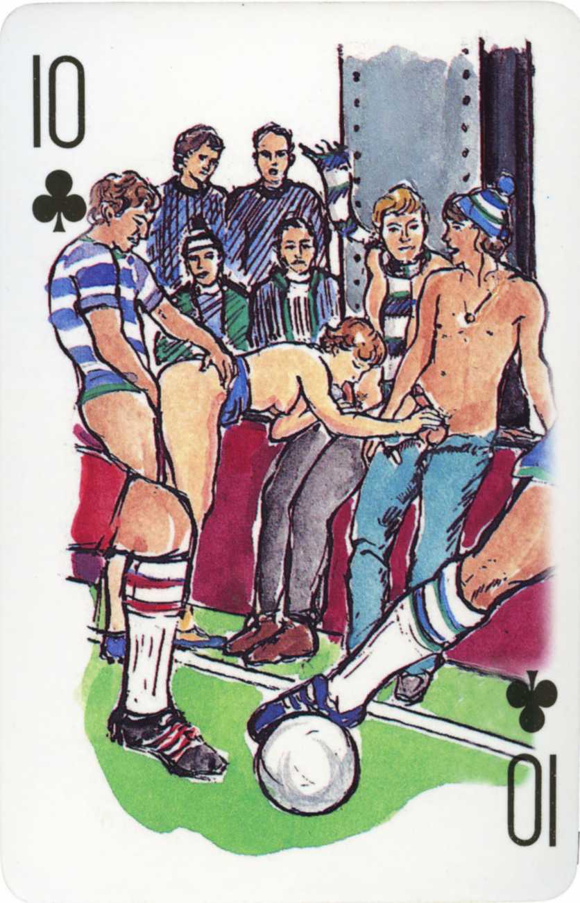 A Wicked Pack was the Erotic Print Society’s second offering of erotic playing cards, following Monica Guevara’s Black Box cards of two years earlier, which you can see here. The sports-themed paintings are not Sylvie Jones’ best, and the small format does not help; in addition the numbered cards from 2 to 10 repeat the same designs across all four suits, whether due to lack of time, budget or both we shall probably never know.