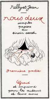 When the two illustrated volumes of Nous deux, a fictional amorous correspondence between student Nelly and her teacher Jean, appeared in 1929, they included no indication as to who had written it, who had illustrated it, and where and when it had been published – just a tantalising line saying ‘Gravé et imprimé pour les auteurs et leurs amis’ (created and printed for the authors and their friends). This was a time when short-run illustrated erotica was in high demand and many small-time entrepreneurs were all too ready to supply the market, but Nous deux was different from most, well-written and amusing, beautifully illustrated, and printed to a high standard. As Jean-Pierre Dutel, the cataloguer par excellence of erotic literature of the period, writes: ‘This edition was the most beautiful of the clandestine publications of the period, highly priced and highly prized.’
