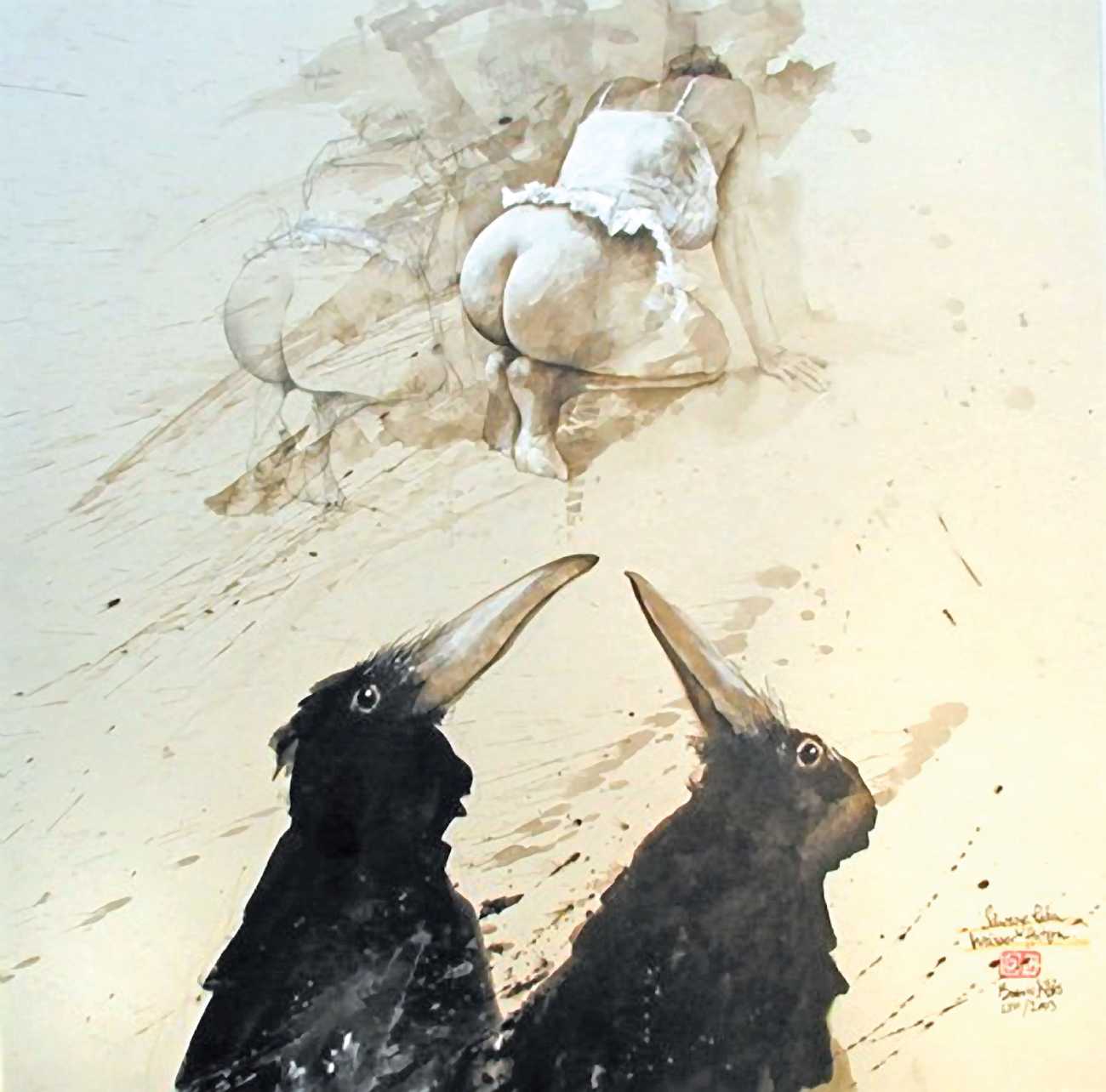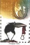 Ravens are one of Bodo Klös’s leitmotifs, non-human entities who stand slightly apart from the strangeness of their human counterparts and wonder. In 1997 Edition Noir (run by Bodo’s wife Birgit) published Der Rabe (The Raven), a limited-edition picture book with 140 colour illustrations and a real raven feather inset into the title page.