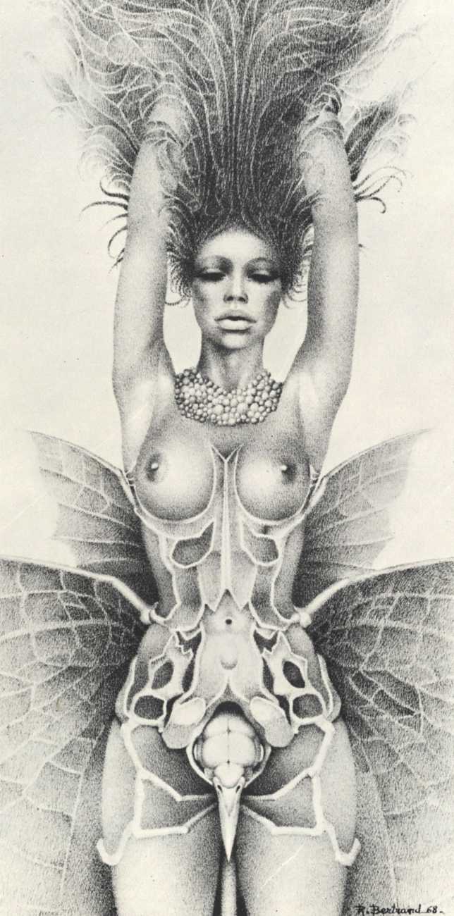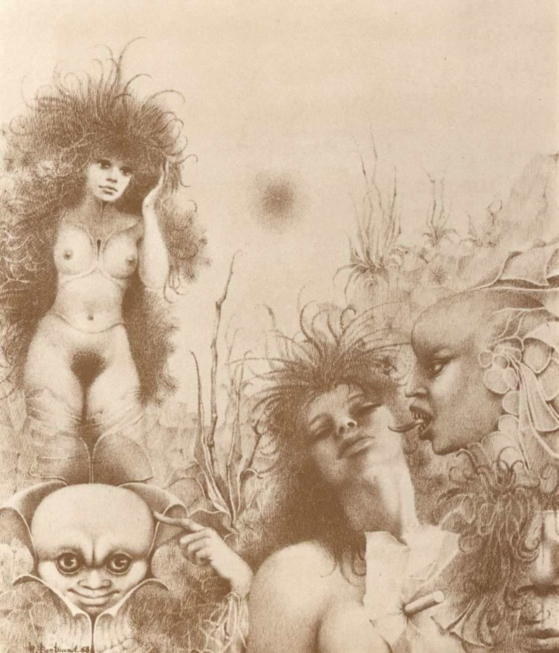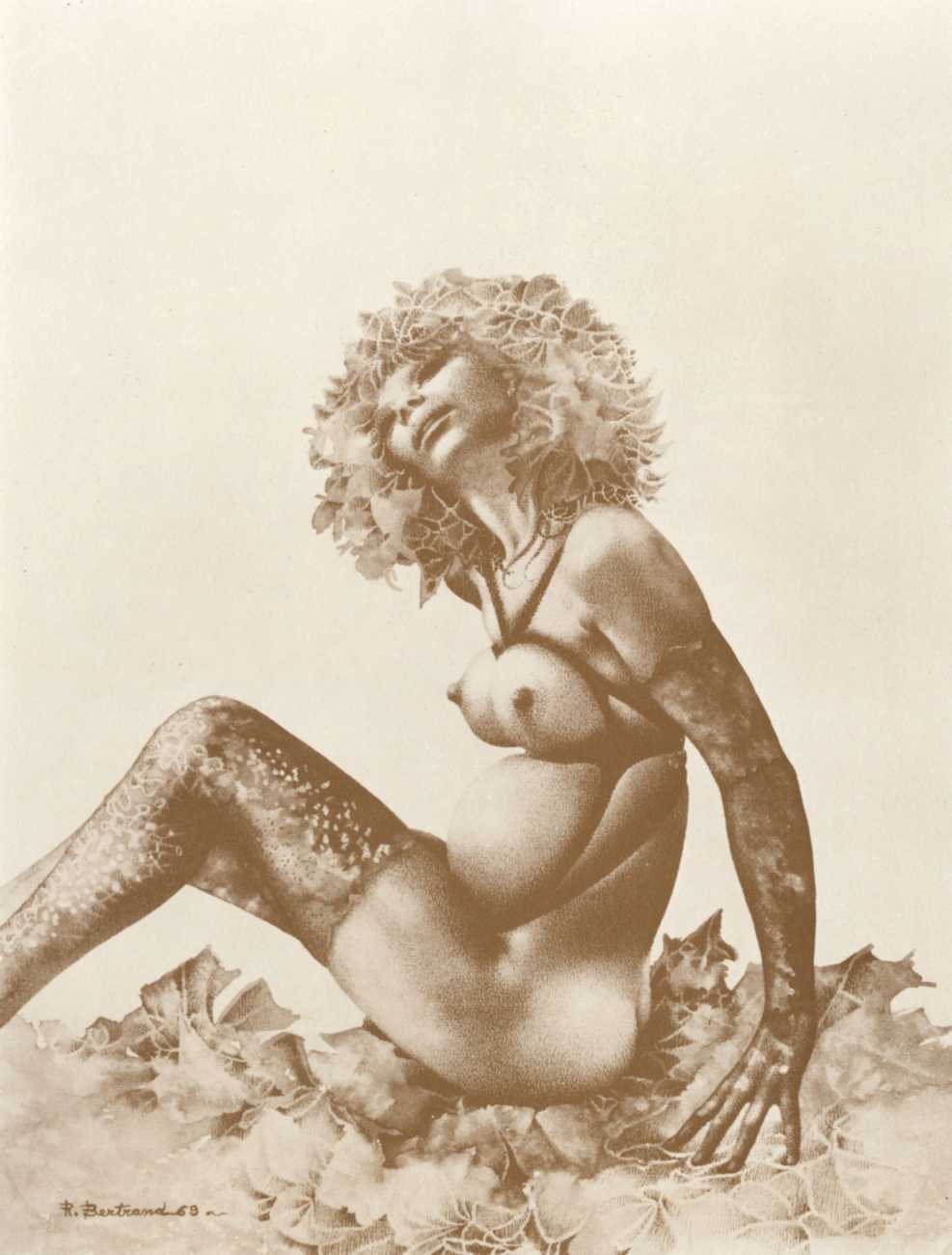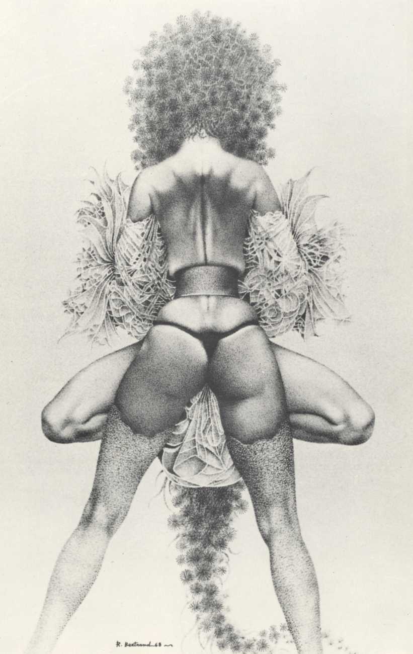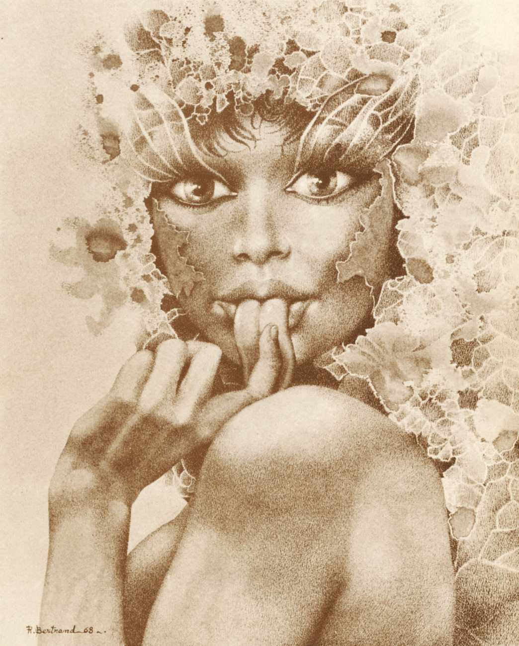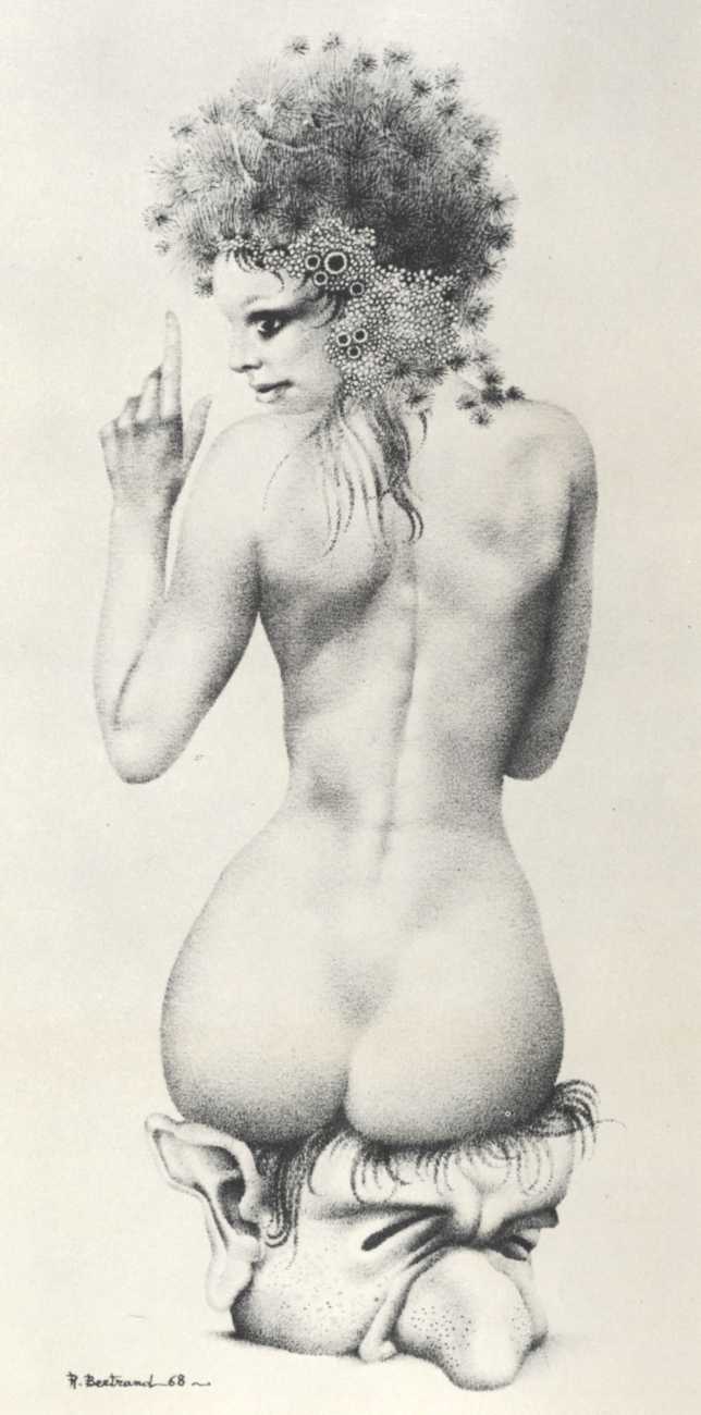 The first of the two Bertrand portfolios produced by Eric Losfeld contains six paintings and 102 drawings, some of which are reproduced in sepia. This collection of his work allows us to experience his psychedelic fantasies in their full range and context. This was the time of Timothy Leary, LSD, the Oz trial, and the musical Hair, when Bertrand-style imagery was the must-have artistic outpouring of hippydom and the alternative dropout lifestyle. There was little of the later analysis of gender and race stereotypes, so it seemed perfectly acceptable to sexualise young women with frizzy Afro hairstyles.