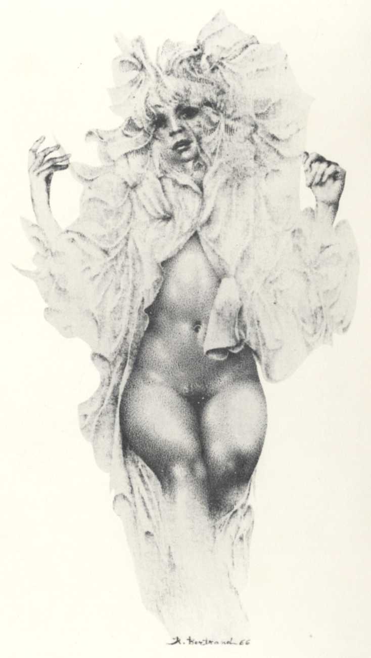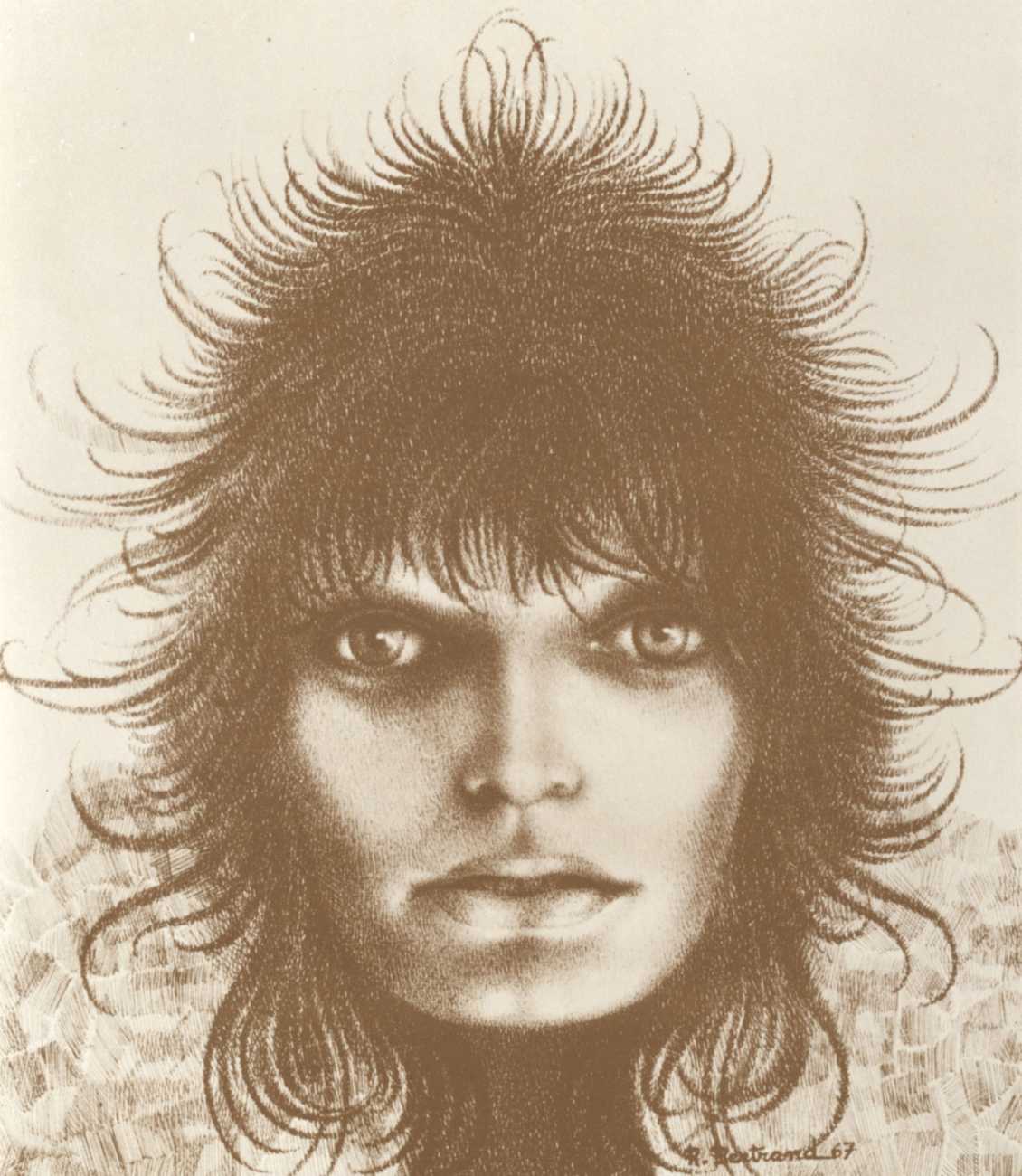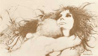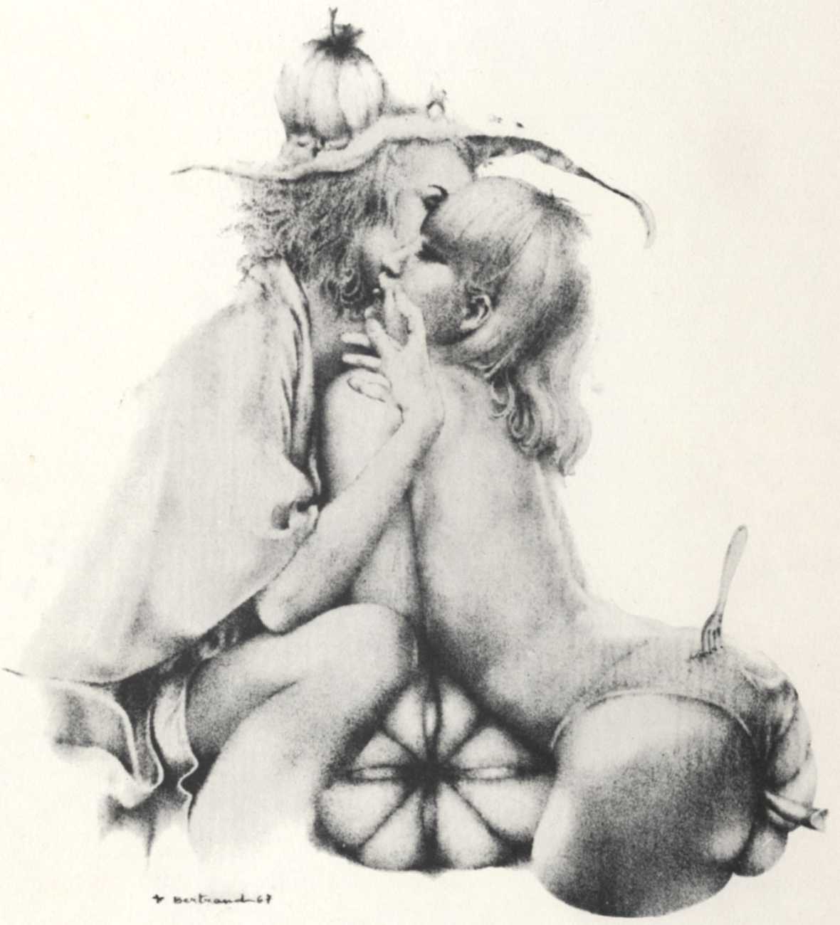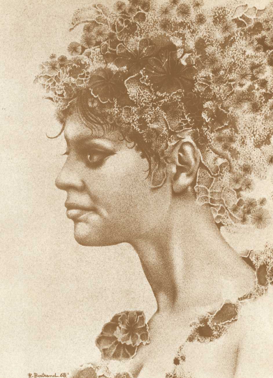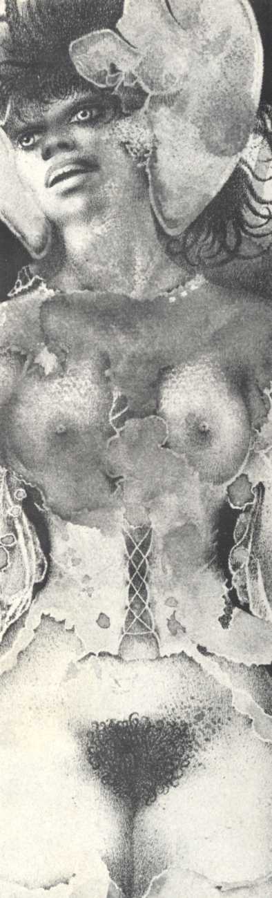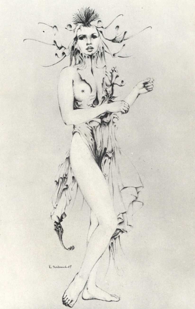 The first of the two Bertrand portfolios produced by Eric Losfeld contains six paintings and 102 drawings, some of which are reproduced in sepia. This collection of his work allows us to experience his psychedelic fantasies in their full range and context. This was the time of Timothy Leary, LSD, the Oz trial, and the musical Hair, when Bertrand-style imagery was the must-have artistic outpouring of hippydom and the alternative dropout lifestyle. There was little of the later analysis of gender and race stereotypes, so it seemed perfectly acceptable to sexualise young women with frizzy Afro hairstyles.