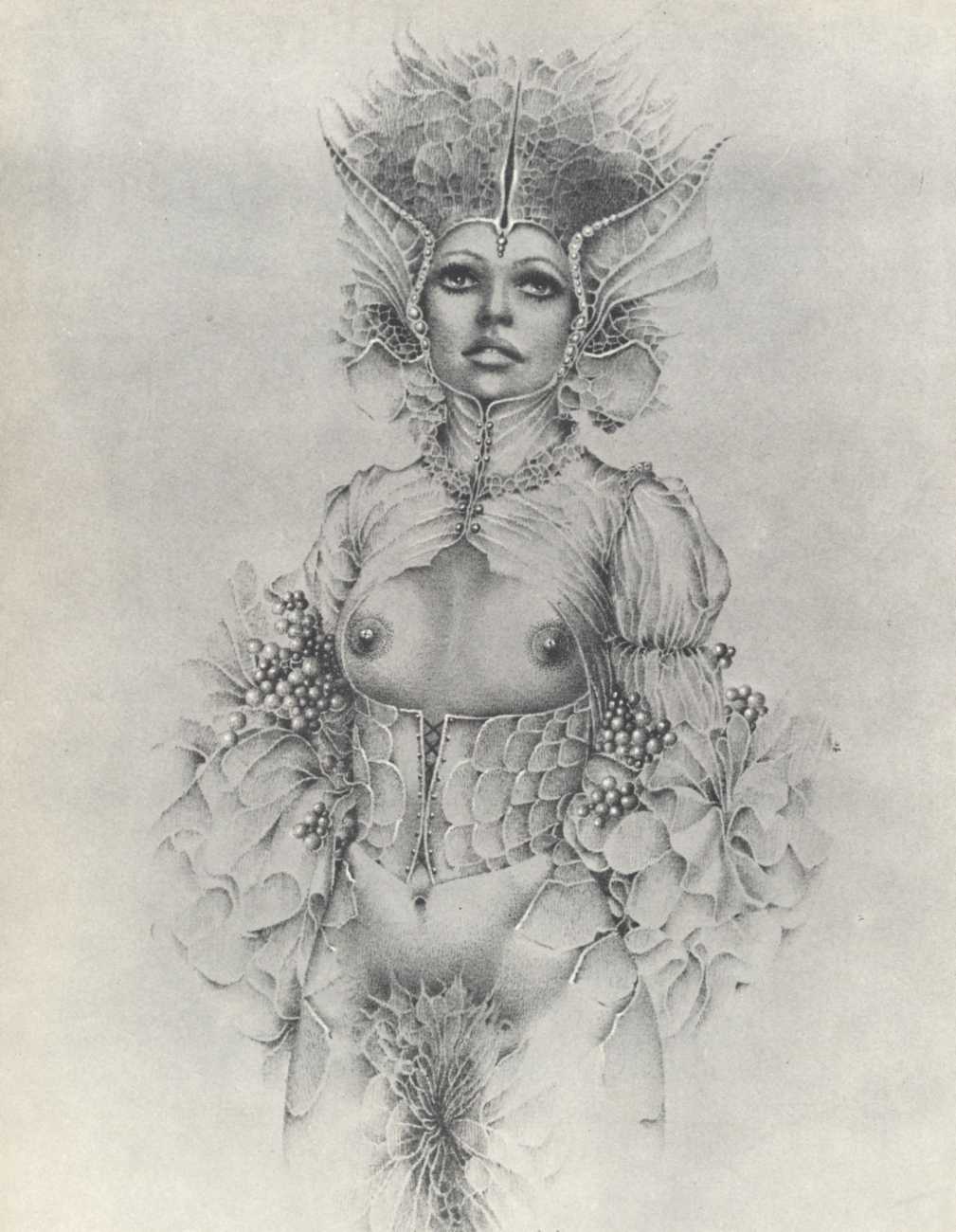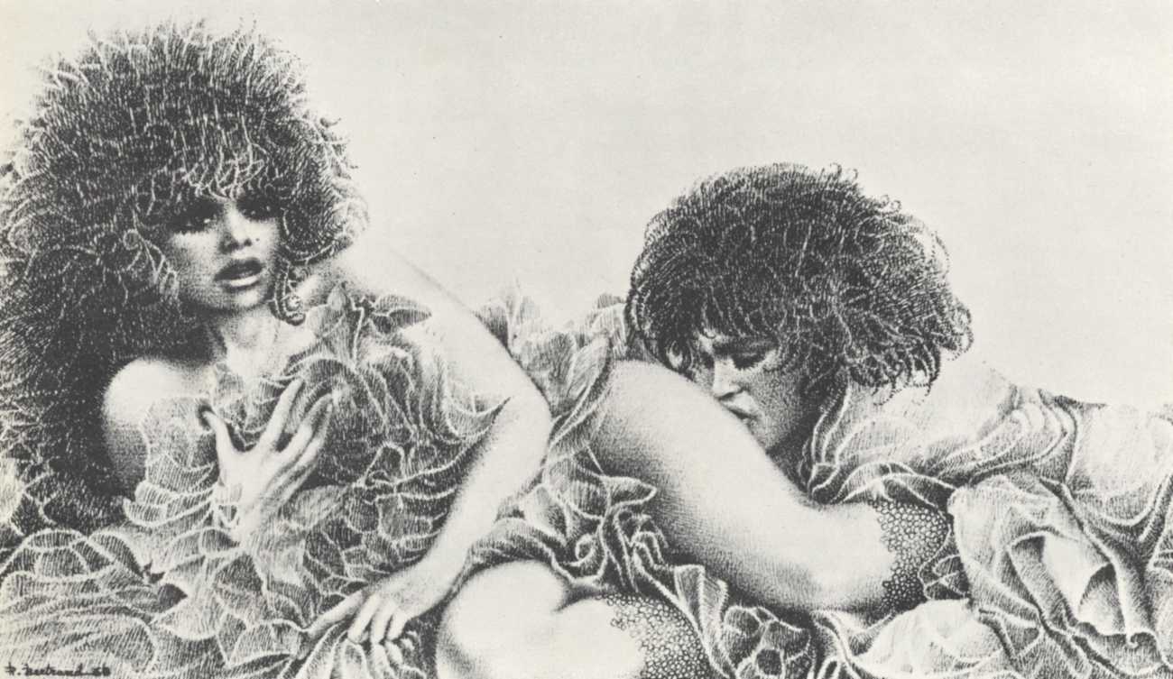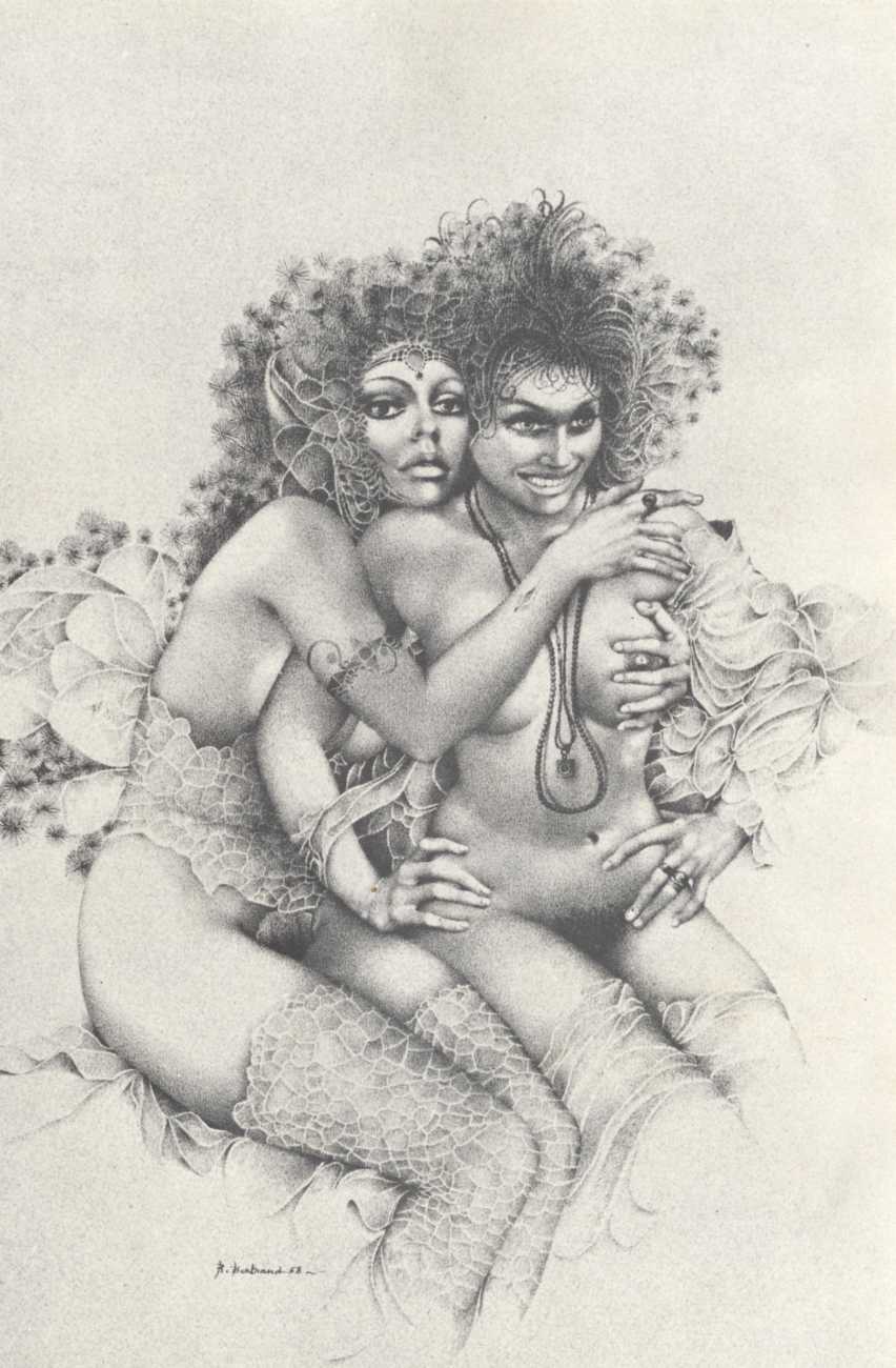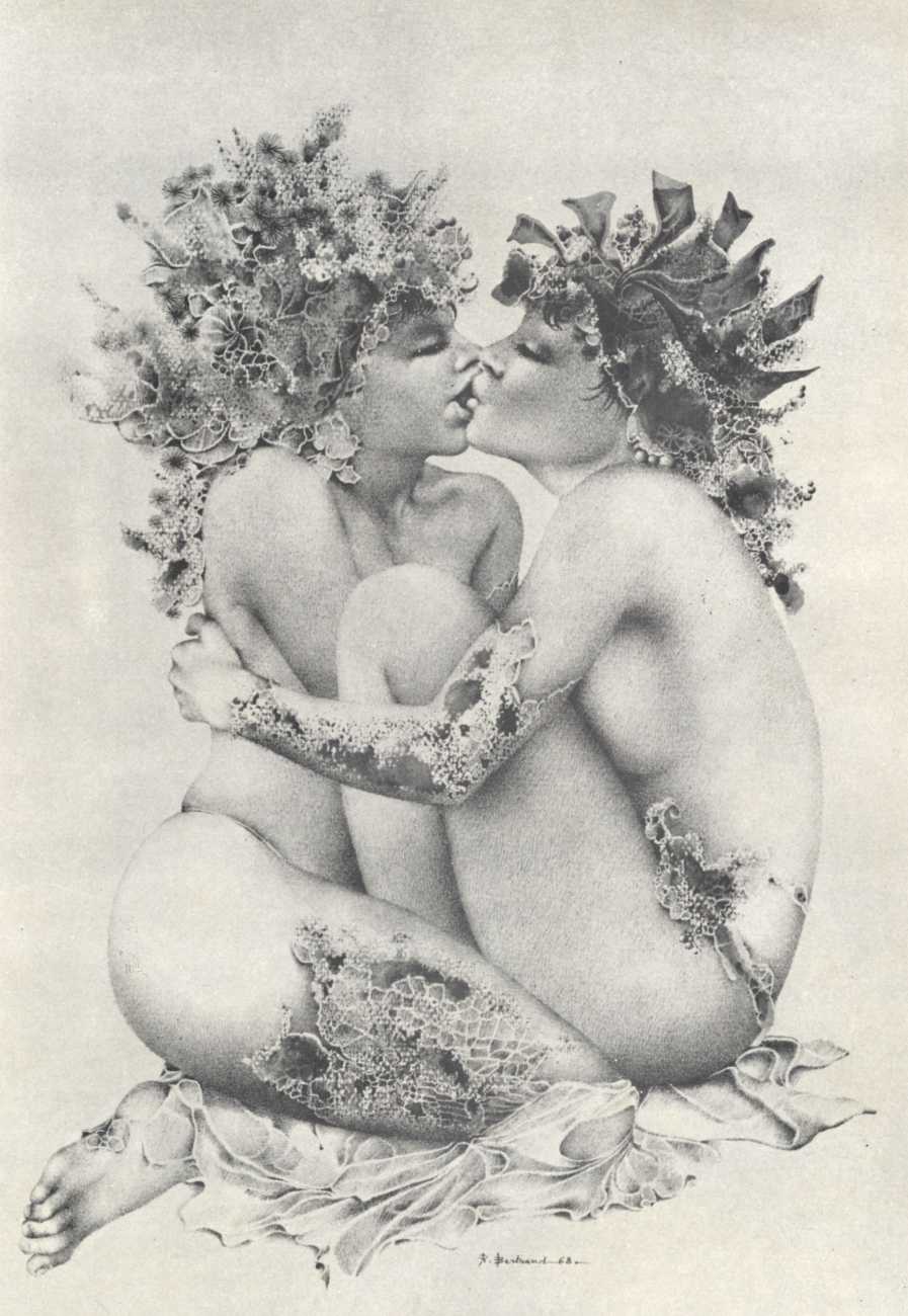In the long, florid introduction, Arsan writes poetically of the many lesbian encounters imagined by Bertrand: ‘But what exactly have they come to teach us? It will surely help us to discover what it is if we attentively contemplate their breasts, more supple and resilient than any earthly flesh, their symmetrical nipples starred by infinitesimal cross-hatches and surrounded, without a single break in their botanical eyelashes, by little involucres suggestive of sensual pleasure that are better ordered and more precise than those our imperfect species is capable of.’