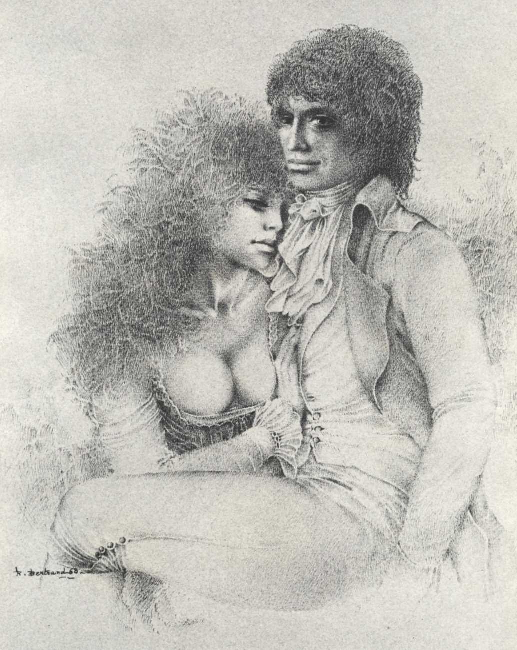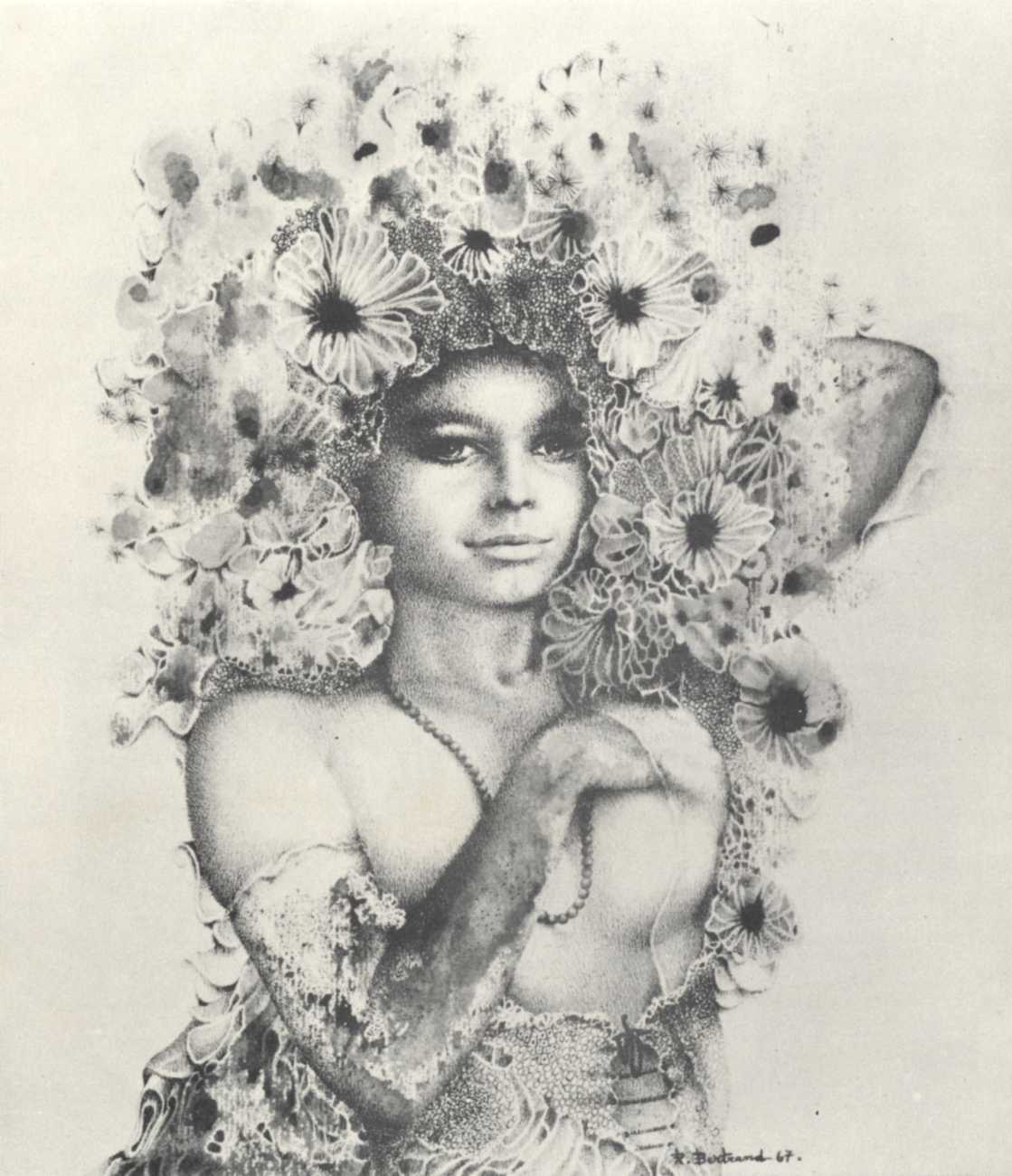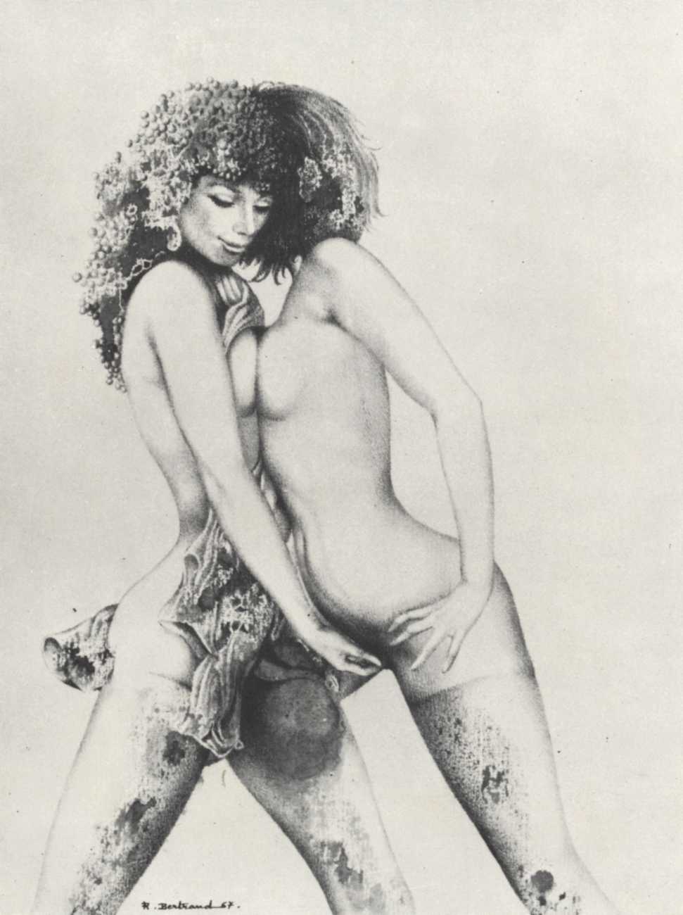 Dessins érotiques de Bertrand includes a tribute to Bertrand by the film director Raymond Borde, and an over-the-top introduction by Emanuelle Arsan, at the time as well-known an alternative character on the artistic scene as Bertrand. Arsan (1932–2005) was the nom de plume of Marayat Rollet-Andriane, formerly Marayat Krasaesin or Bibidh, a French novelist of Thai origin, best known for the novel featuring the fictional character Emmanuelle, a woman who sets out on a voyage of sexual self-discovery.