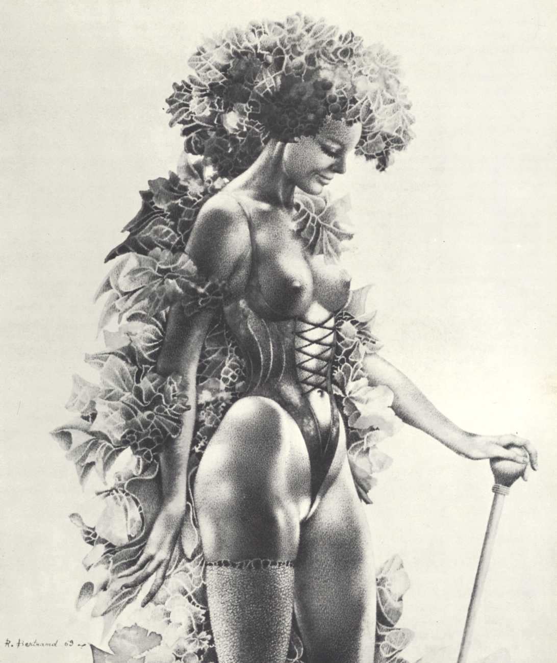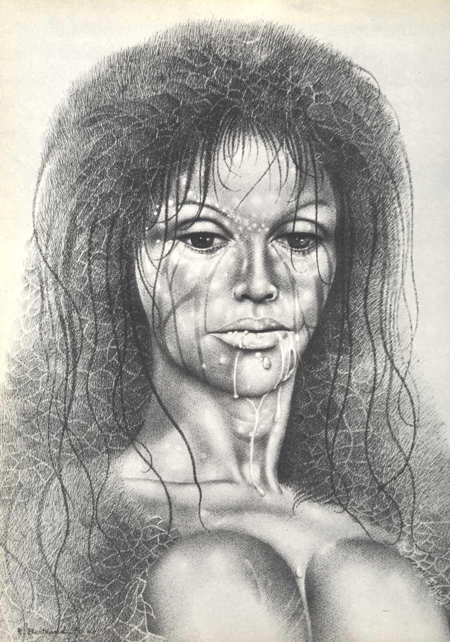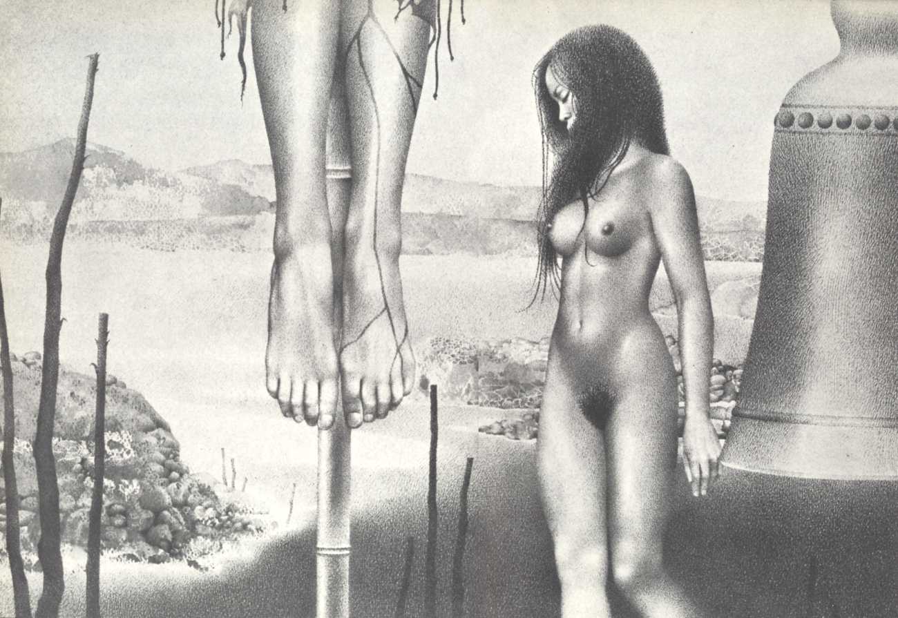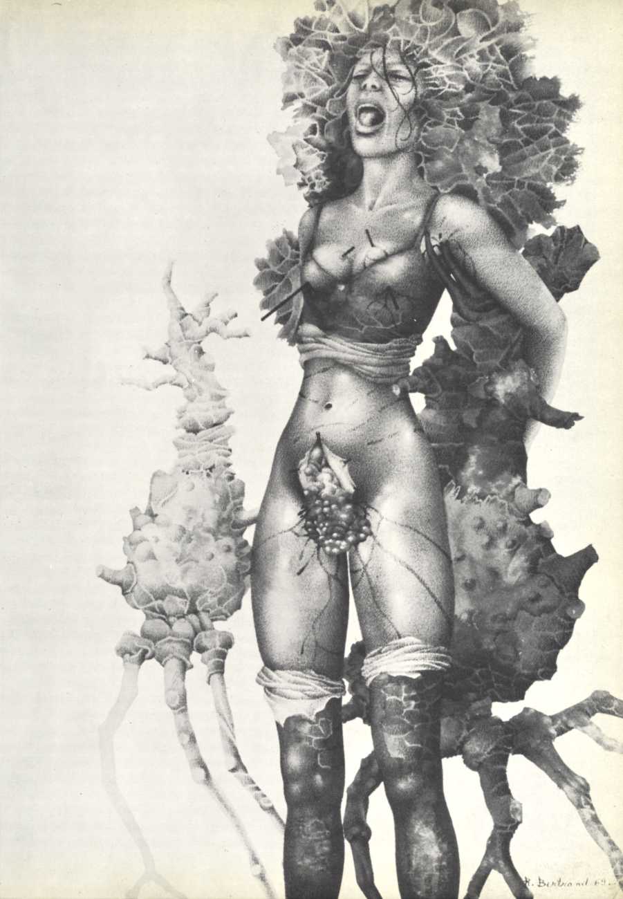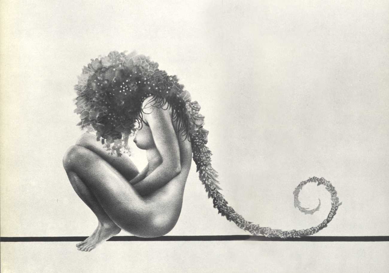 The ostentatious introduction to this second collection is by the Francophone Belgian poet, novelist, essayist and literary critic Hubert Loescher, writing under the pseudonym he often used of Hubert Juin. Its overblown style matches the artwork perfectly: ‘In the hamlet of sex we participate in peasant nuptuals, and fairs with many a young virgin. The evening brings slow caresses to the festivities. The cosy village nestles in the hips of a young woman who stretches languidly between us and the sea. Her hair is the distant forest, and the hills her breasts behind which the sun sets. Now sleeping, her back has the texture of the forest, and red berries bejewel her mouth and lips.’