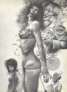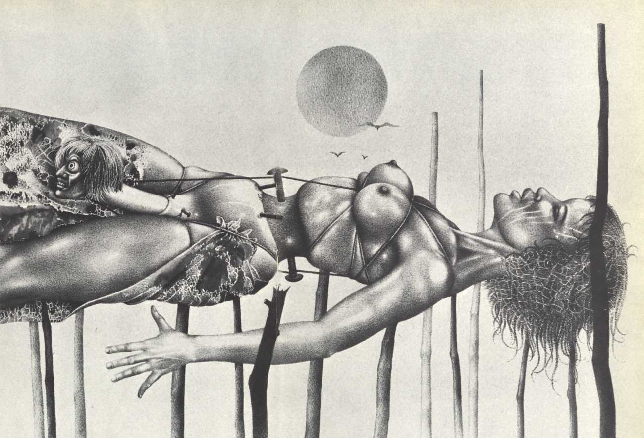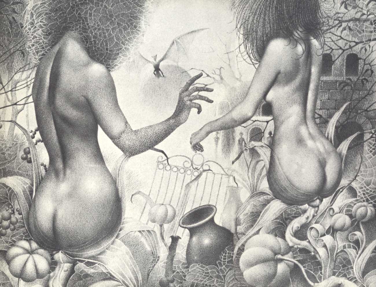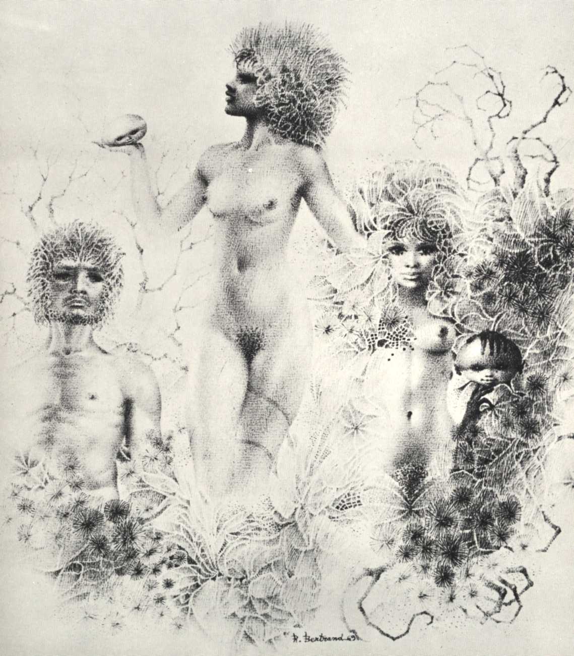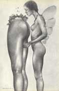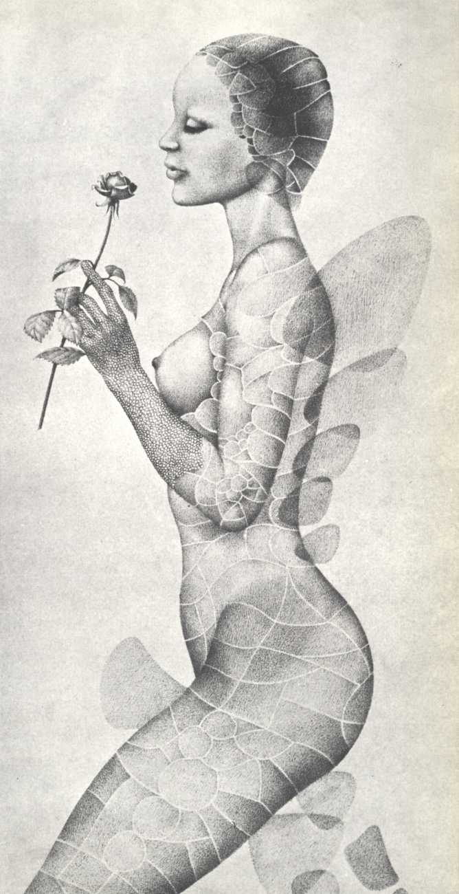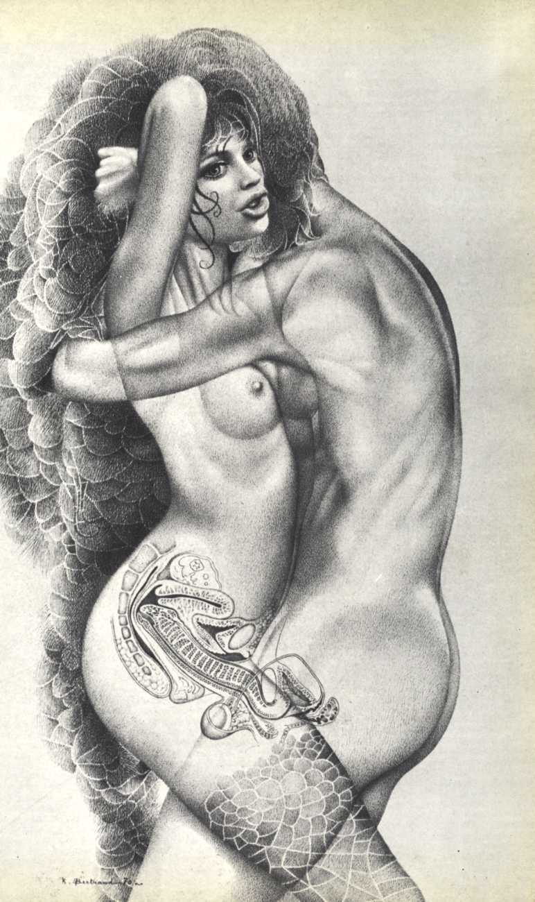 The ostentatious introduction to this second collection is by the Francophone Belgian poet, novelist, essayist and literary critic Hubert Loescher, writing under the pseudonym he often used of Hubert Juin. Its overblown style matches the artwork perfectly: ‘In the hamlet of sex we participate in peasant nuptuals, and fairs with many a young virgin. The evening brings slow caresses to the festivities. The cosy village nestles in the hips of a young woman who stretches languidly between us and the sea. Her hair is the distant forest, and the hills her breasts behind which the sun sets. Now sleeping, her back has the texture of the forest, and red berries bejewel her mouth and lips.’